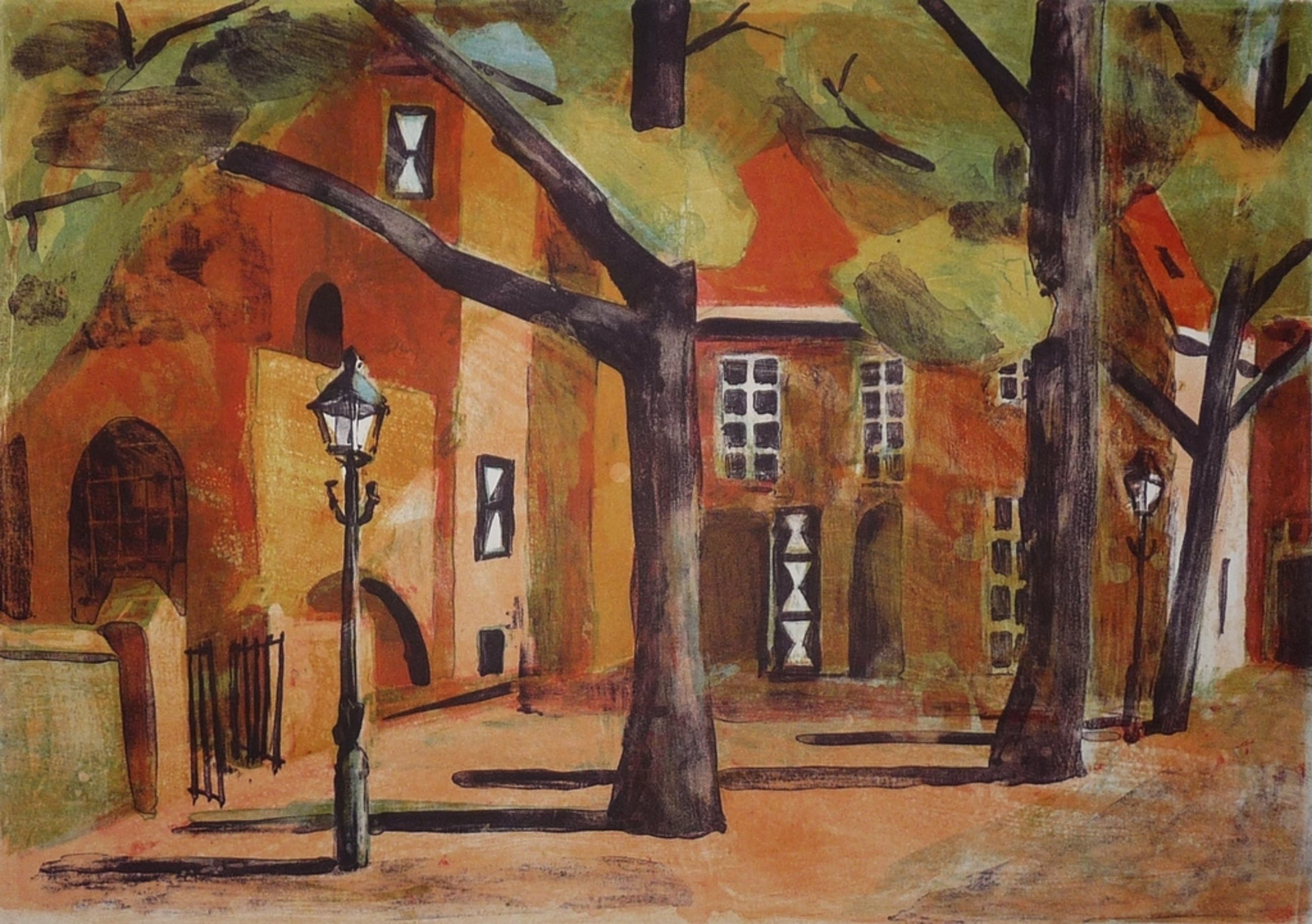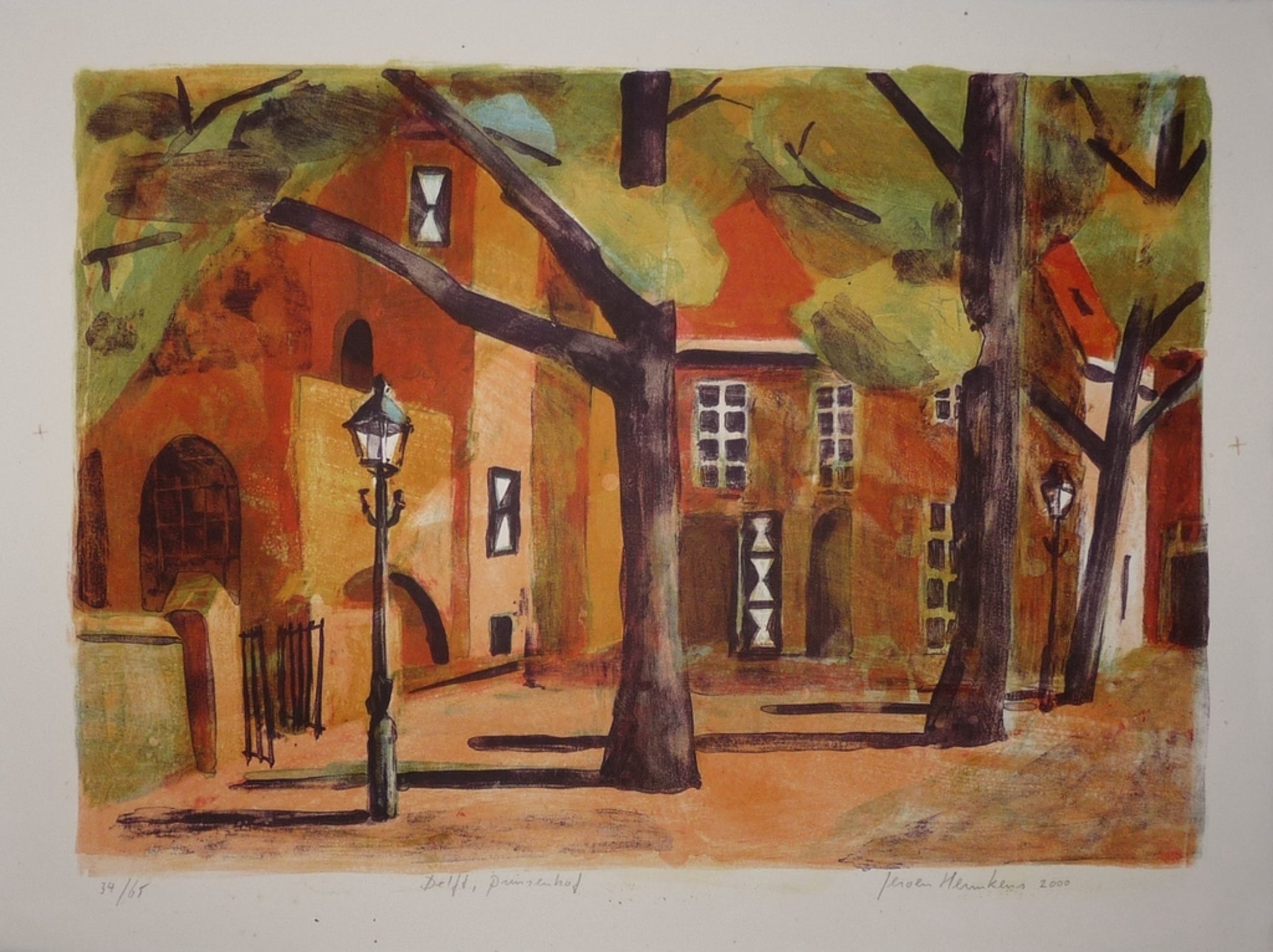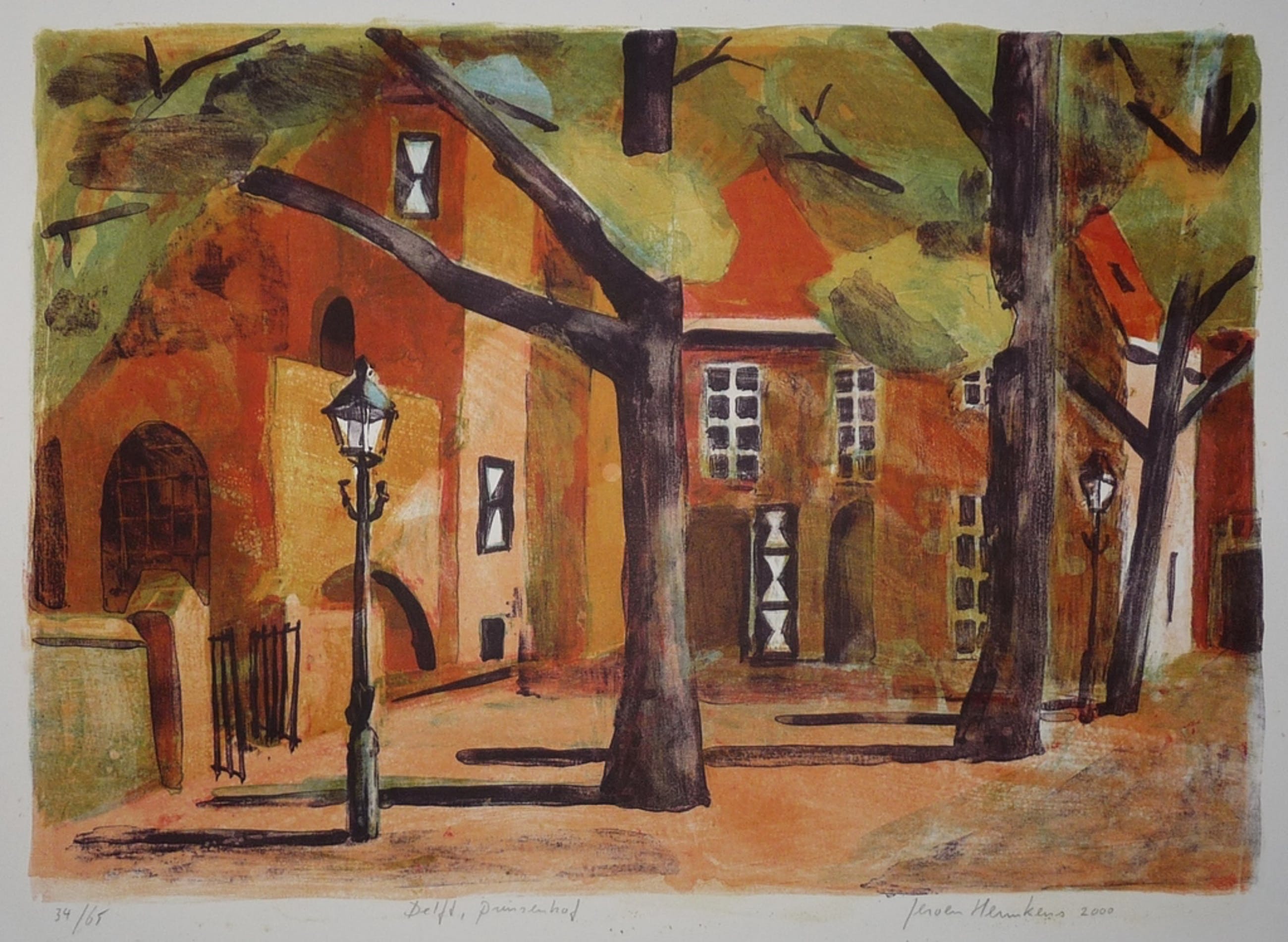 *Grote fraaie gesigneerde kleurenlitho van de bekende Nederlandse graficus Jeroen Hermkens met een afbeelding van het Prinsenhof te Delft.
