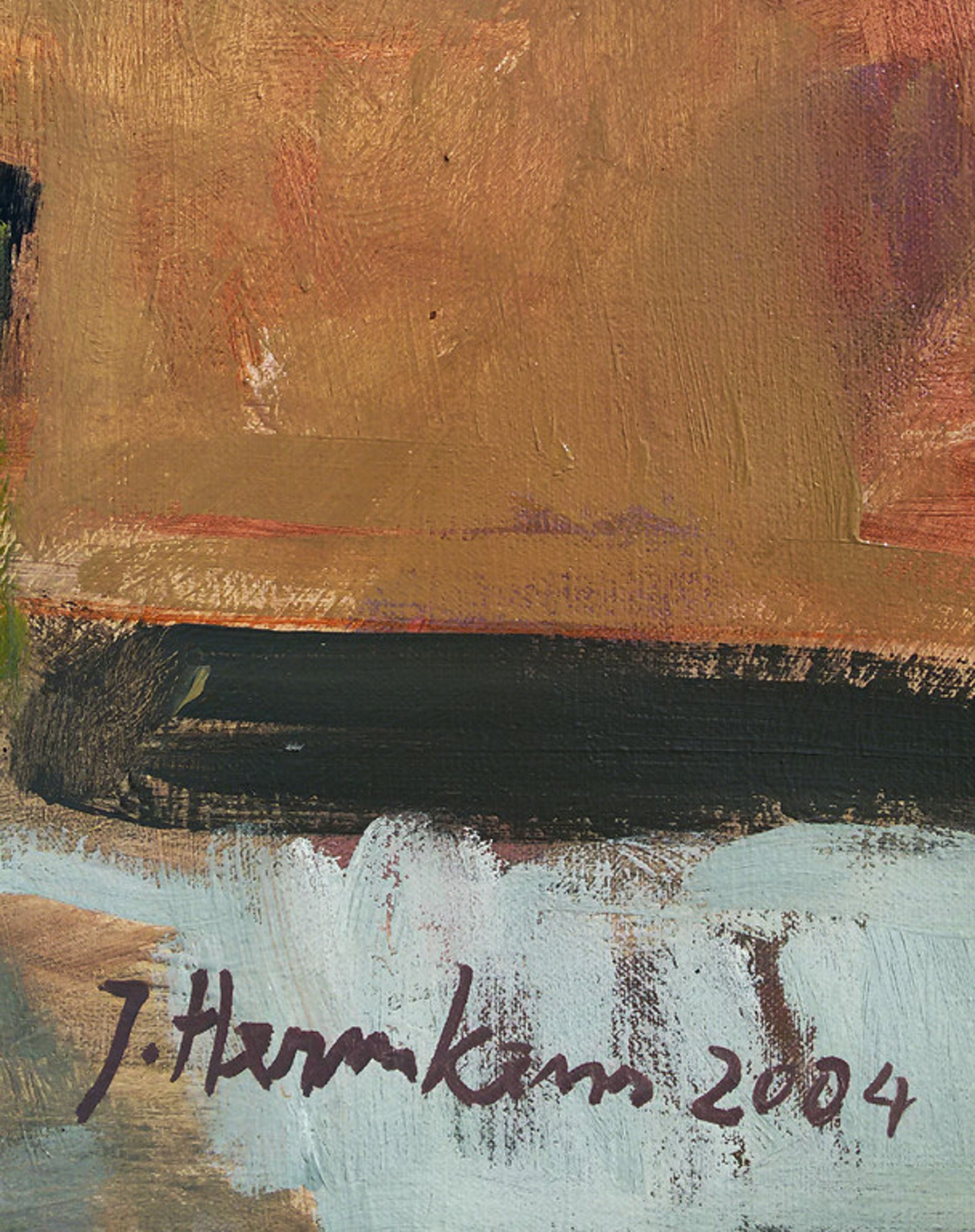 Alles in uitstekende conditie. Het enige wat er op het werk is aan te merken is dat er linksboven aan de rand (tweede raam van boven) wat verf ontbreekt. Orde van grootte van de schade is een paar vierkante centimeter, prima te repareren want oppervlakkig (zie ook de detailfoto). Opgehangen valt de schade niet op als je het niet weet, want de grondverf heeft dezelfde aardse kleur die elders op het doek ook voorkomt.