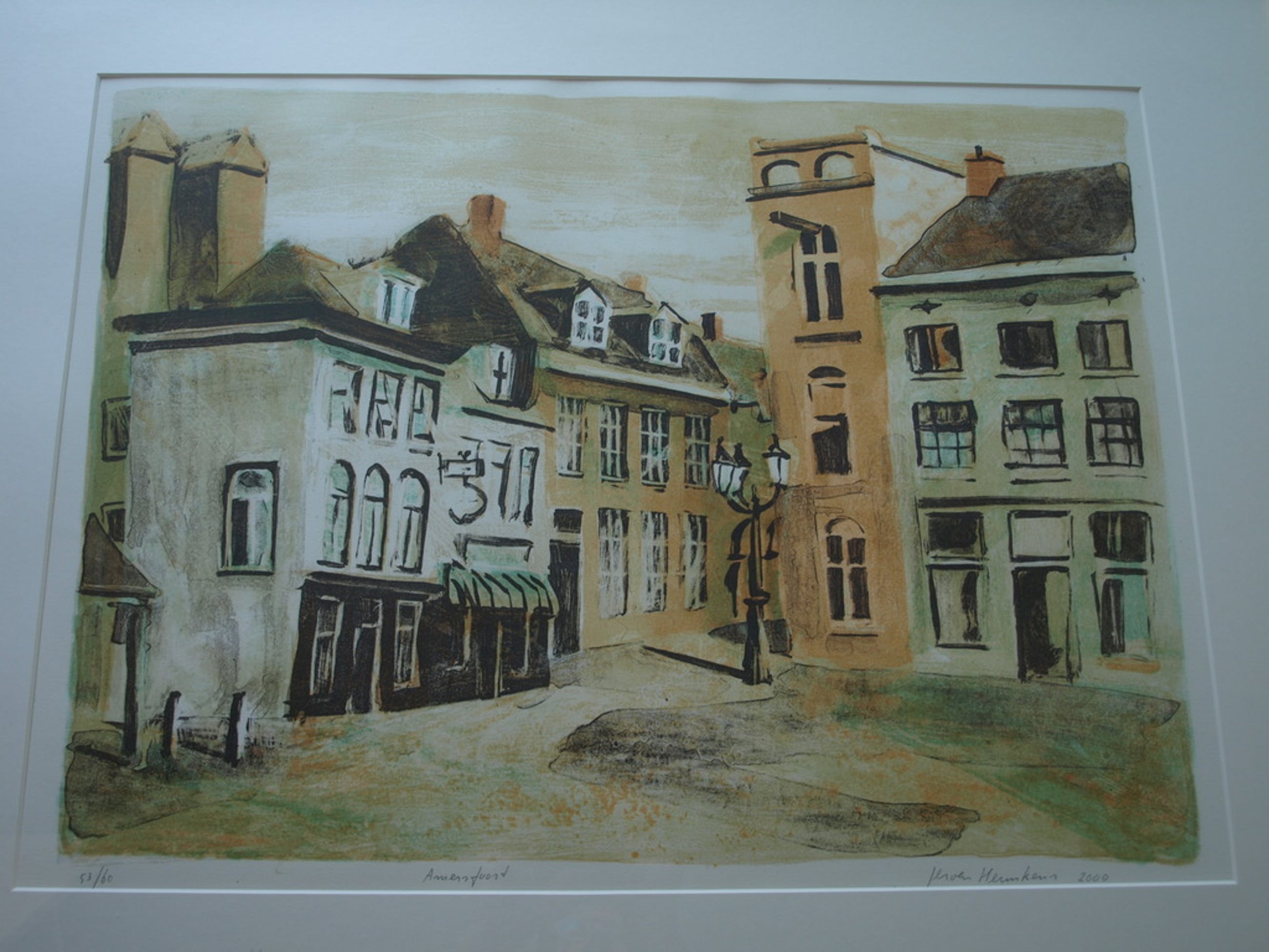 Een grote ingelijste litho van de Utrechtse kunstenaar Jeroen Hermkens uit 2000, met een voorstelling van een straatje in Amersfoort.