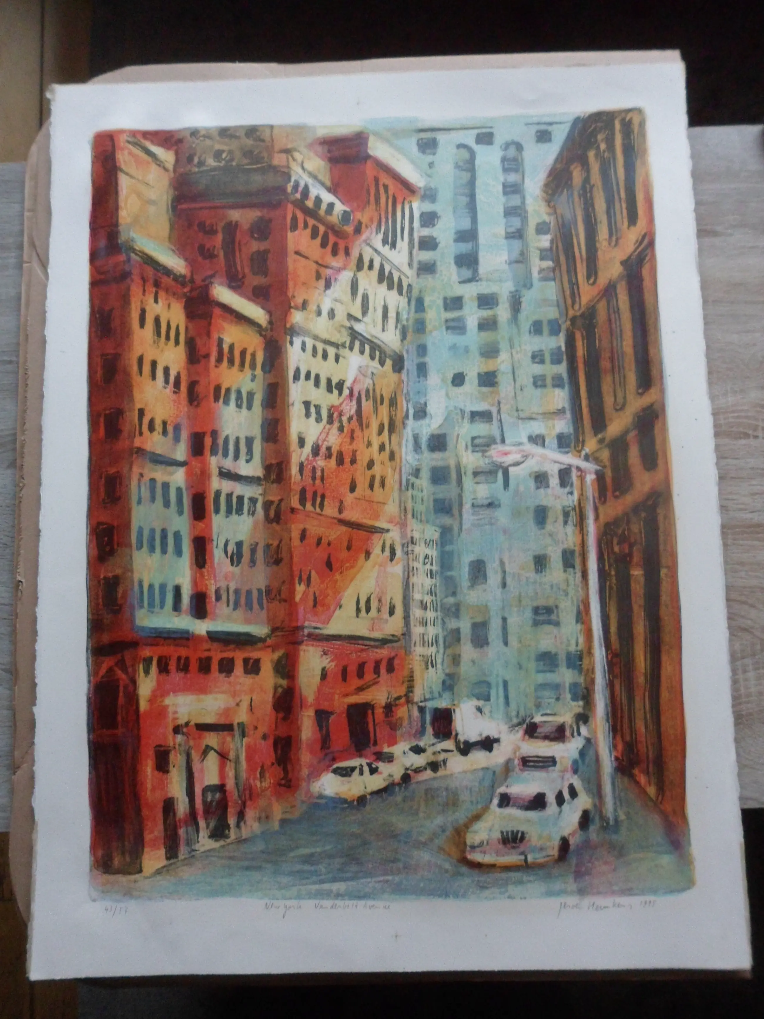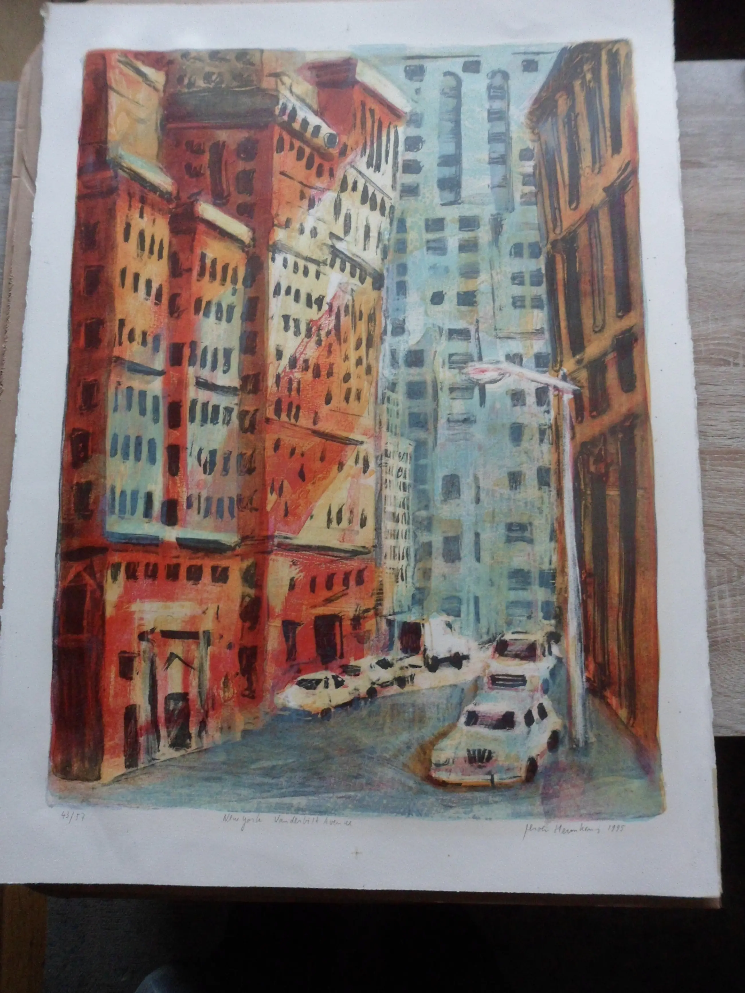 Litho van Jeroen Hermkens uit 1995 op geschept Arches papier, getiteld New York Vanderbilt Avenue, genummerd 43/57 en gesigneerd in potlood. In uitstekende staat. Afm. blad 57x76 cm.