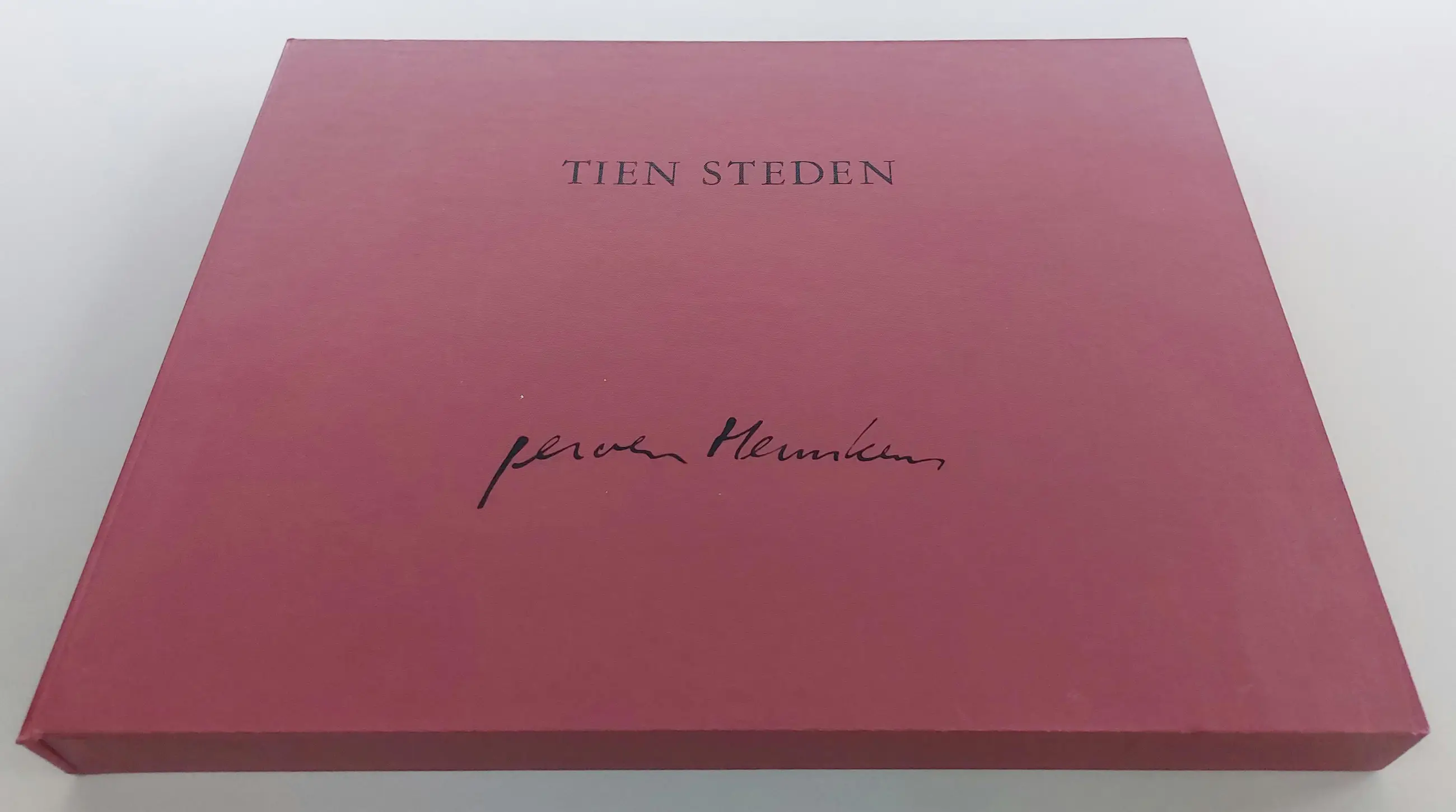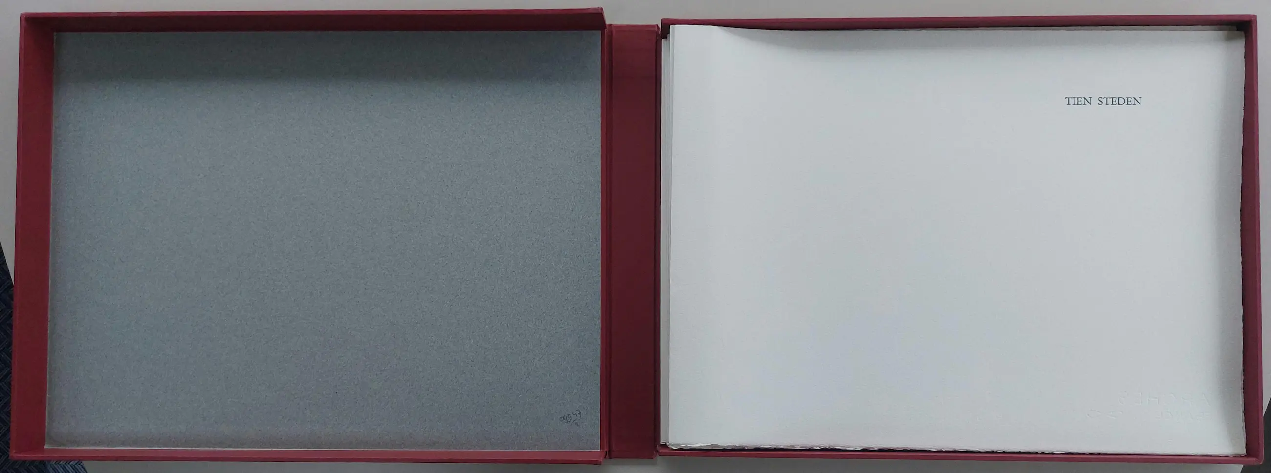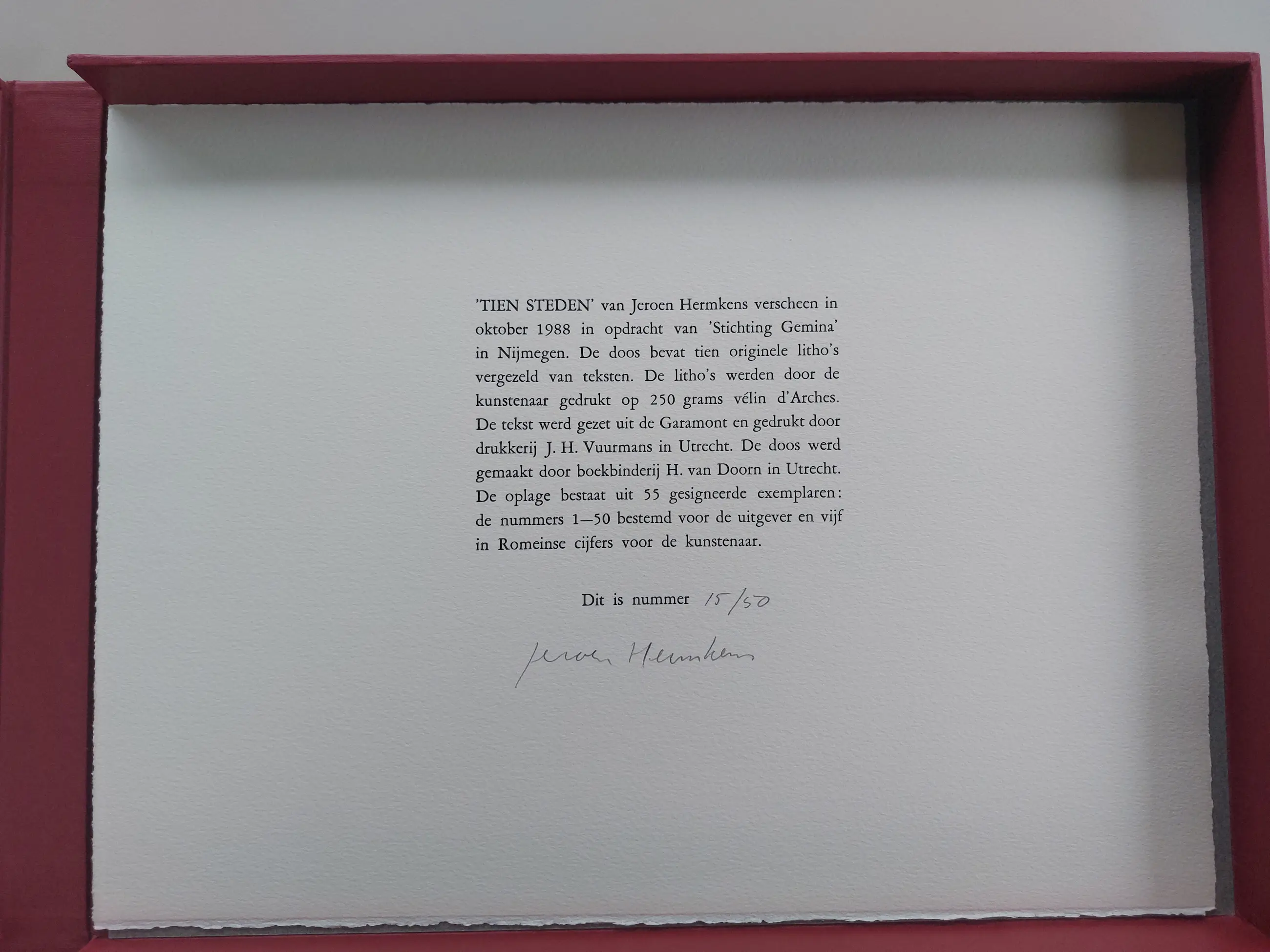 Mooie complete boxset van Jeroen Hermkens zoals uitgeggeven door stichting Gemina te Nijmegen. Bevat 10 gesigneerde zwartwit litho's van wereldsteden. De box als geheel is nogmaals gesigneerd. Titel = Tien steden: Rome, Berlijn, Leningrad, Milaan, Granada, Zürich, Parijs, Londen, Sevilla, New York.