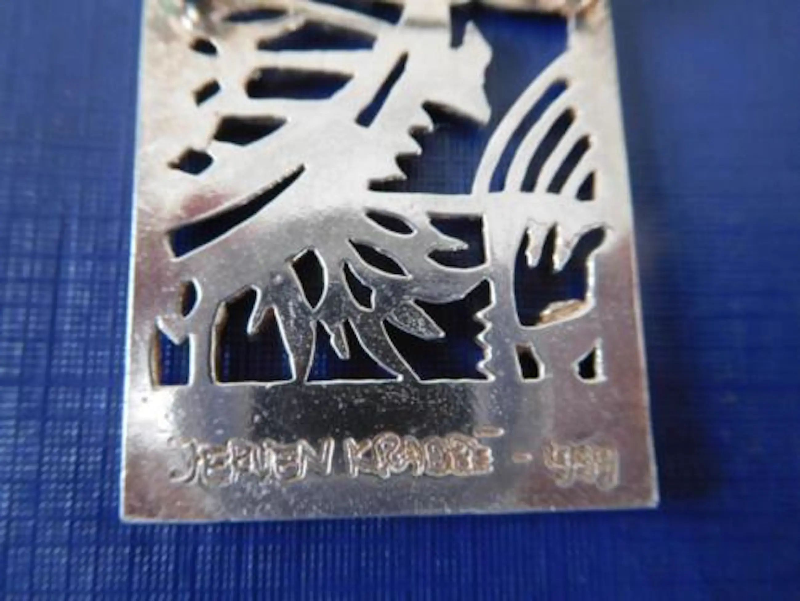 Prachtige broche/hanger van 1e gehalte zilver. 28x44 mm.ontworpen door acteur en kunstenaar Jeroen Krabbé. De broche/hanger zelf is op de achterkant gegraveerd "Jeroen Krabbe 1999" en is slechts in beperkte oplage uitgegeven.