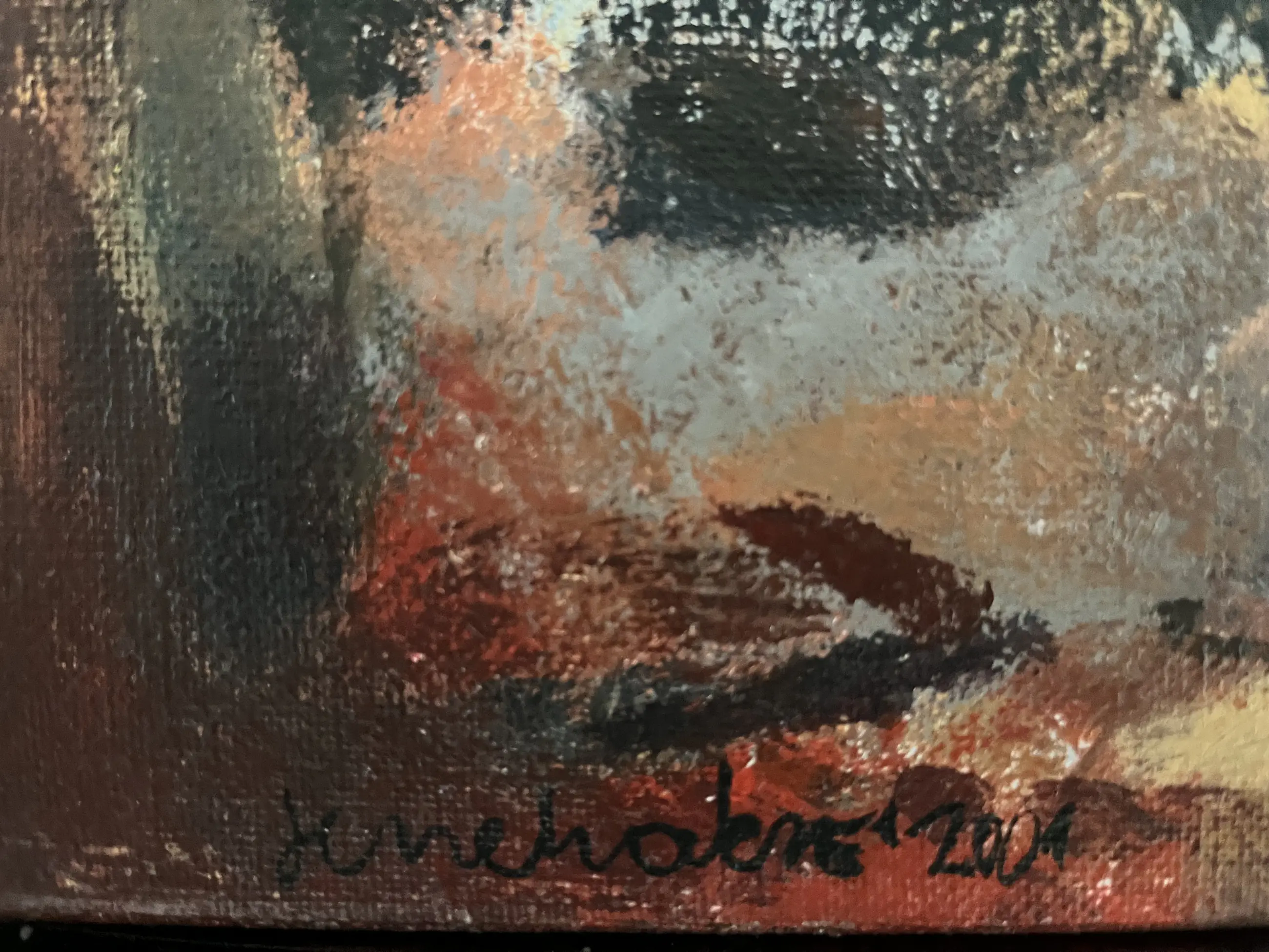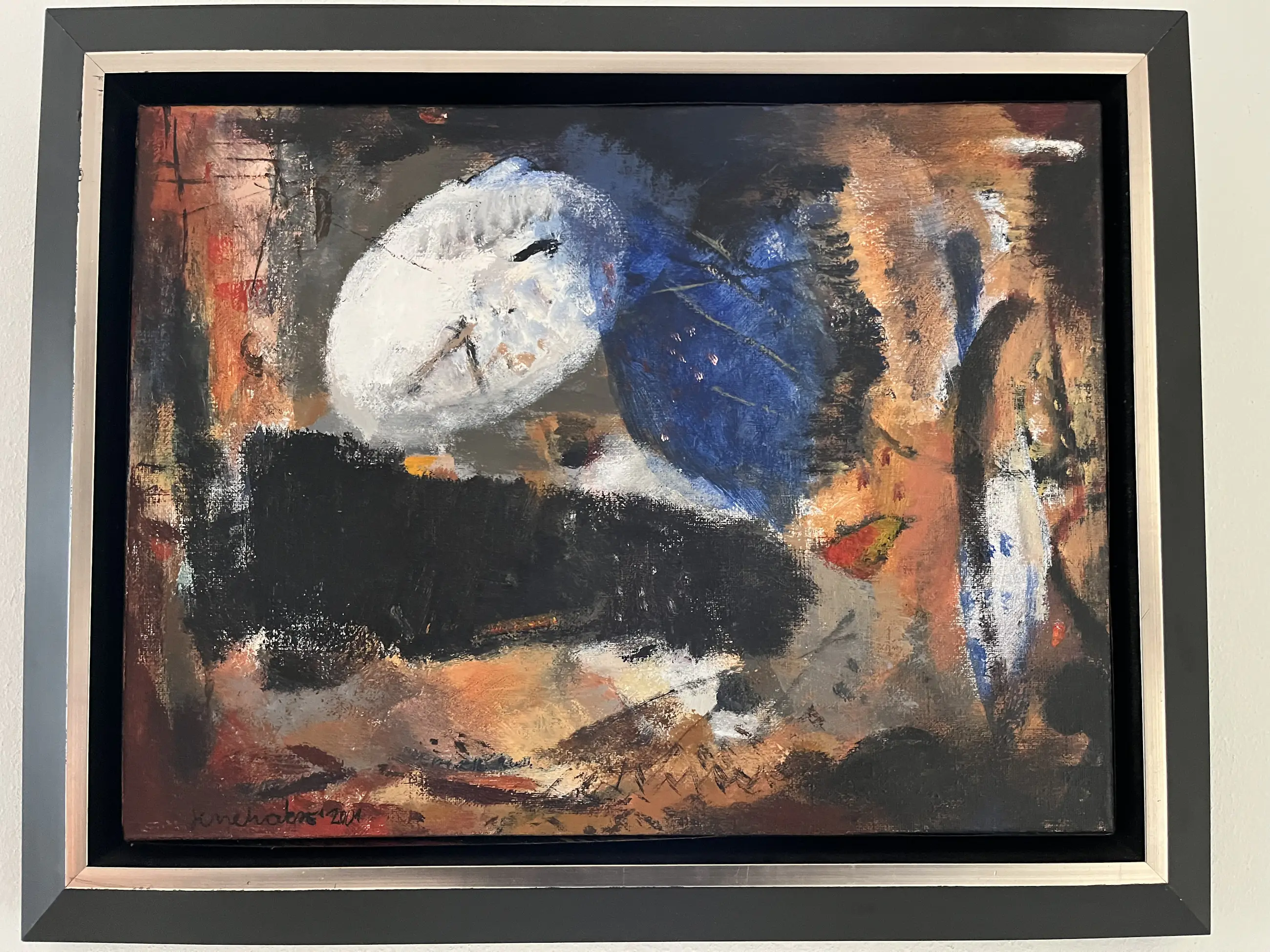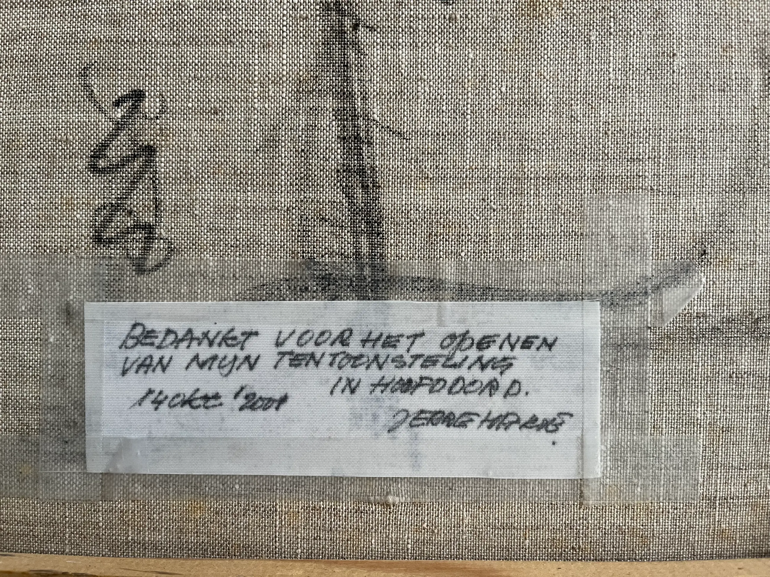 Fraai werkje uit 2001, welke de kunstenaar als dank heeft gegeven voor het openingswoord van een expositie. Het schilderij is gelijst in een zwartgeverfde houten baklijst met een zilverkleurige bovenrand. Afmeting doek 30 x 40 cm. Inclusief lijst 39,5 x 49,5 cm.
