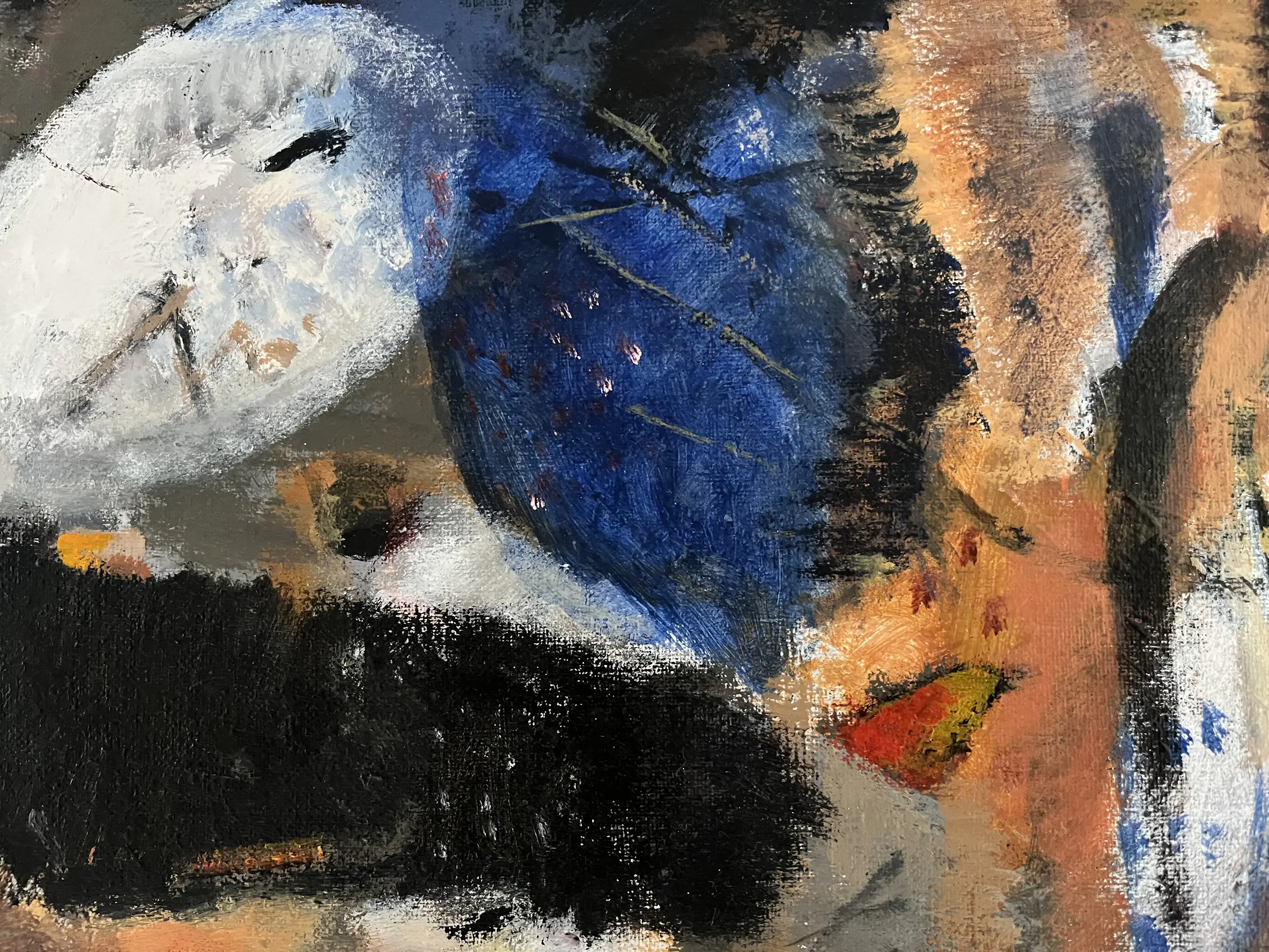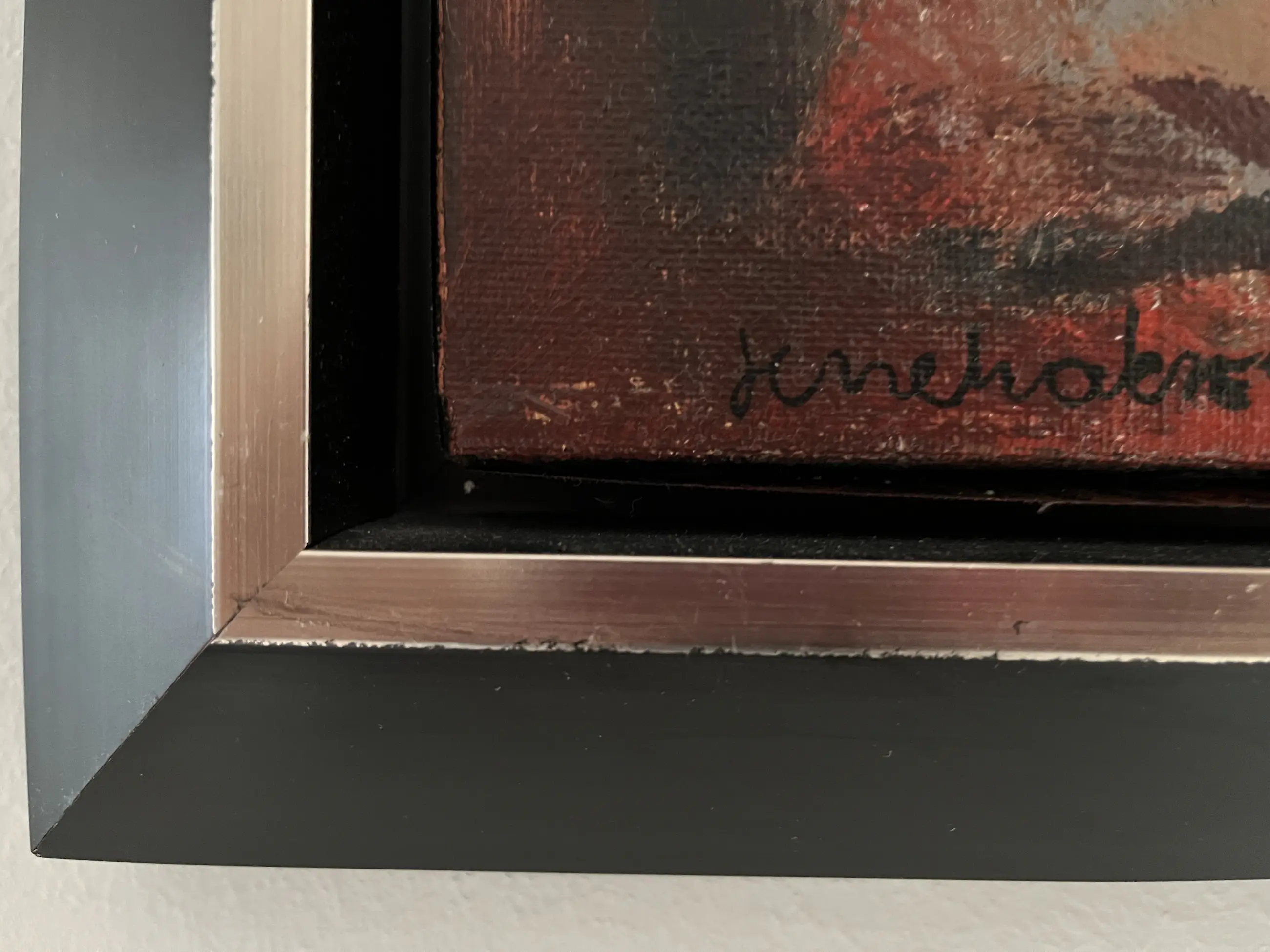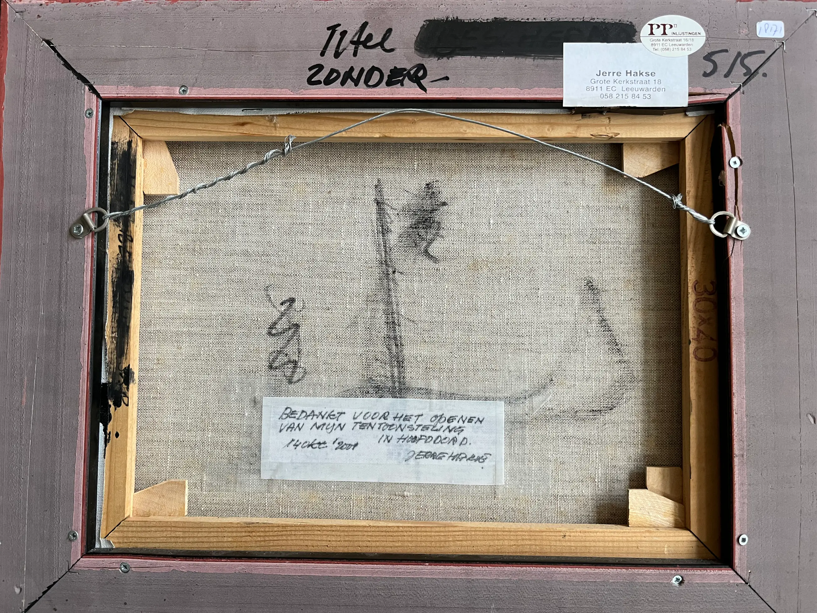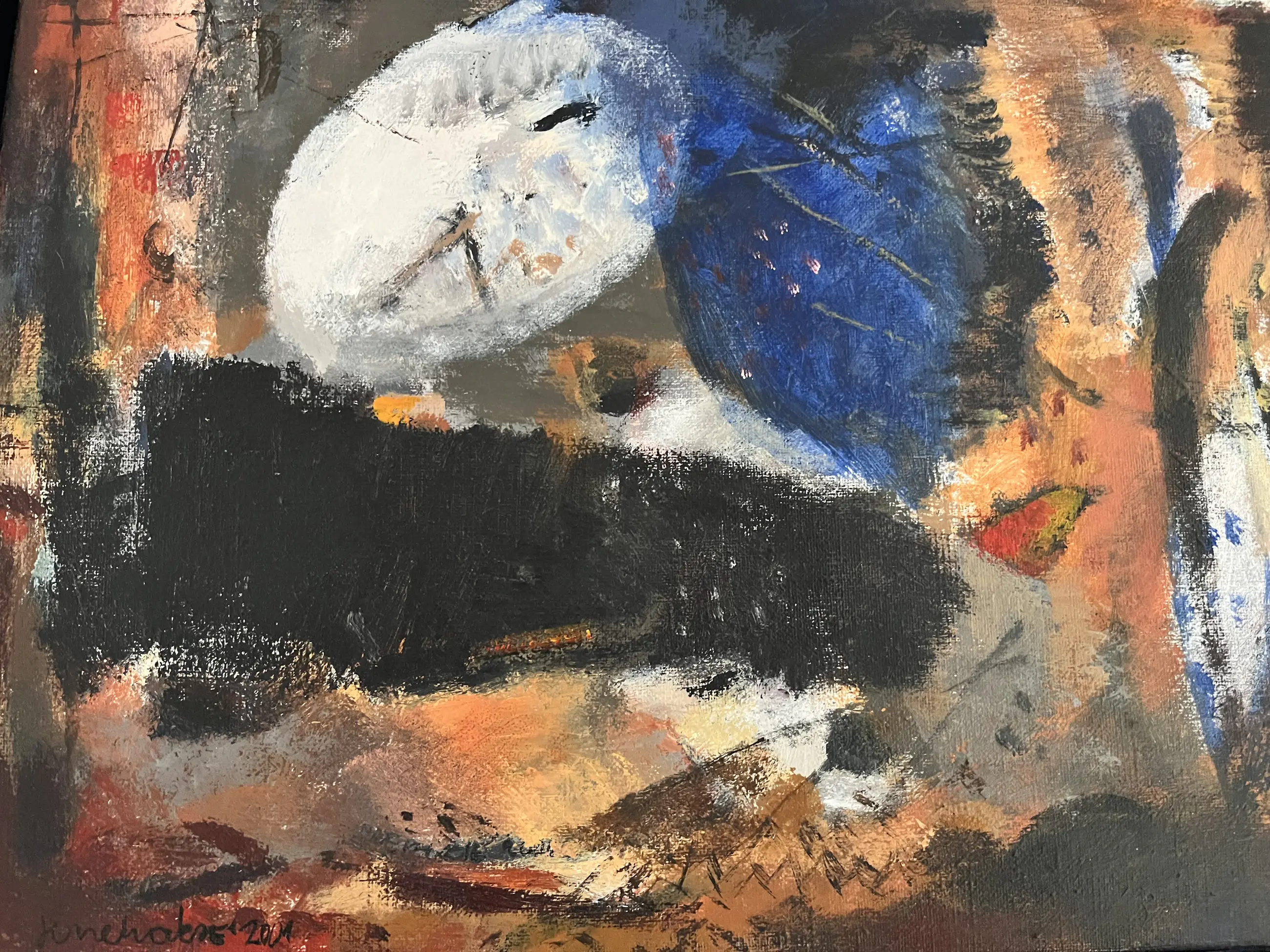 Fraai werkje uit 2001, welke de kunstenaar als dank heeft gegeven voor het openingswoord van een expositie. Het schilderij is gelijst in een zwartgeverfde houten baklijst met een zilverkleurige bovenrand. Afmeting doek 30 x 40 cm. Inclusief lijst 39,5 x 49,5 cm.
