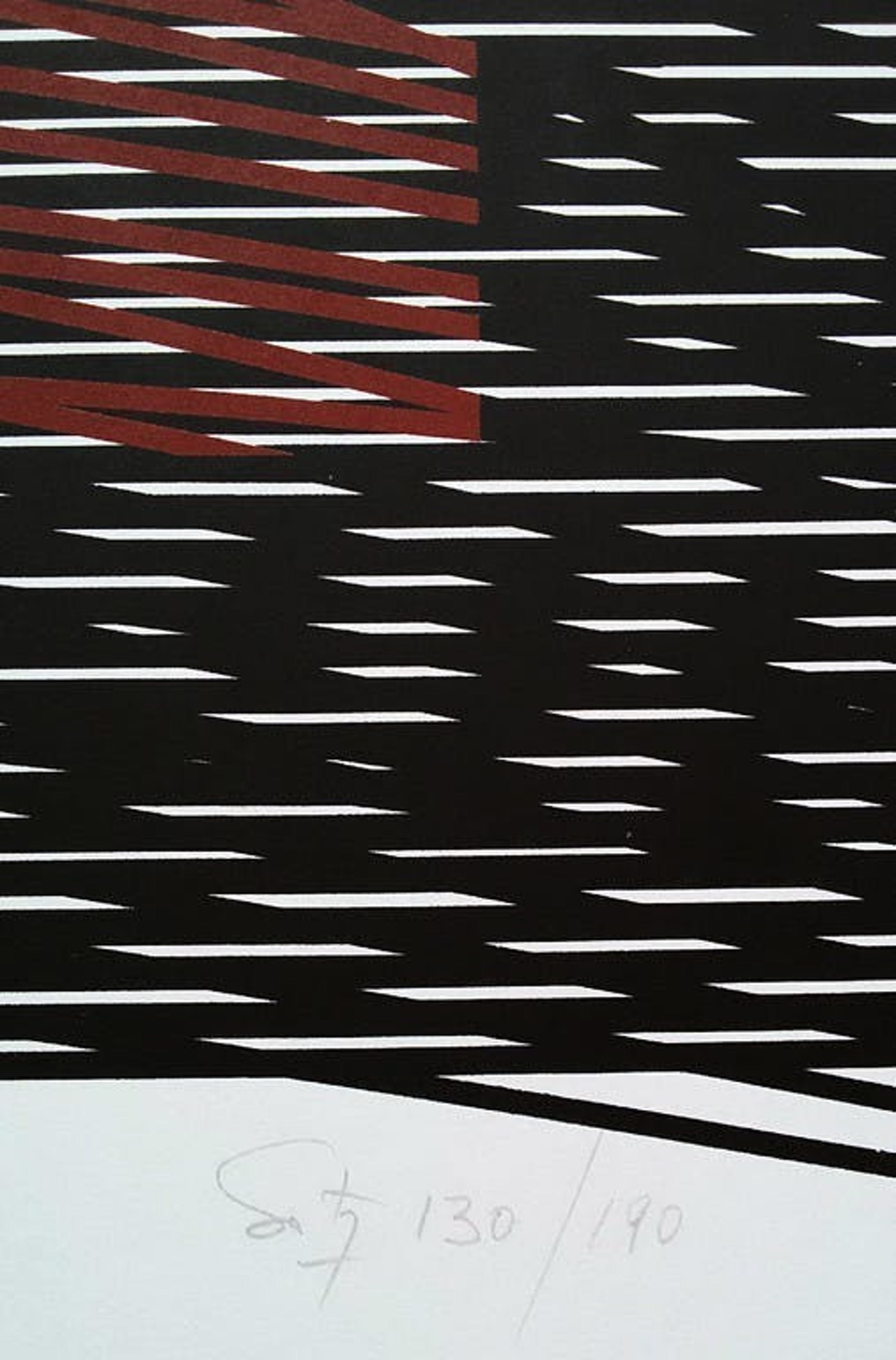 Bloedmooi werk uit 1981 van de wereldberoemde Venezolaanse kunstenaar Jesus Rafael Soto. Internationaal gezien één van de hoogtepunten uit de hele Prent 190 reeks. Zeefdruk op papier, met potlood gesigneerd en genummerd (130/190). In uitstekende conditie.