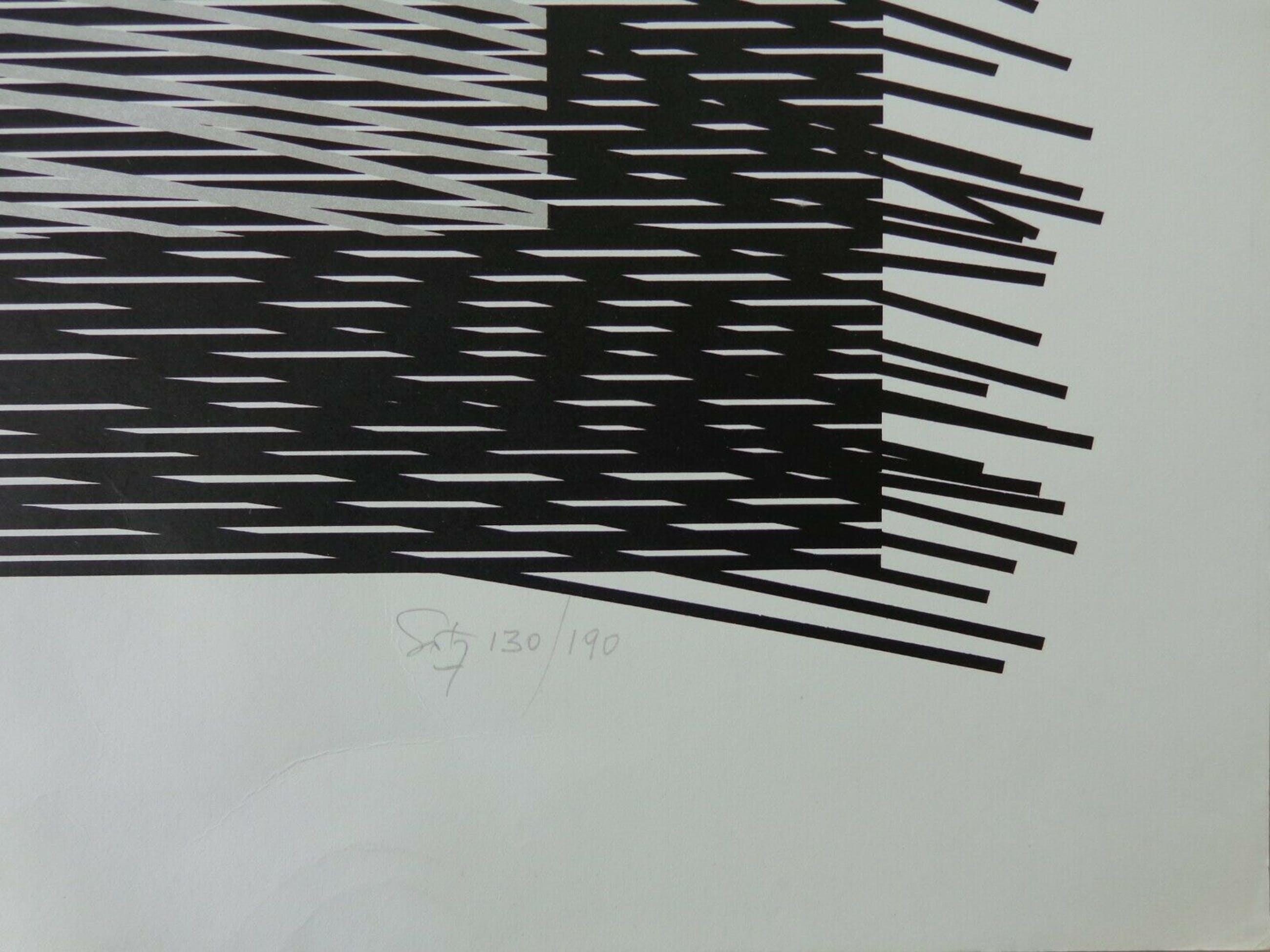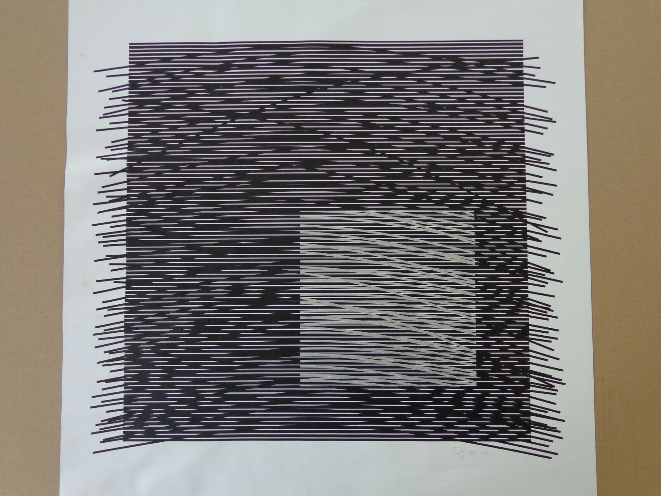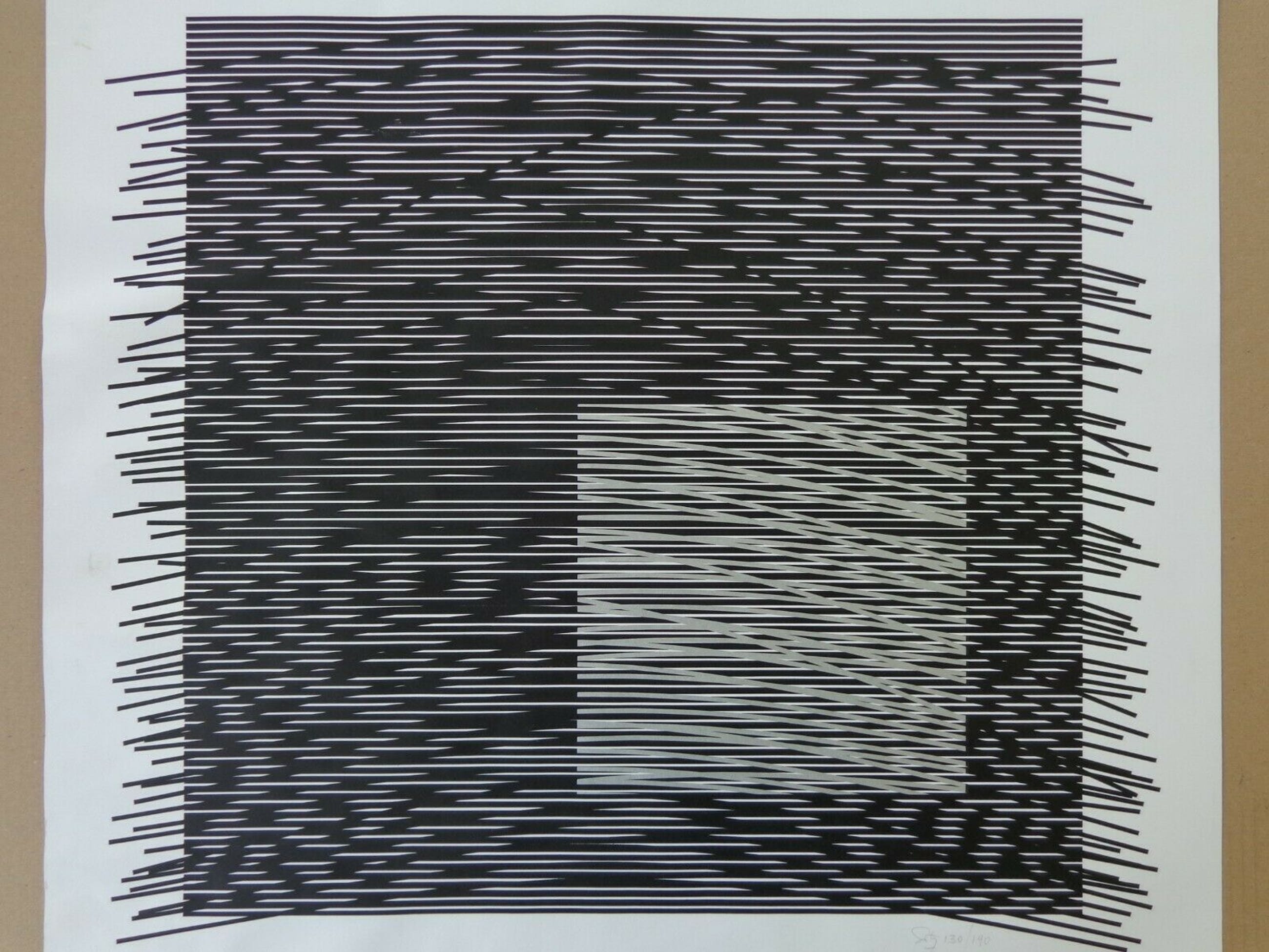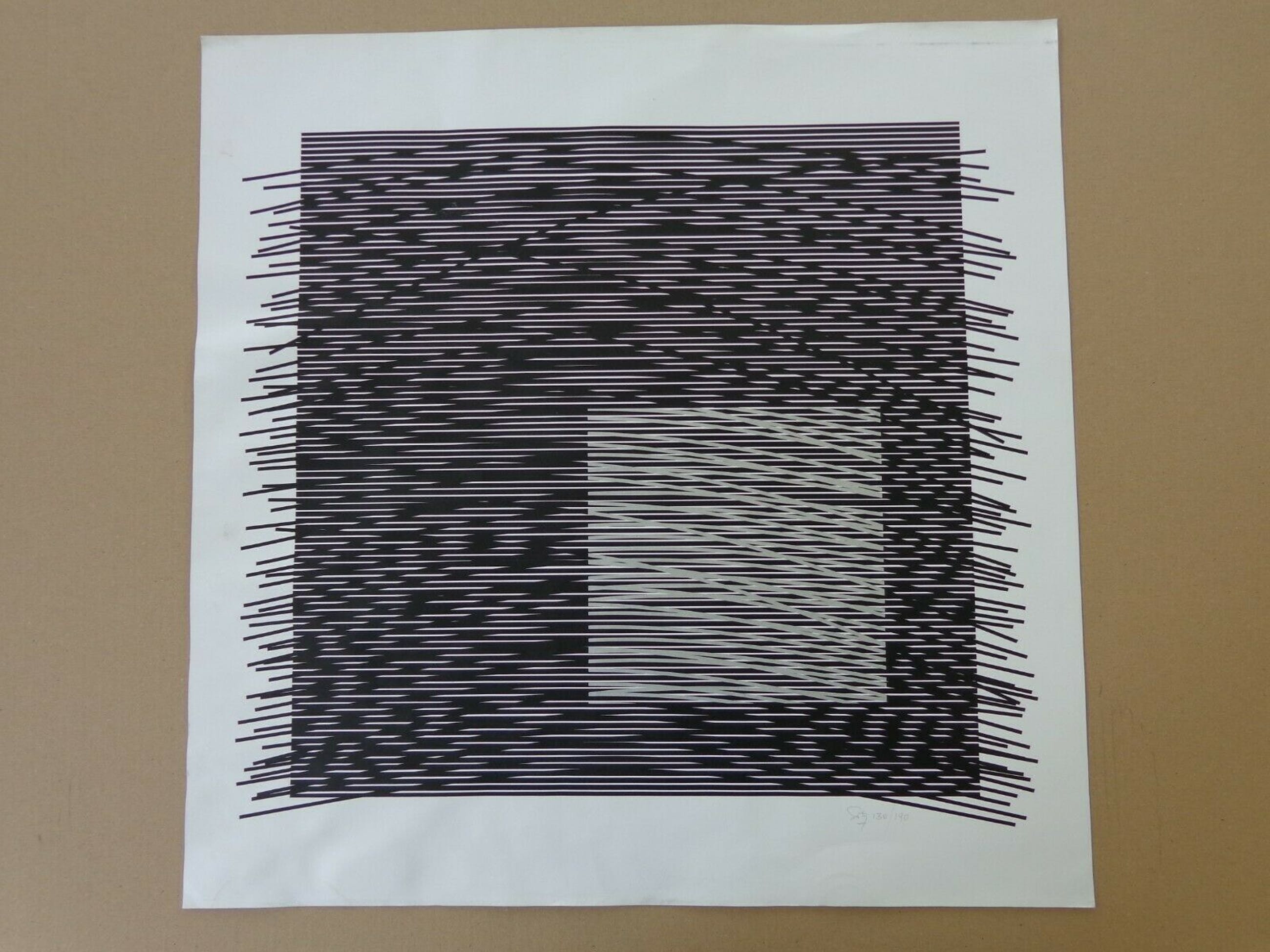 Zwart-wit zeefdruk op dik papier.