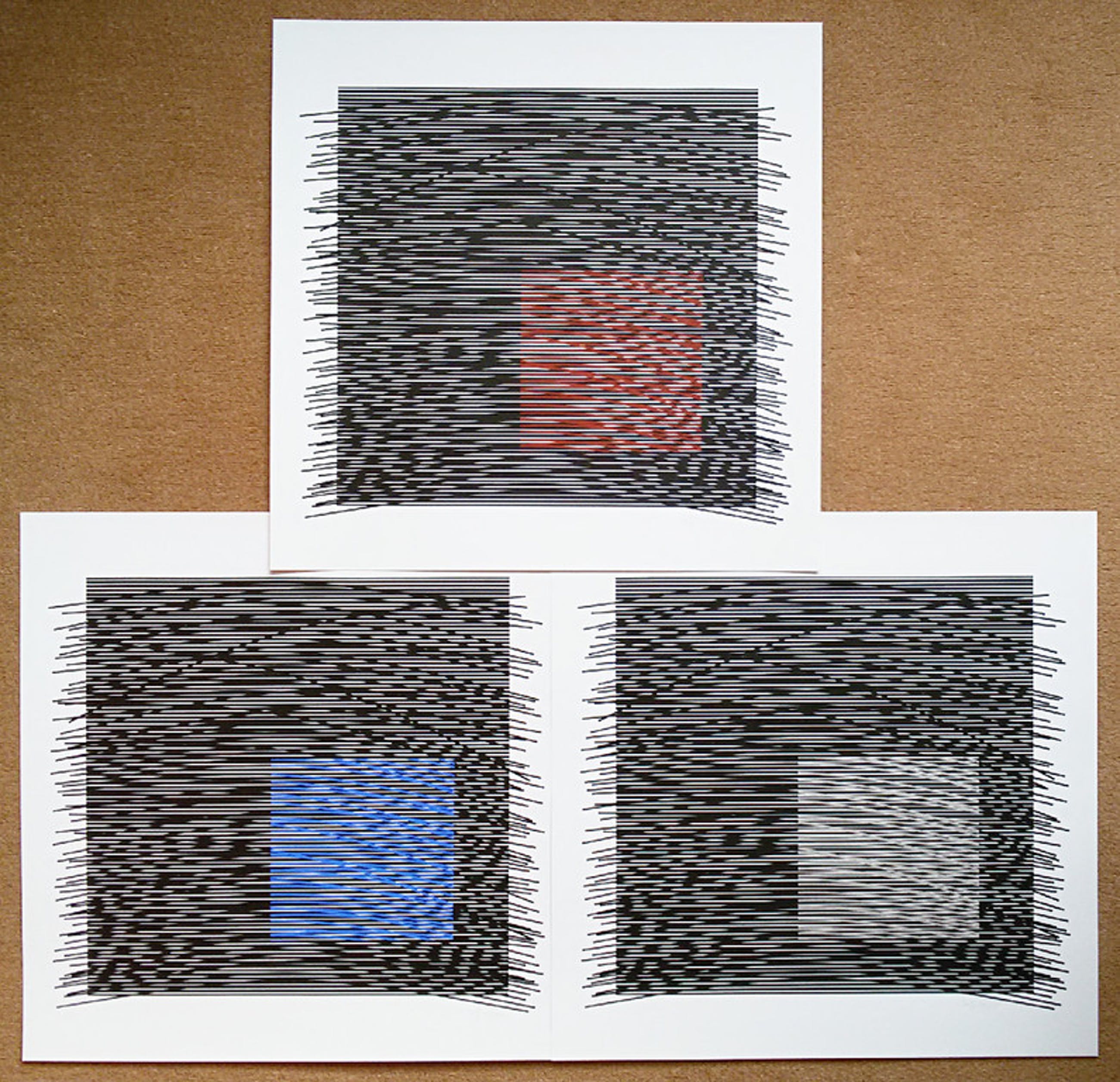 Drievoudig bloedmooi werk uit 1981 van de wereldberoemde Venezolaanse kunstenaar Jesus Rafael Soto. Internationaal gezien één van de hoogtepunten uit de hele Prent 190 reeks. Driemaal zeefdruk op papier, elk met potlood gesigneerd en genummerd (110/190). Alle drie (Carré virtuel bleu a droite, Carré virtuel gris a droite en Carré virtuel rouge a droite) in mint conditie.