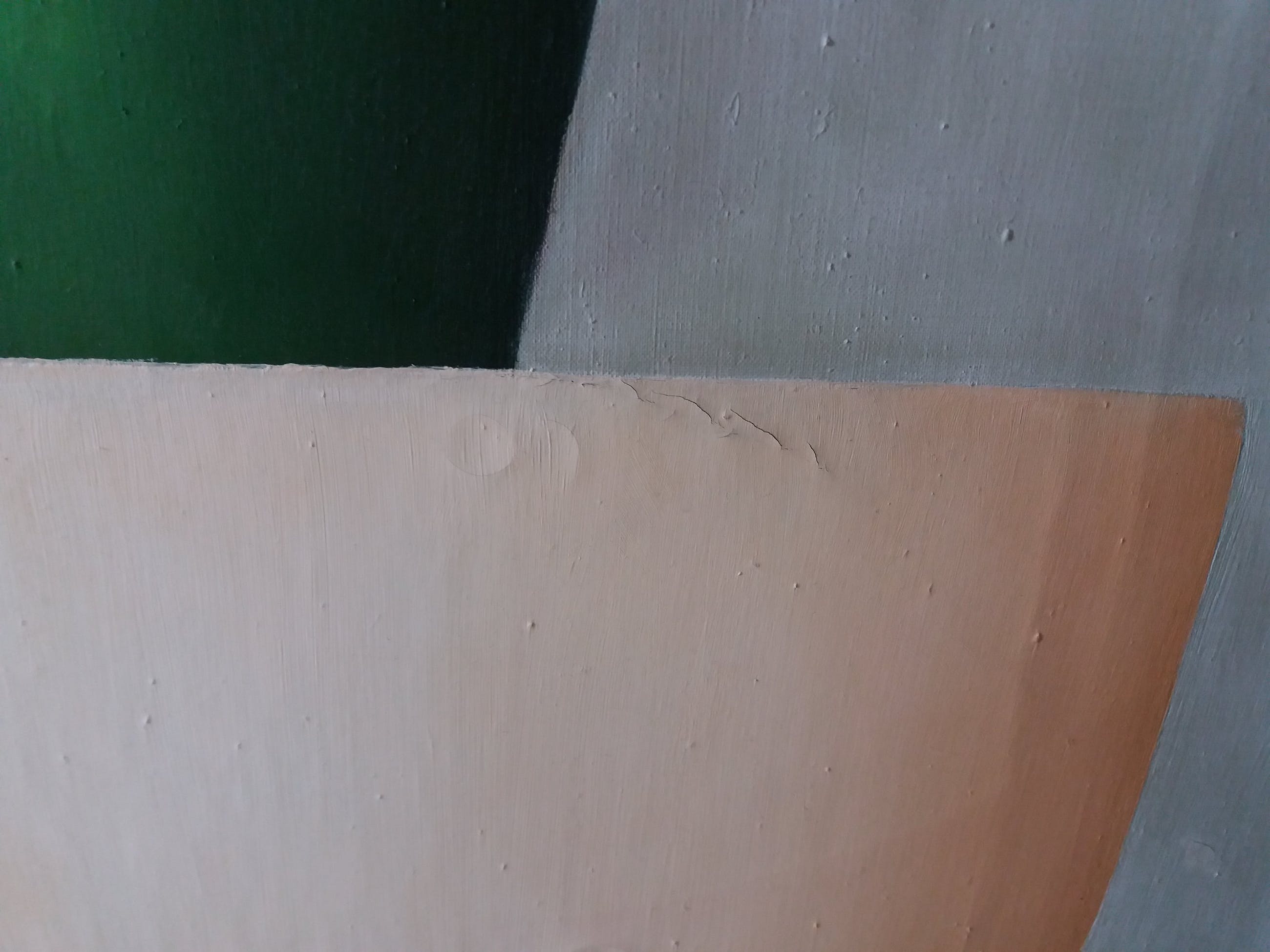De conditie is redelijk/goed. De verf is in het zalmkleur gedeelte aan de onderkant gecraqueleerd. Niet hinderlijk voor het beeld. Rechts in de hoek een vuilplek.