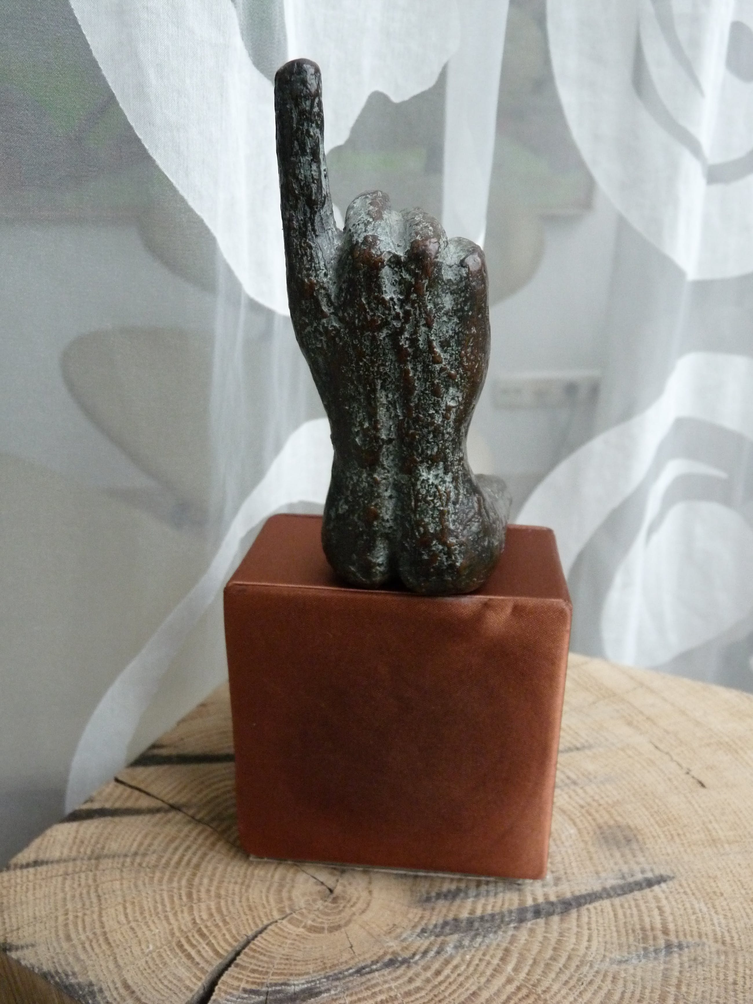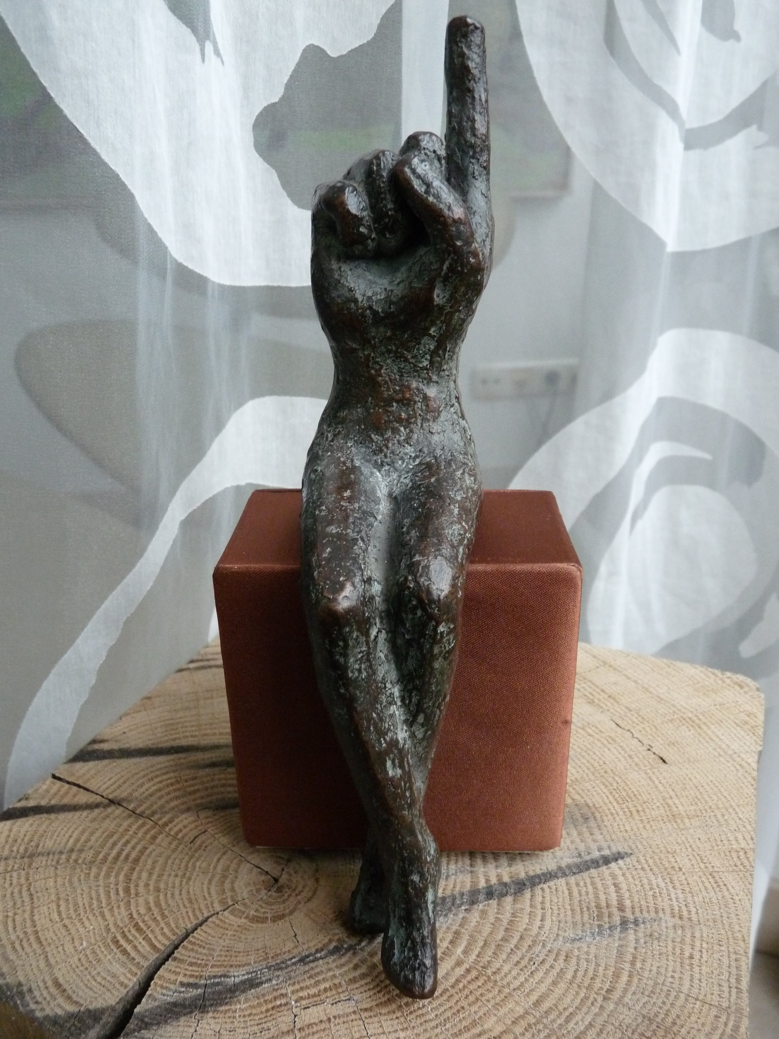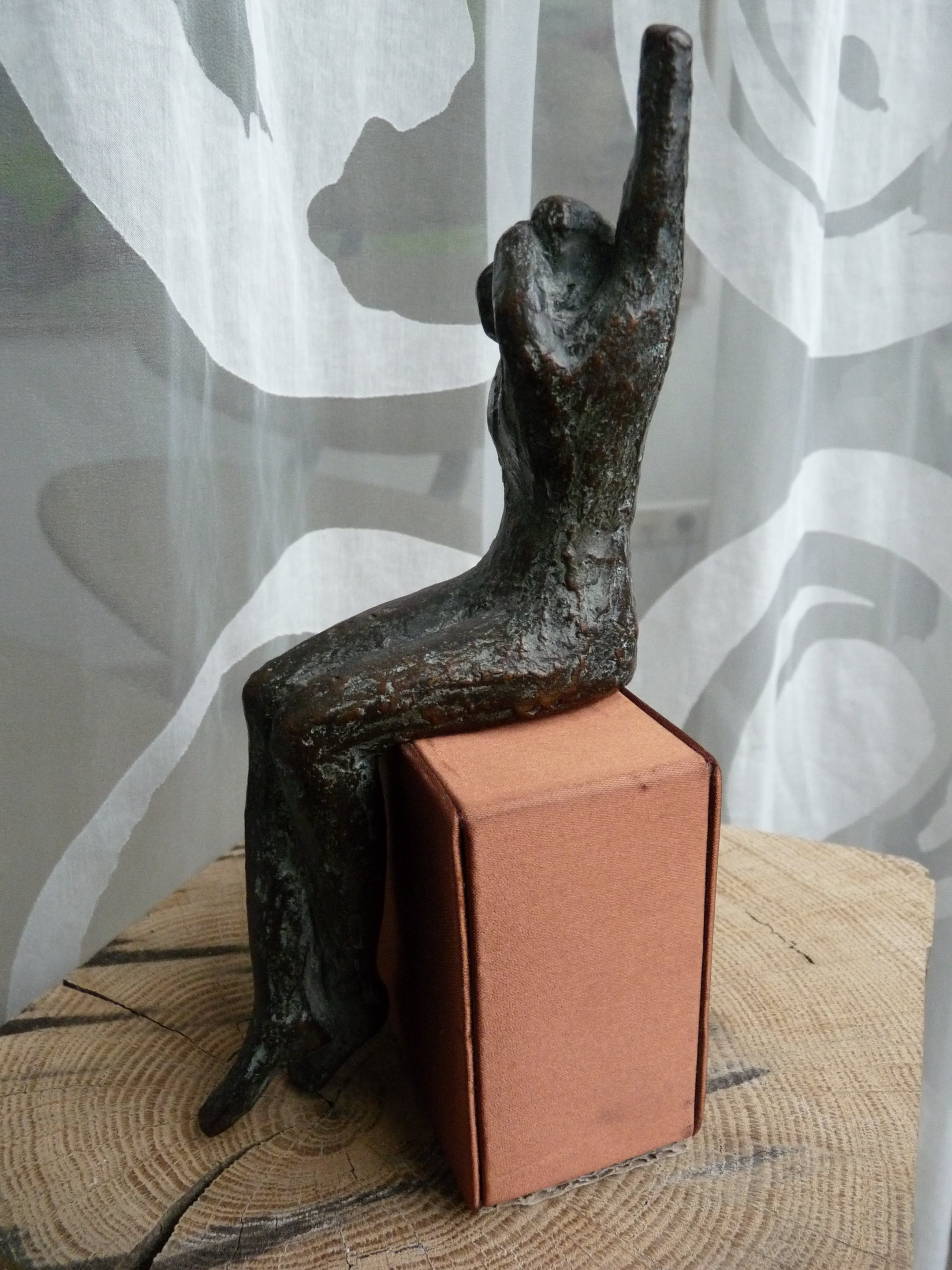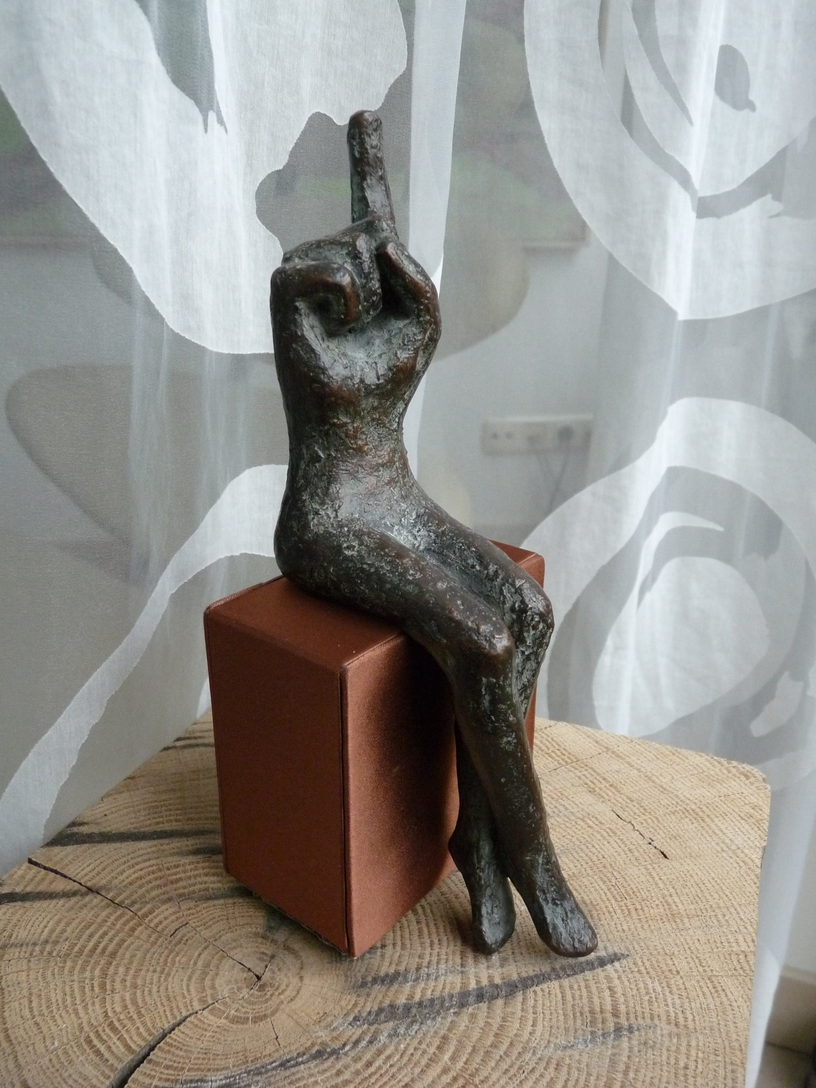 De console stelt niet veel voor, maar is als zitelement wel essentieel voor het beeld. Volgens mij is de console een oud juwelendoosje. Afmeting doosje 8 x 8 x 4,5 cm.