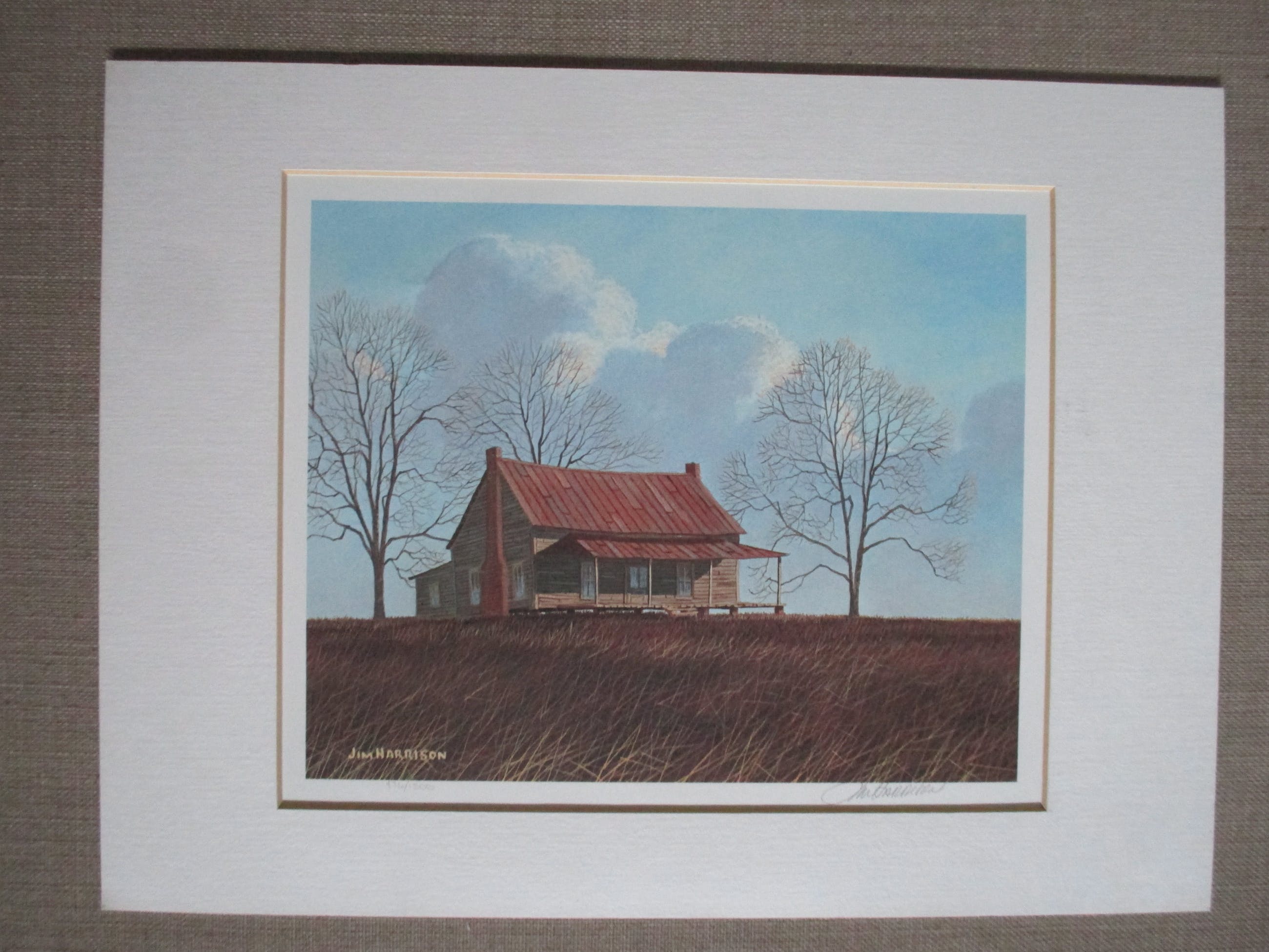 Litho van de Amerikaanse kunstenaar Jim Harrison, die het Amerikaanse platteland in zijn werken vastlegde. Geplaatst achter passe-partout. Het geheel is in perfecte staat. Gesigneerd en genummerd in potlood.Verzending tussen twee plaatjes, 4,90, aangetekend 9,15