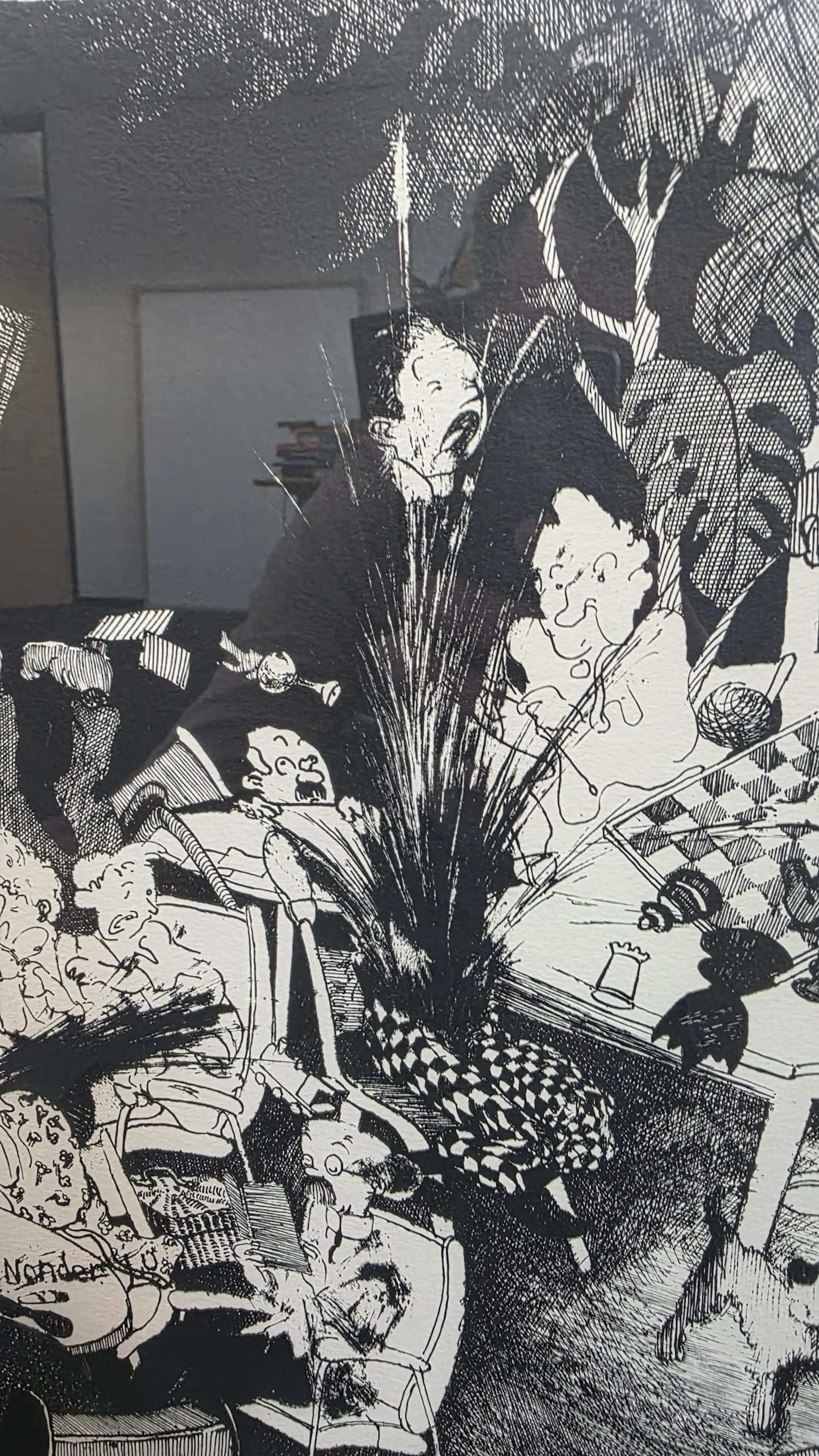 Absurde interpretatie van de tekening op pagina 2 van het beroemde stripboek "Kuifje in Tibet" waarop het hoofd van Kuifje lijkt te exploderen.