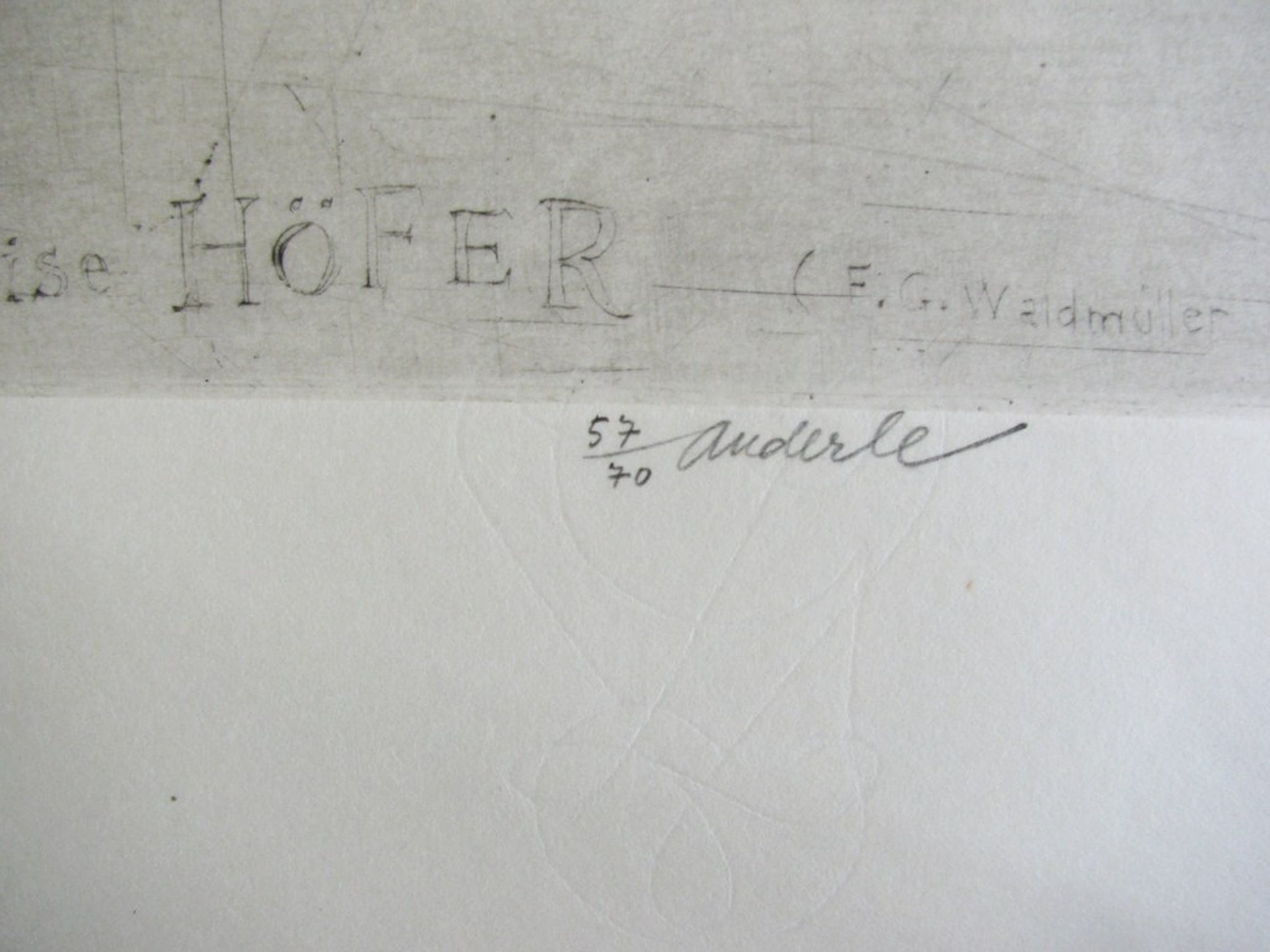 Anderlé heeft zich wel vaker laten inspireren door de grote klassiekers: Rembrandt, Dürer, maar ook door modernen als Picasso en Matisse. Vaak nam hij een bekend werk van die kunstenaars als uitgangspunt voor zijn eigen grafische bewerking ervan. Ook de gravure die we hier aanbieden, vindt haar wortels in een oud schilderij, namelijk het portret dat de Oostenrijkse schilder Ferdinand Georg Waldmüller (1793-1865) van de actrice Elise Höfer maakte, en dat nu in het Historisches Museum der Stadt Wien hangt. Een afbeelding van dit portret vindt u hier verder bij de foto's.