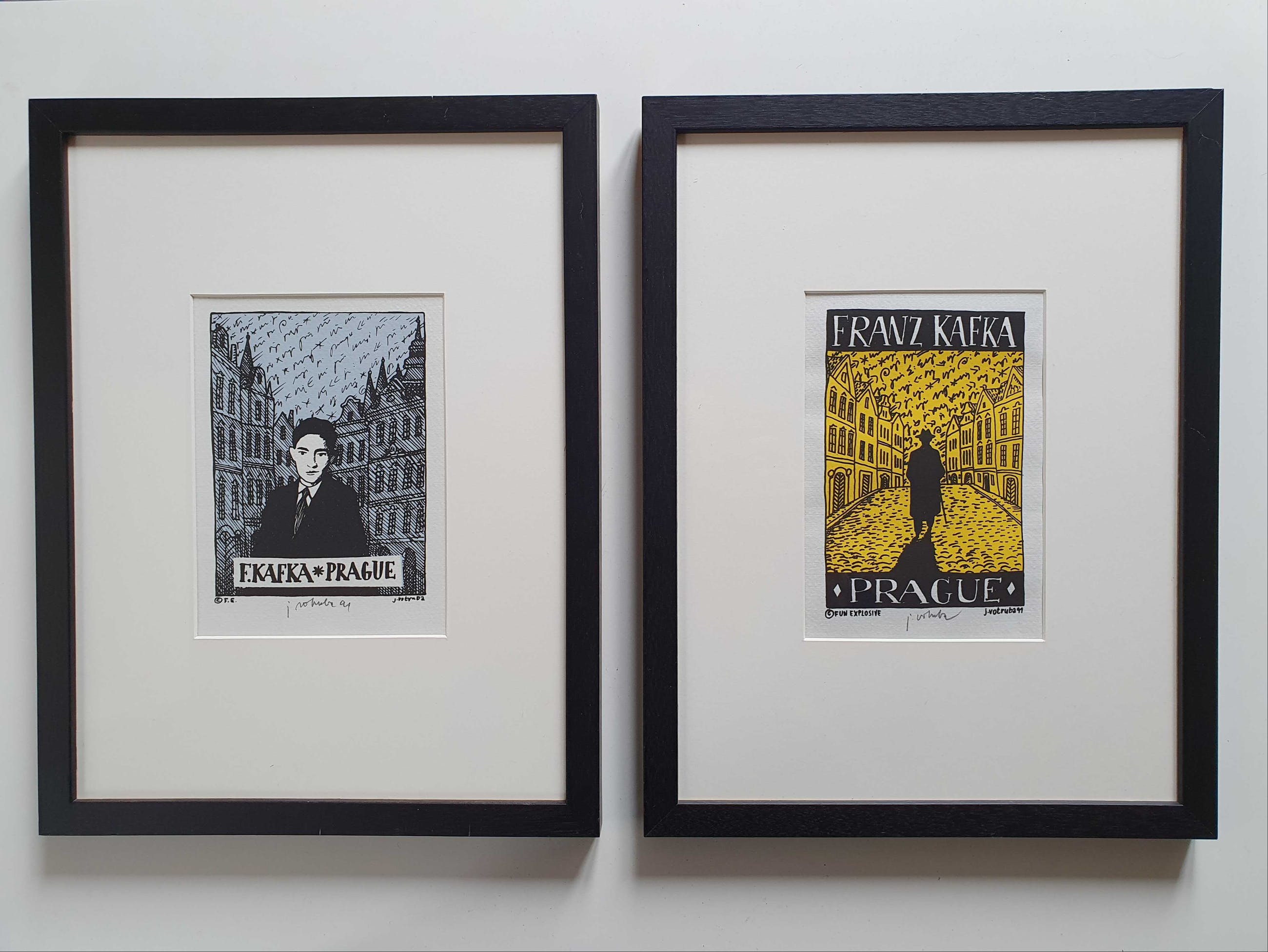 Fraaie set kleurige zeefdrukken van kunstenaar Jiří Votruba met als onderwerp de beroemde 'Tjechische' schrijver Franz Kafka tegen het decor van de hoofdstad Praag. Beide werken zijn gedrukt op geschept papier en gevat in een zwarte lijst achter passe-partout en museumglas. Afmetingen beeld ca. 20 x 14 cm. De lijsten meten 43 x 33 cm.
