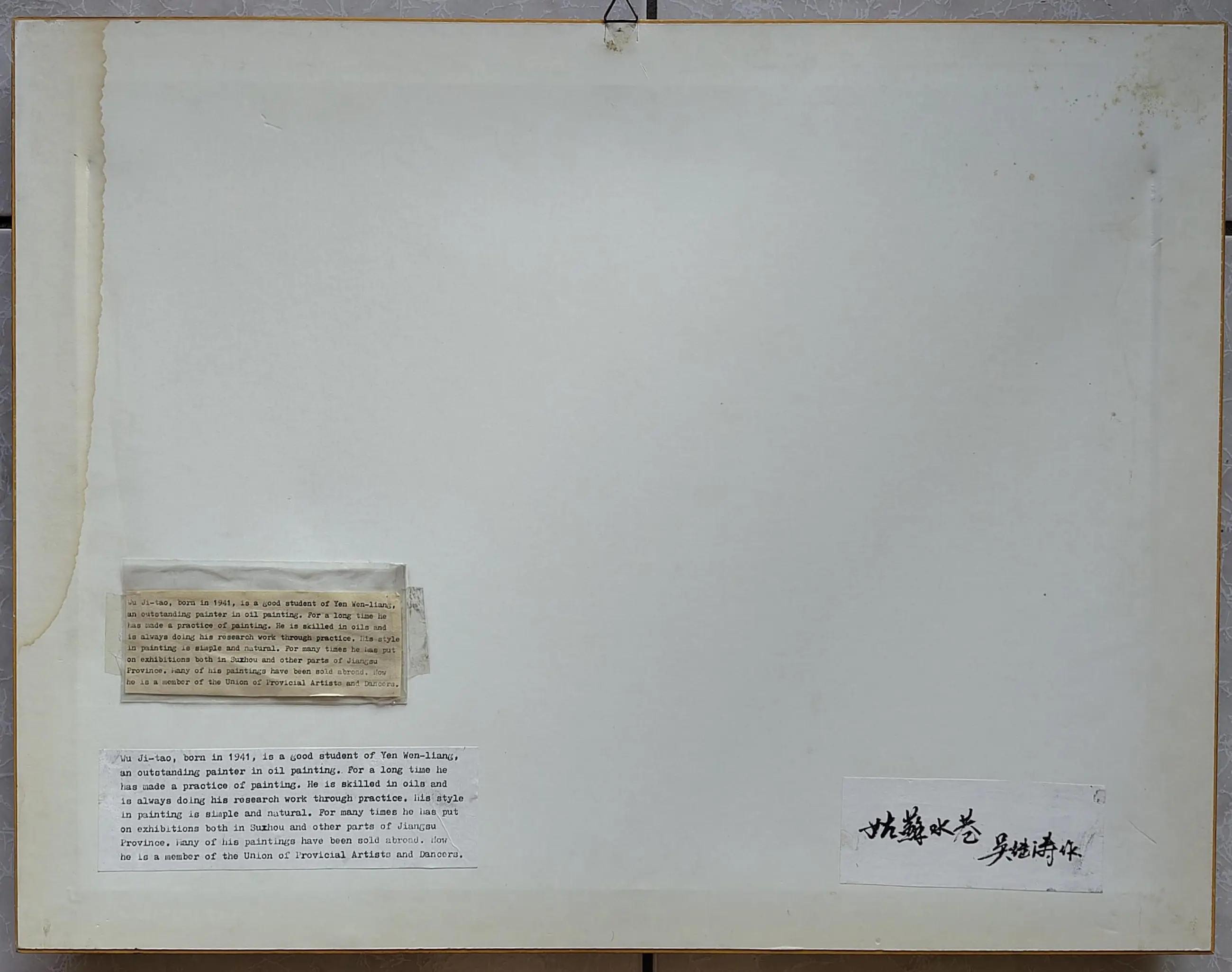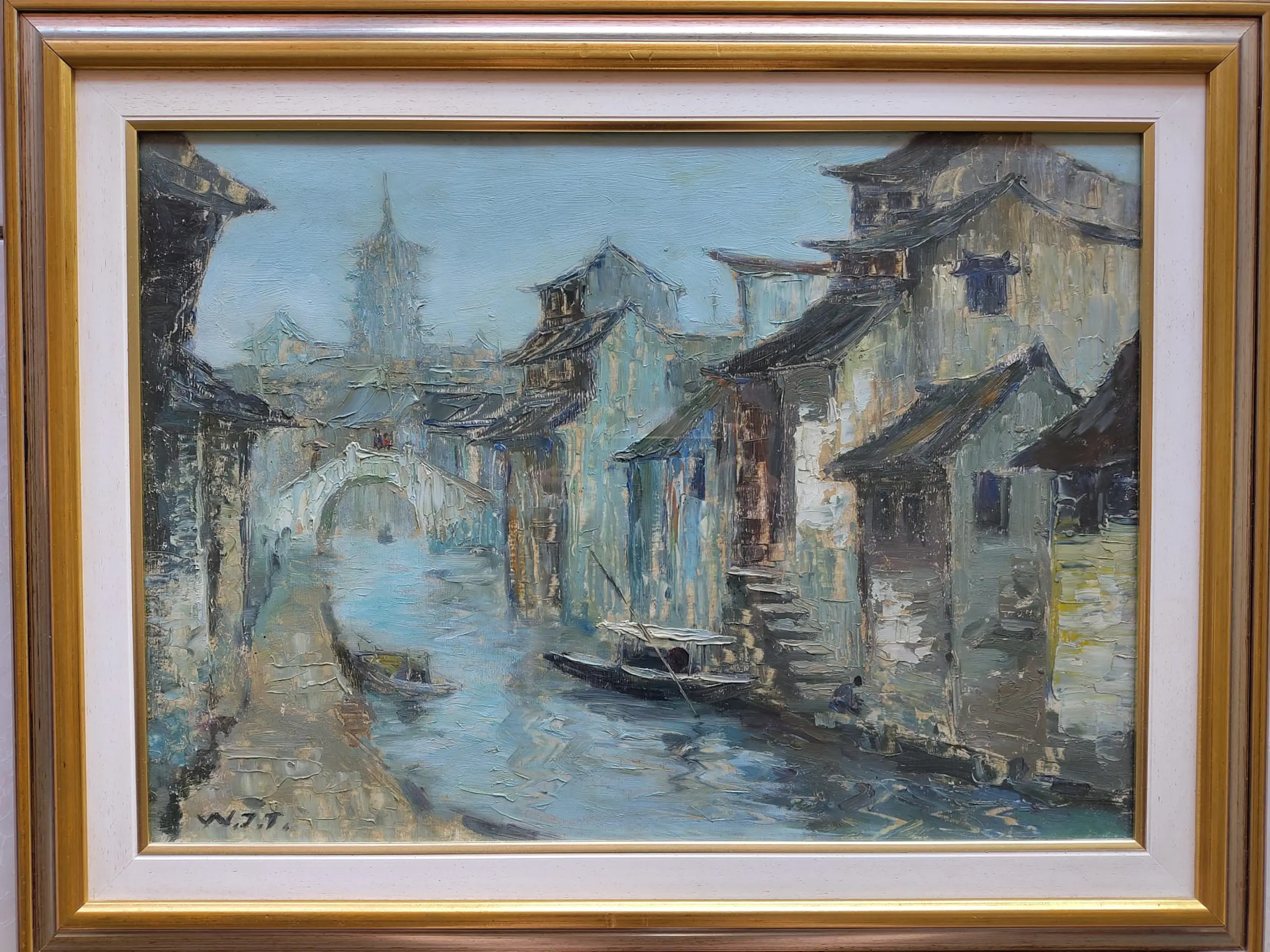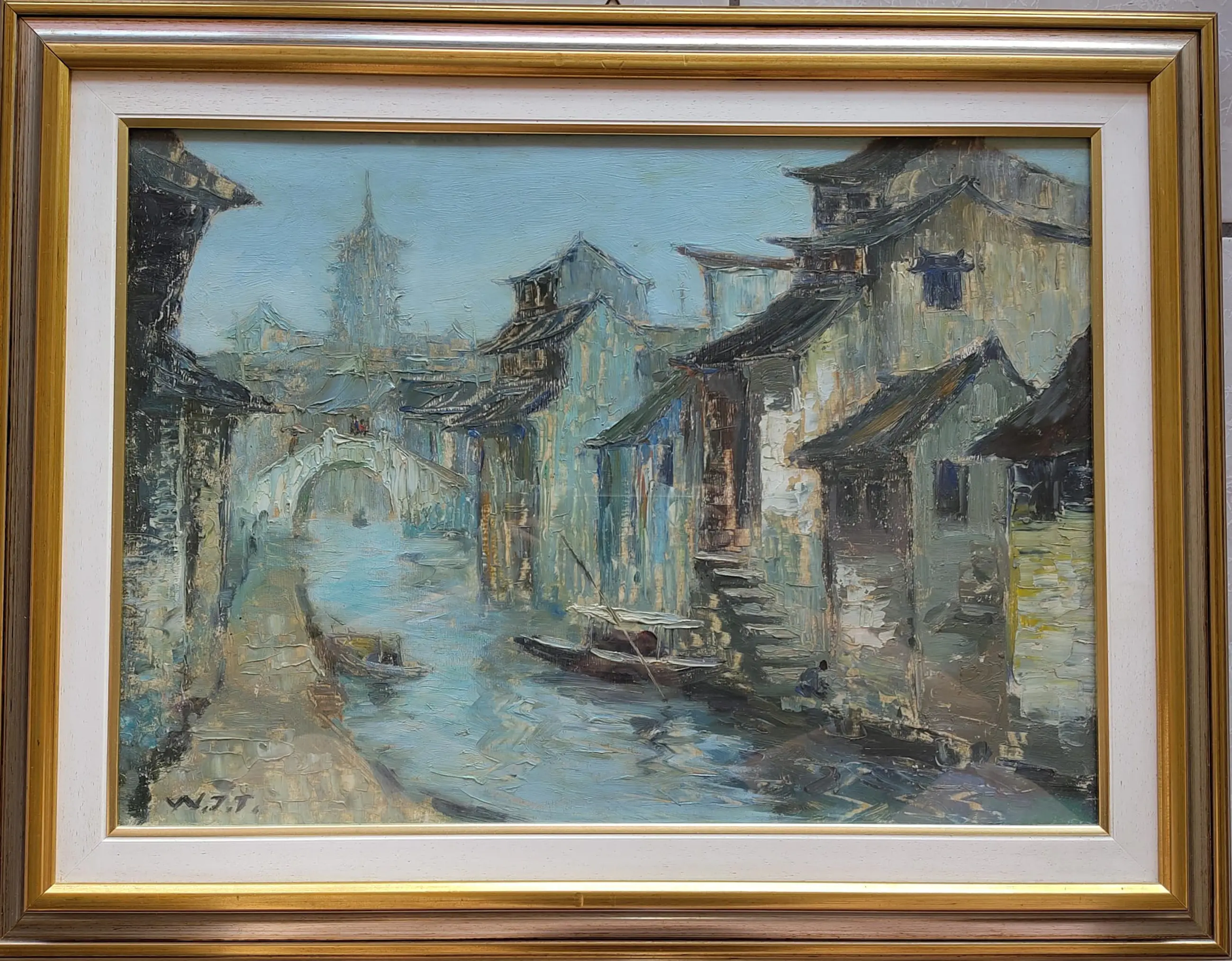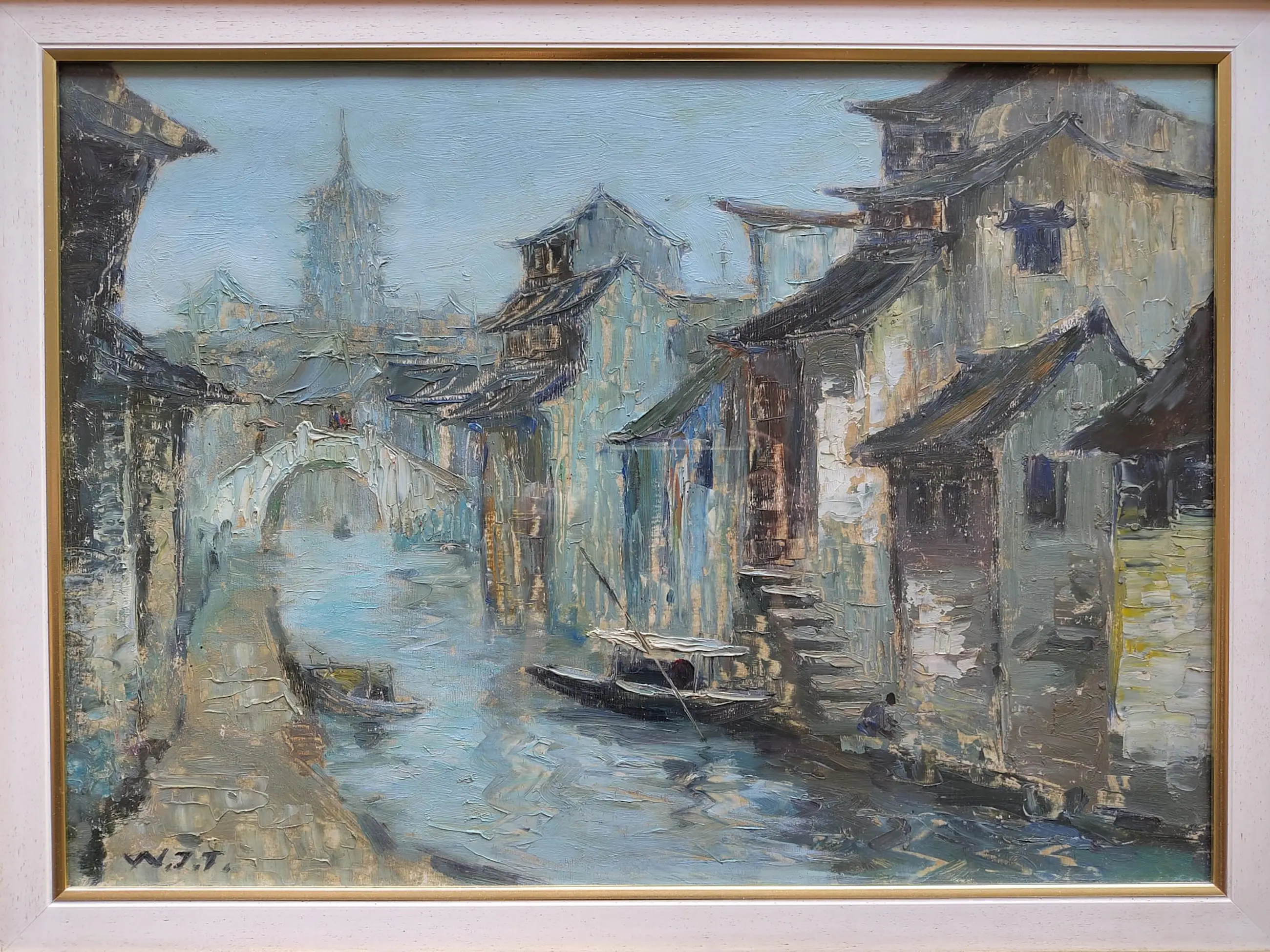 Dit olieverfschilderij van de Chinese kunstenaar Wu Jitao (geb. 1941) toont een traditioneel kanaalstadje, een onderwerp dat geassocieerd wordt met de historische waterwegen van de provincie Jiangsu.