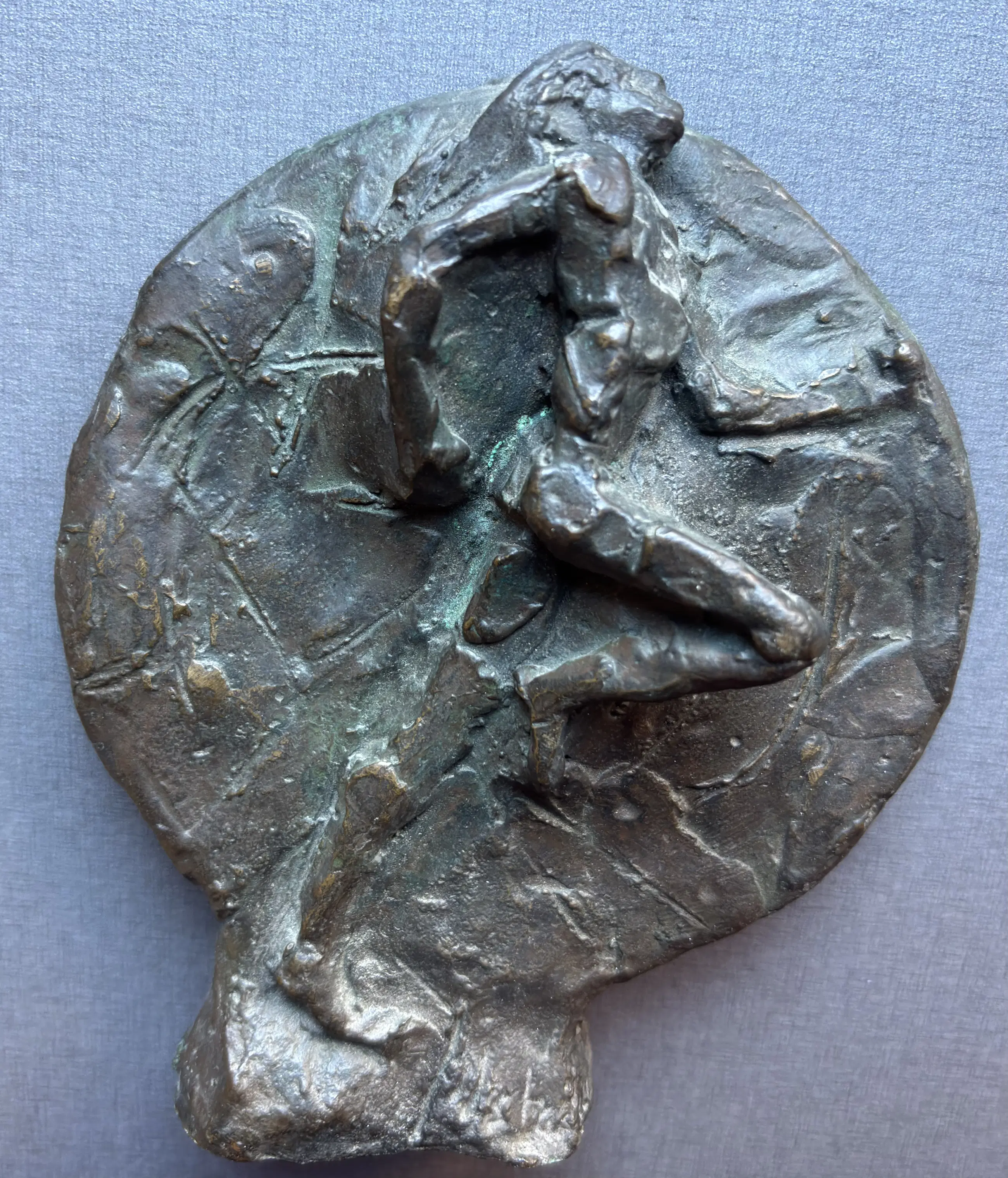 Hardloper/hardloopster in actieve houding, arm en been geheven, hoofd wat naar achteren, als in een eindsprint.