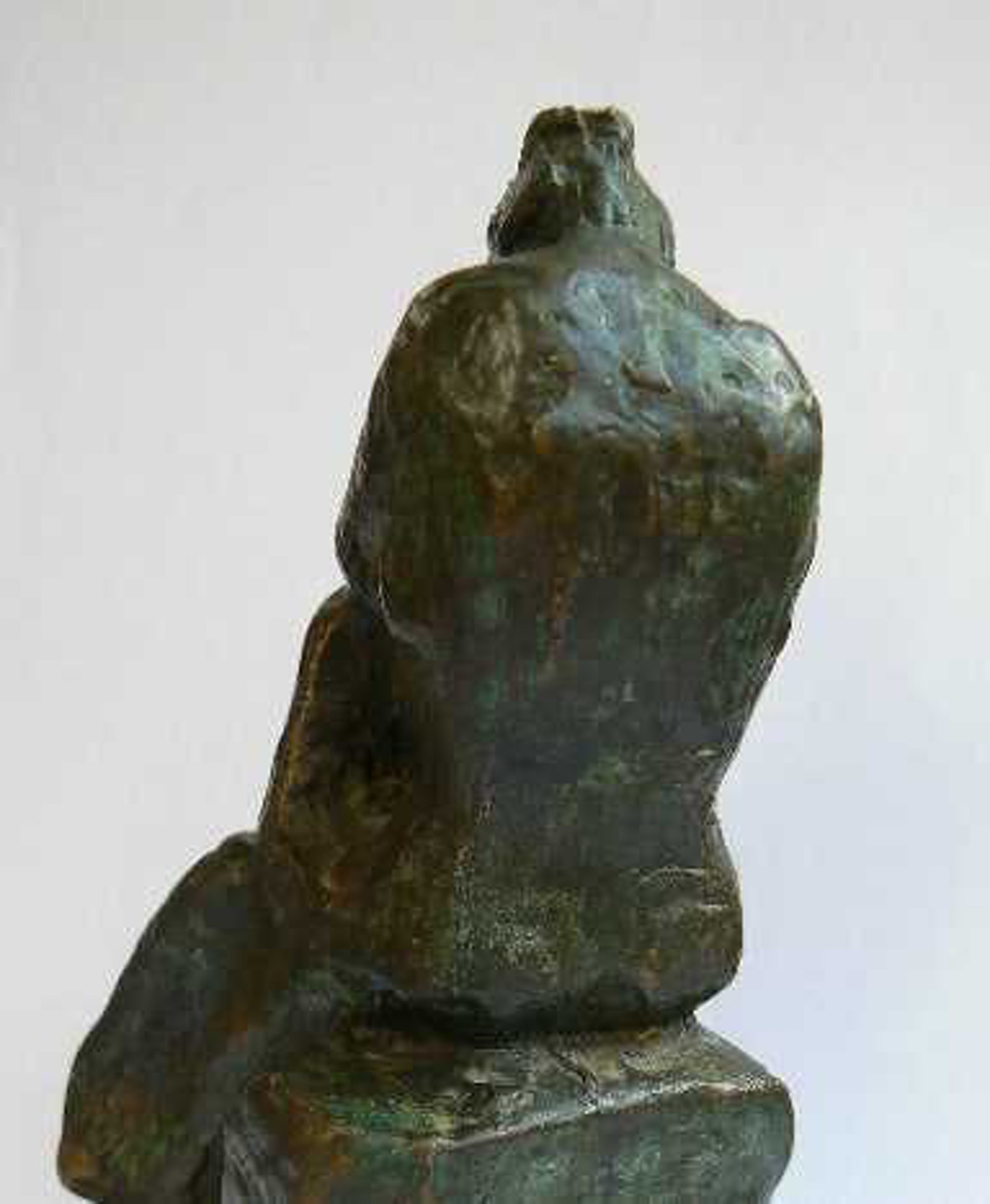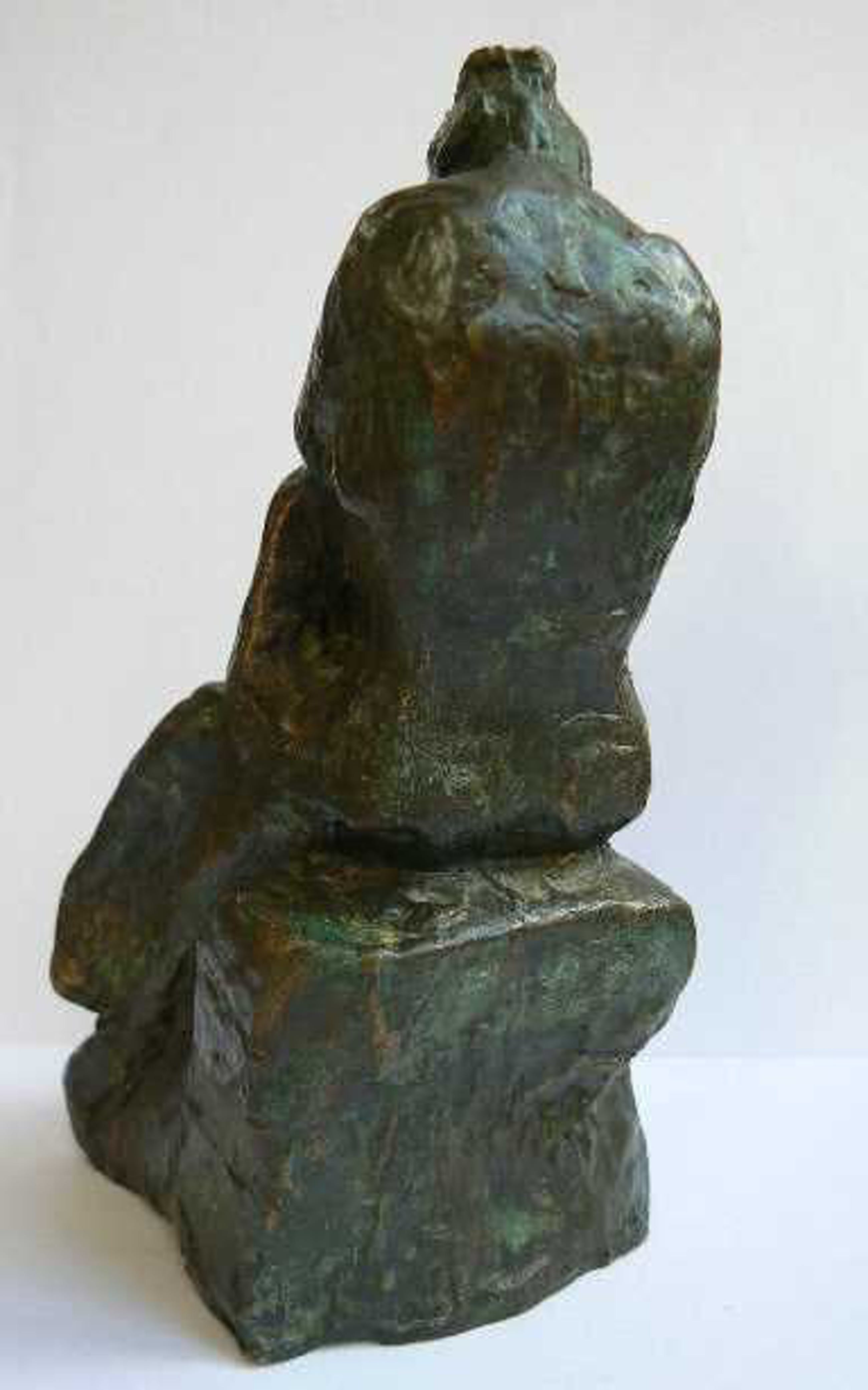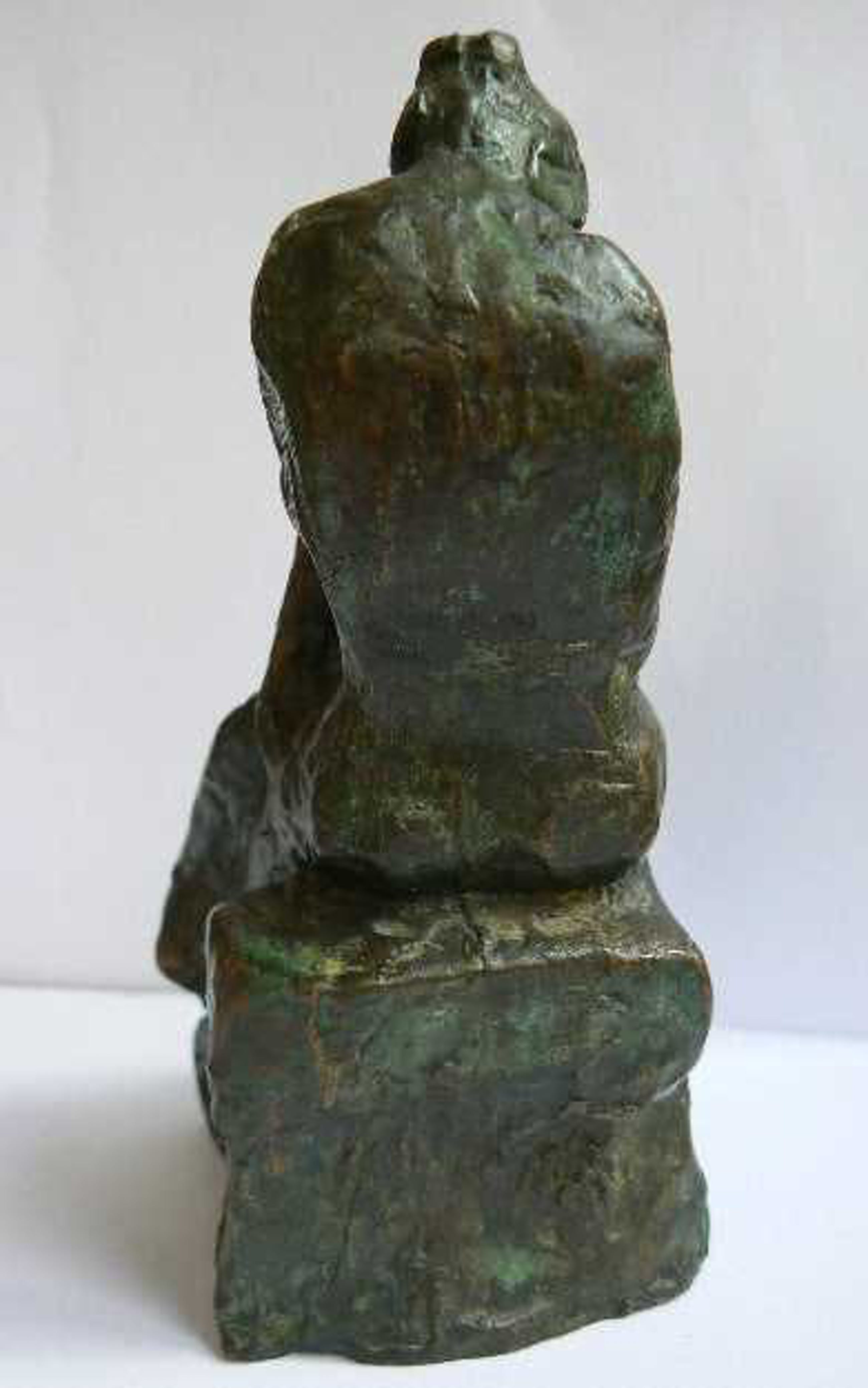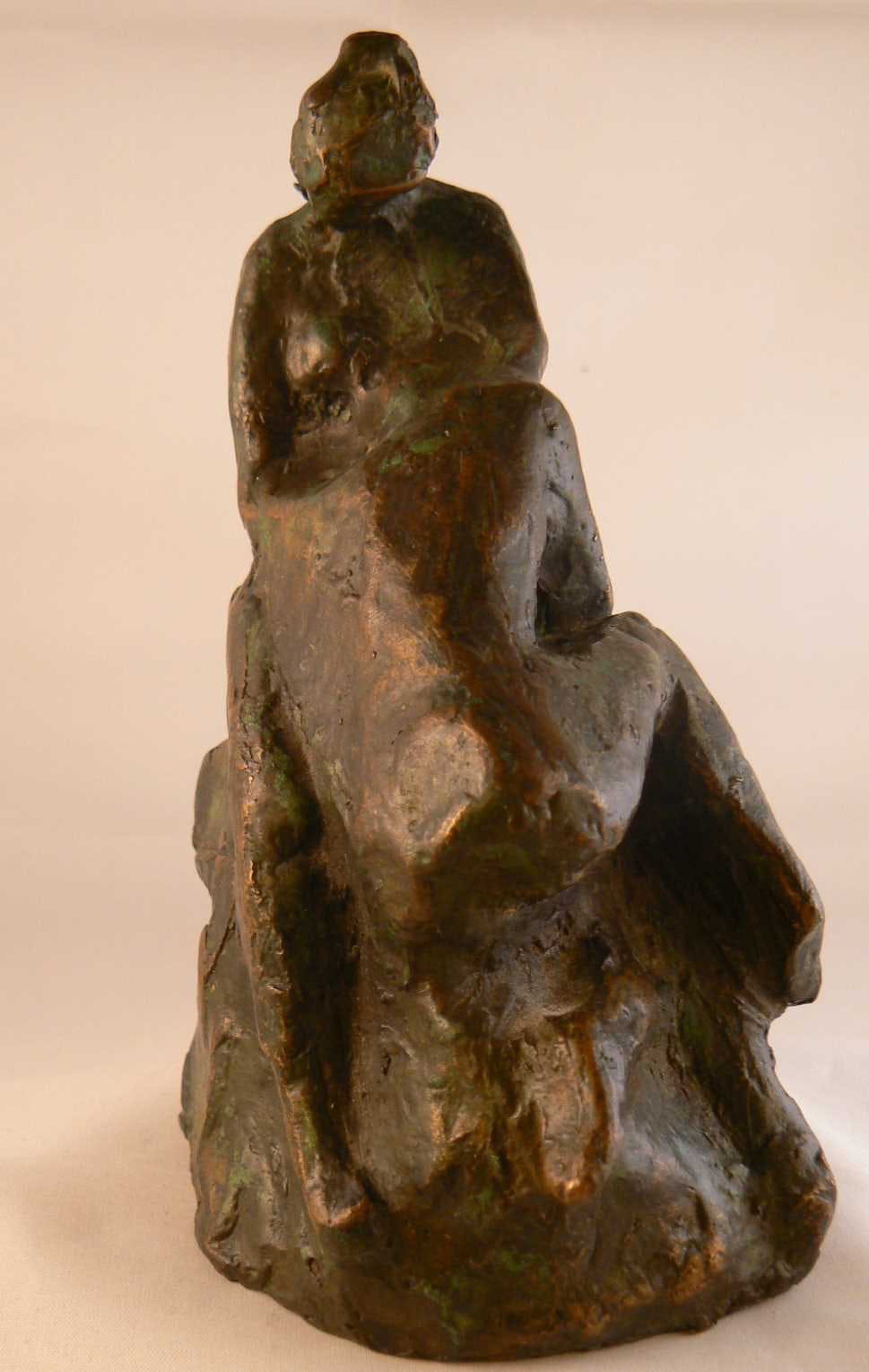 Bronzen beeldje gemaakt door Jits Bakker. Het gaat hier vermoedelijk om een studie in brons voor het bekend beeld Innigheid. Die later is uitgevoerd in Brons groot formaat en in marmer. Zie boek Jits Bakker 1987 ISBN 906216093 pagina 62 en 79 Gesigneerd, wel een beetje onduidelijk gesigneerd omdat het hier om een studie gaat. 14,5 cm hoog 7 cm breed 10 cm lang gewicht ongeveer 990 gram.