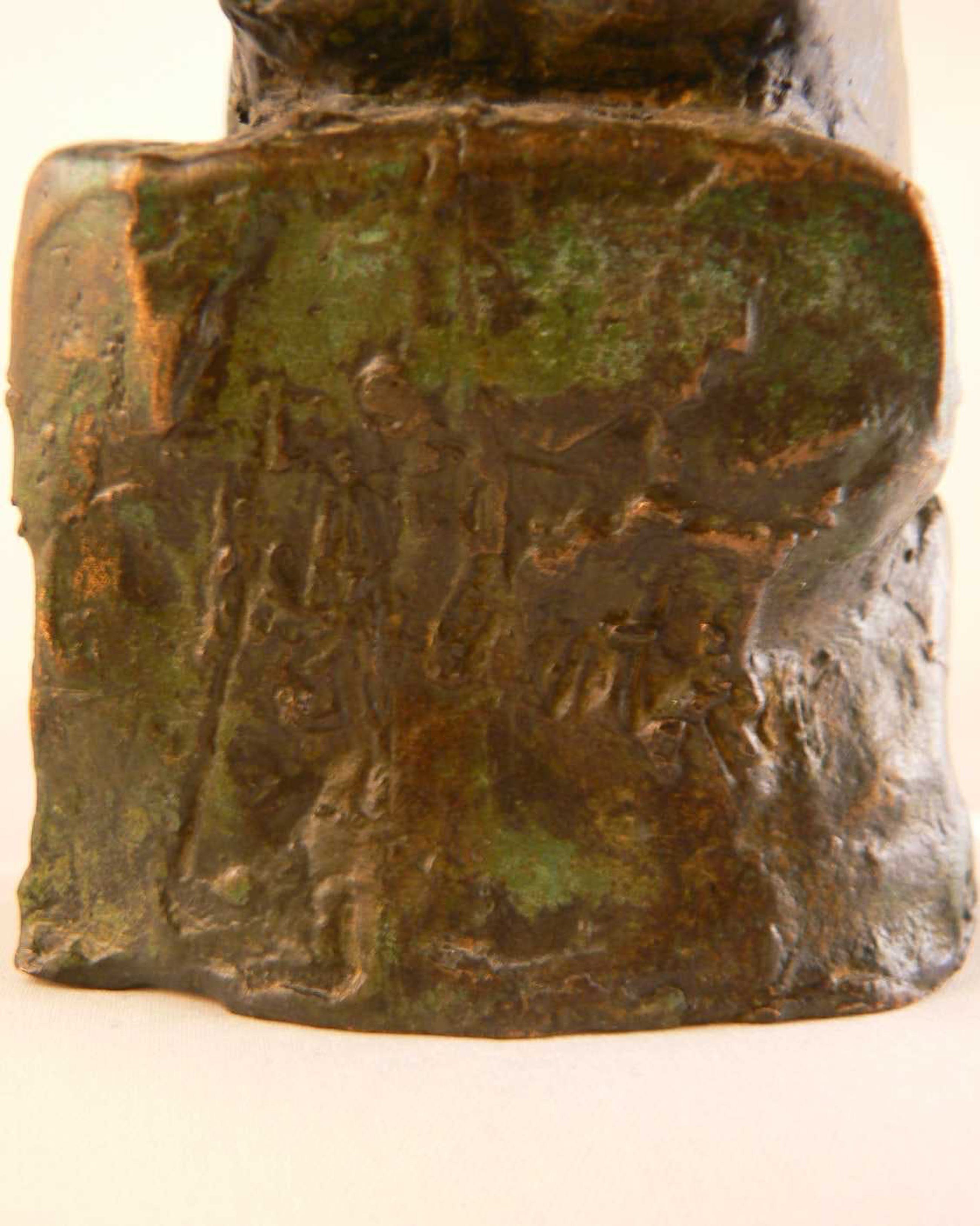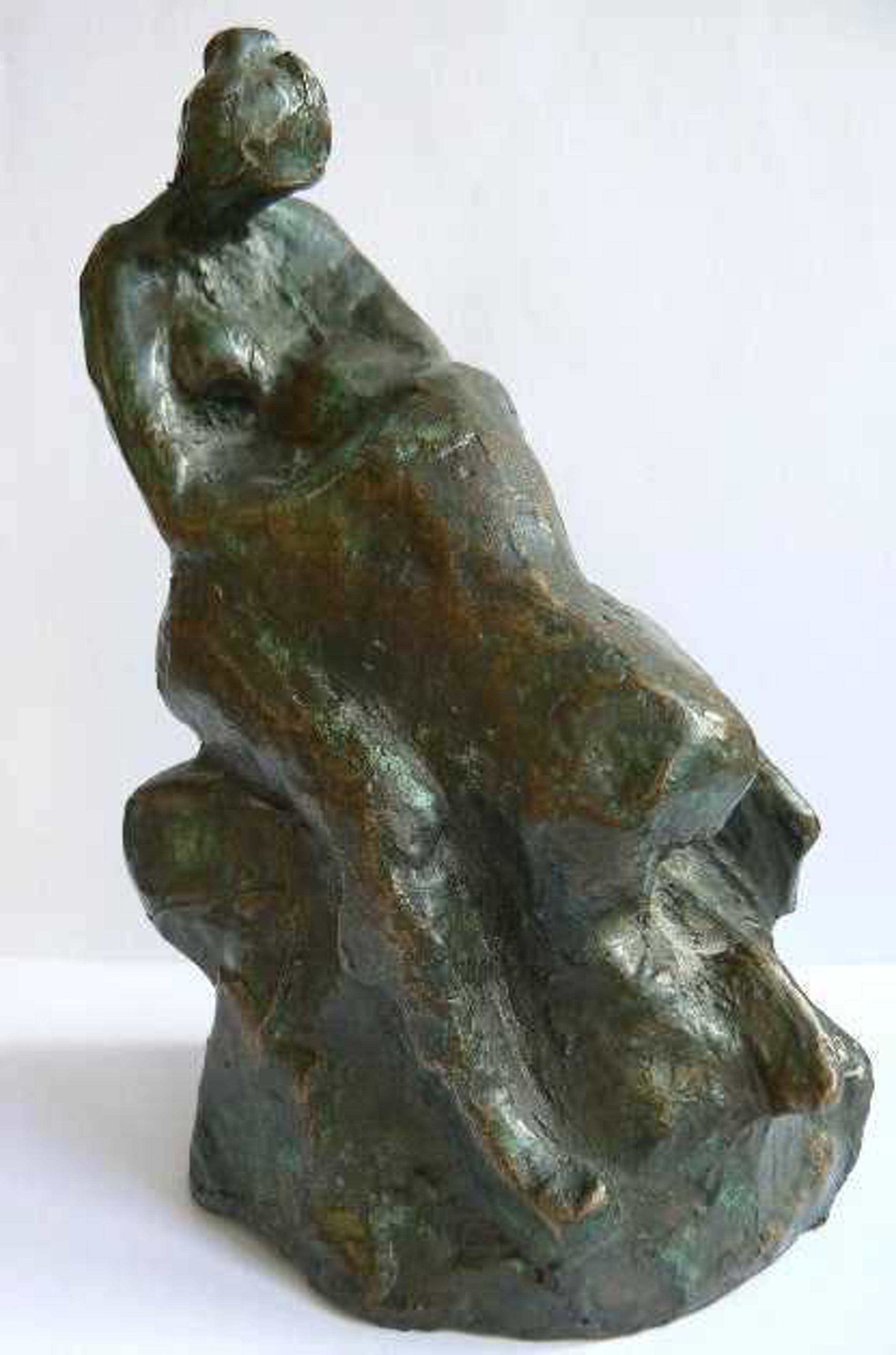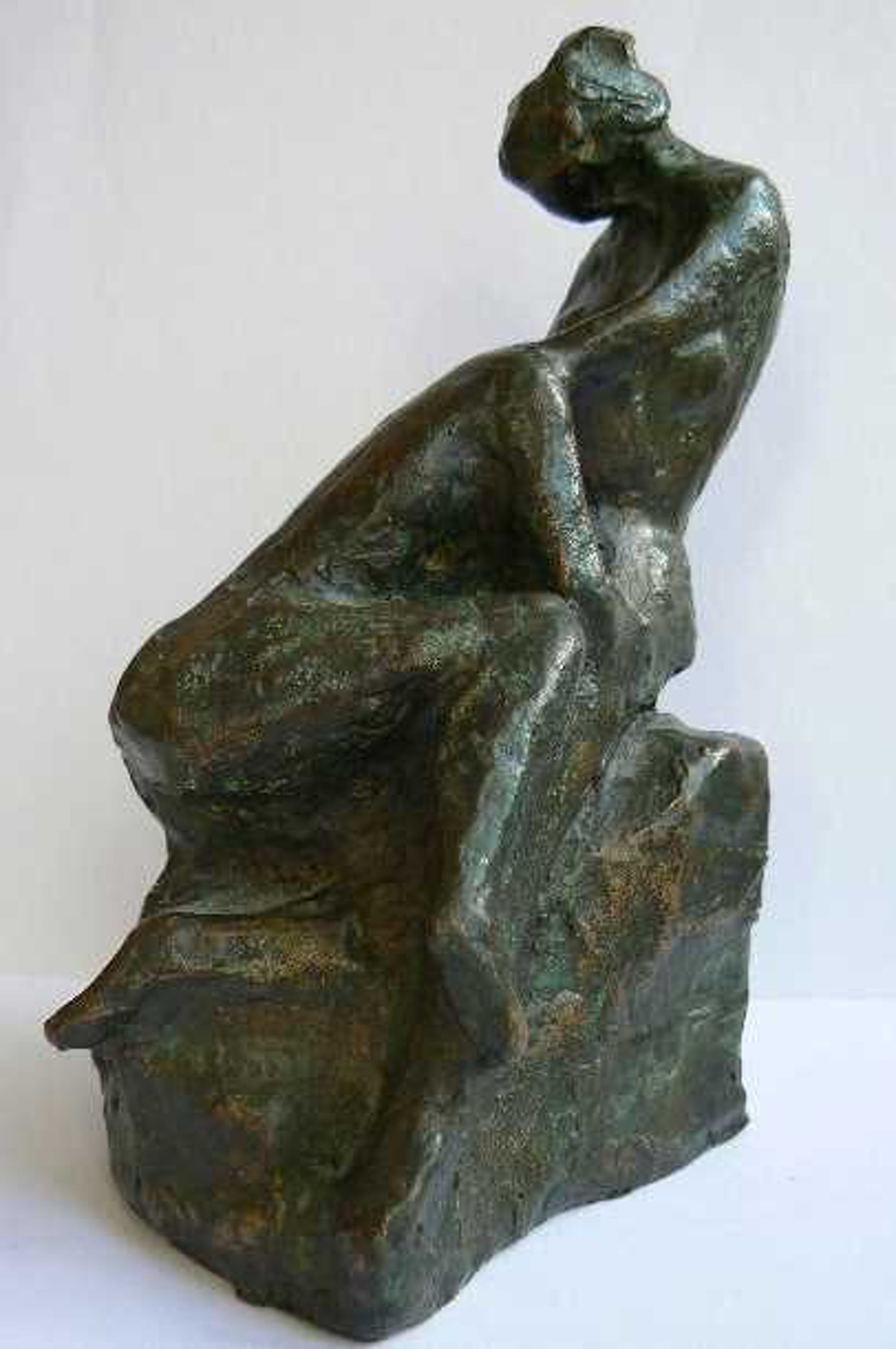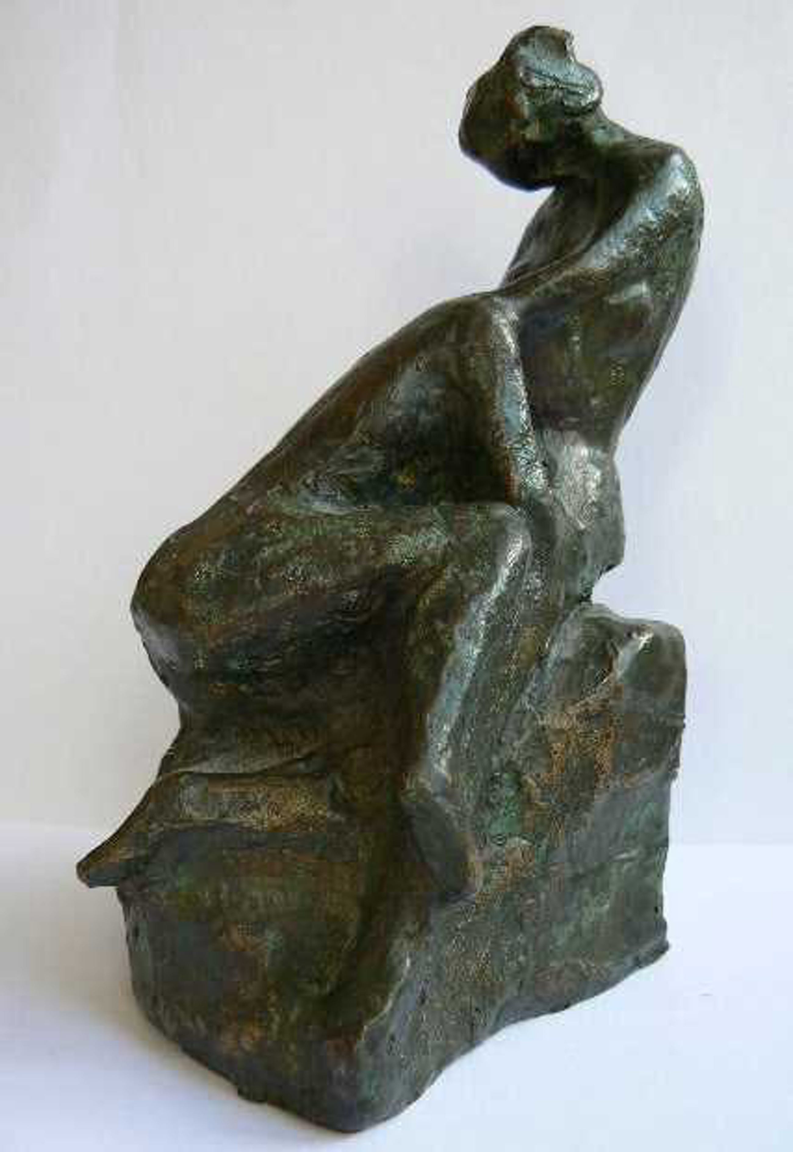 Bronzen beeldje gemaakt door Jits Bakker. Het gaat hier vermoedelijk om een studie in brons voor het bekend beeld Innigheid. Die later is uitgevoerd in Brons groot formaat en in marmer. Zie boek Jits Bakker 1987 ISBN 906216093 pagina 62 en 79 Gesigneerd, wel een beetje onduidelijk gesigneerd omdat het hier om een studie gaat. 14,5 cm hoog 7 cm breed 10 cm lang gewicht ongeveer 990 gram.