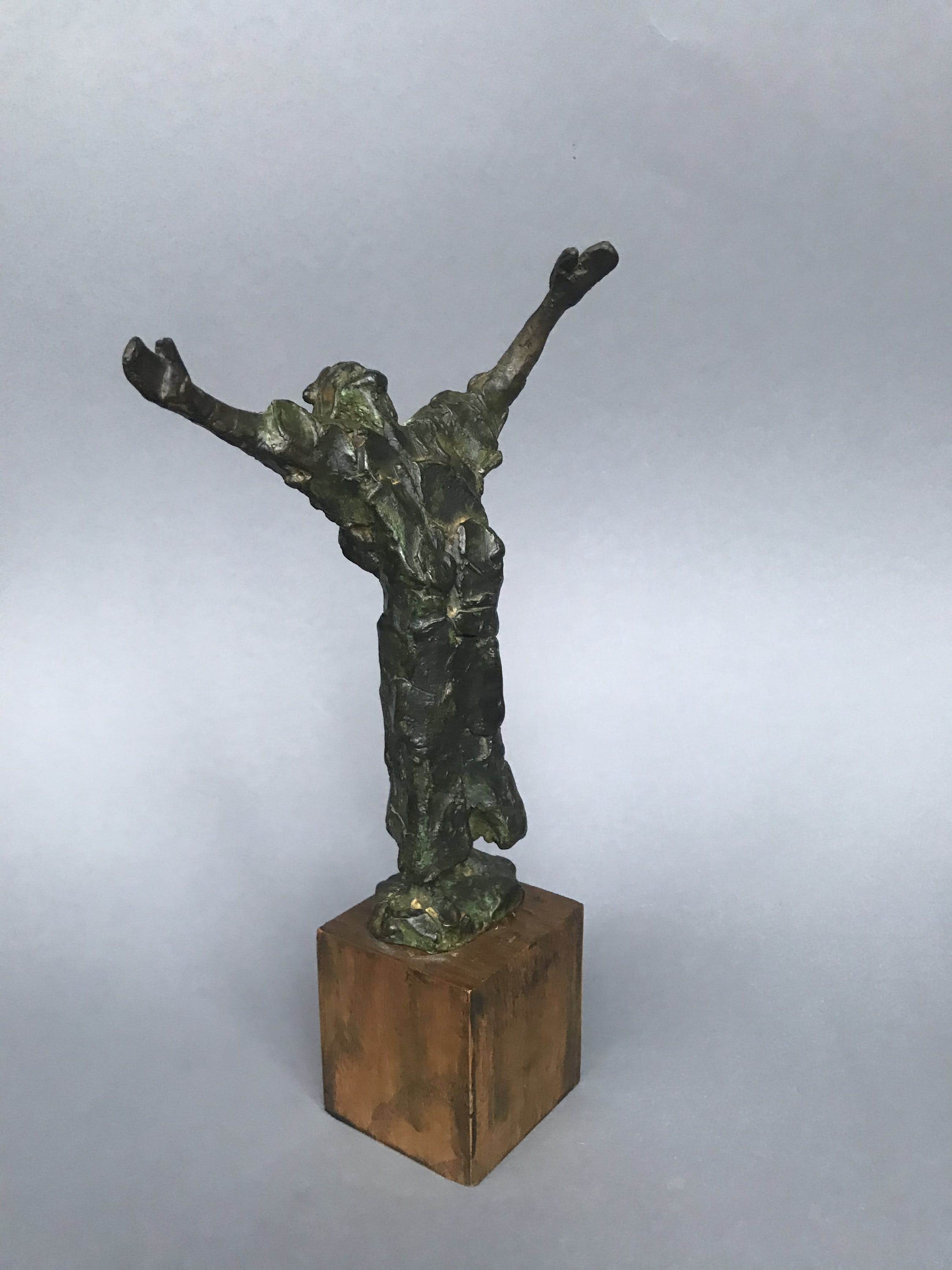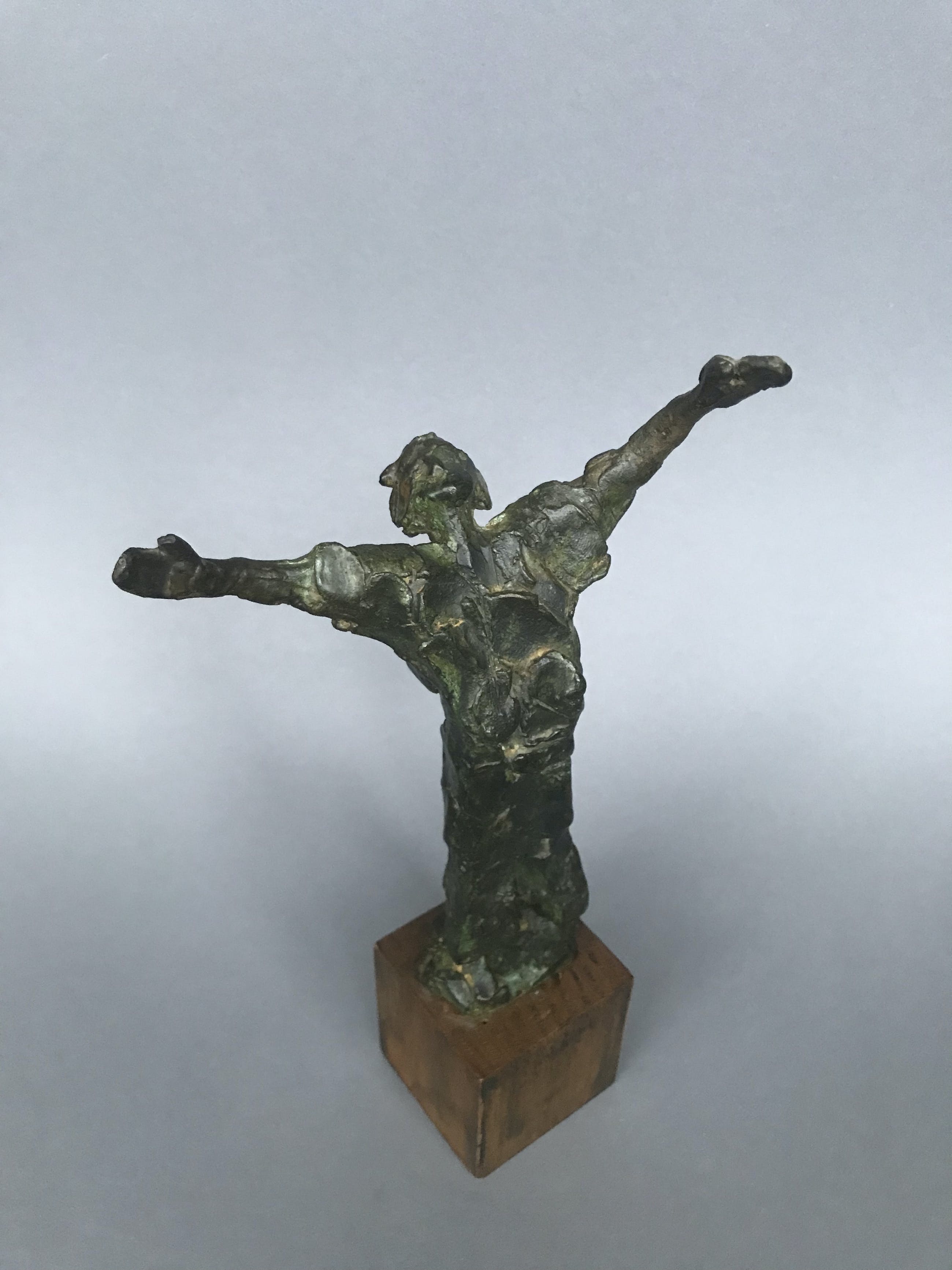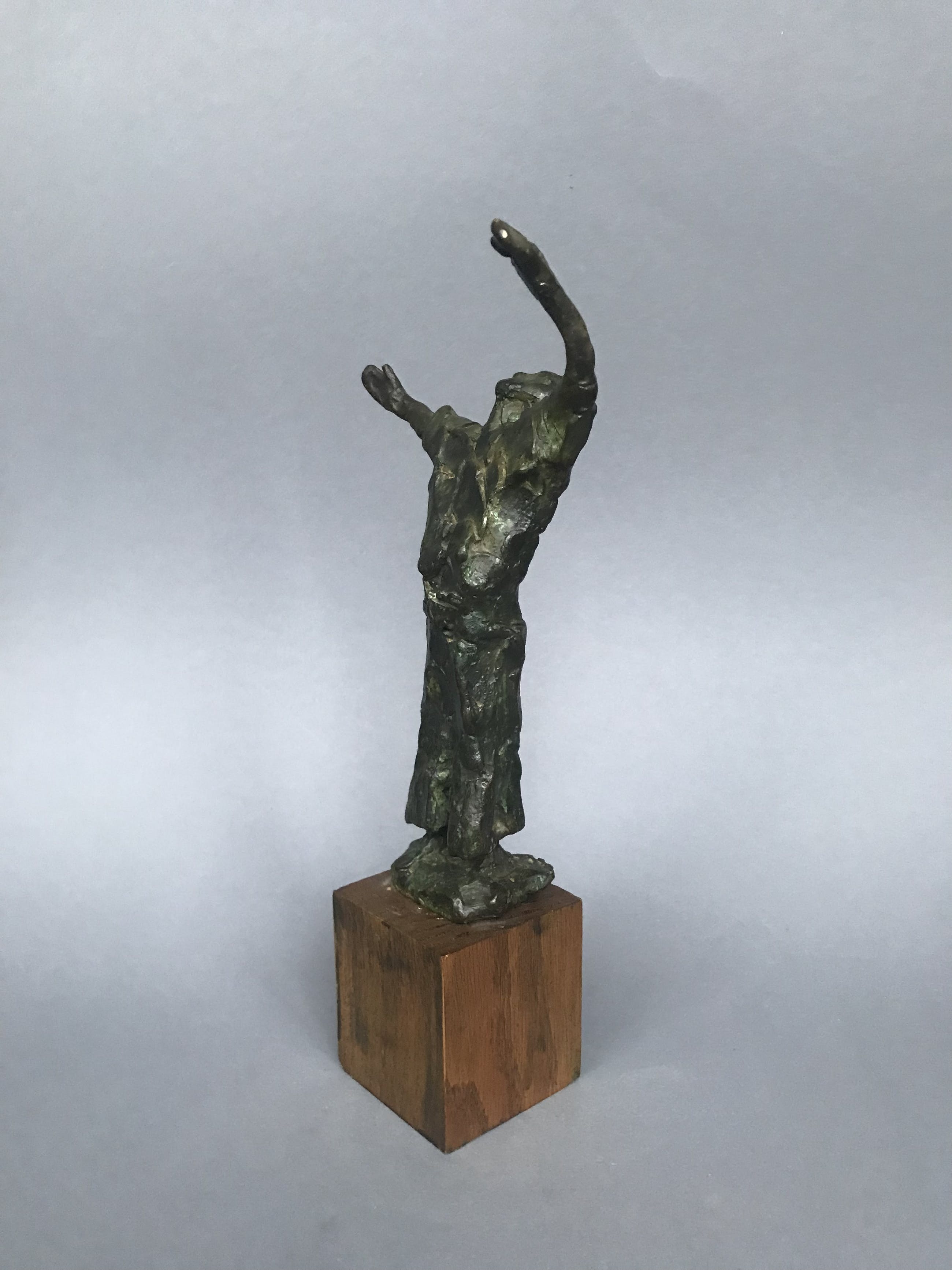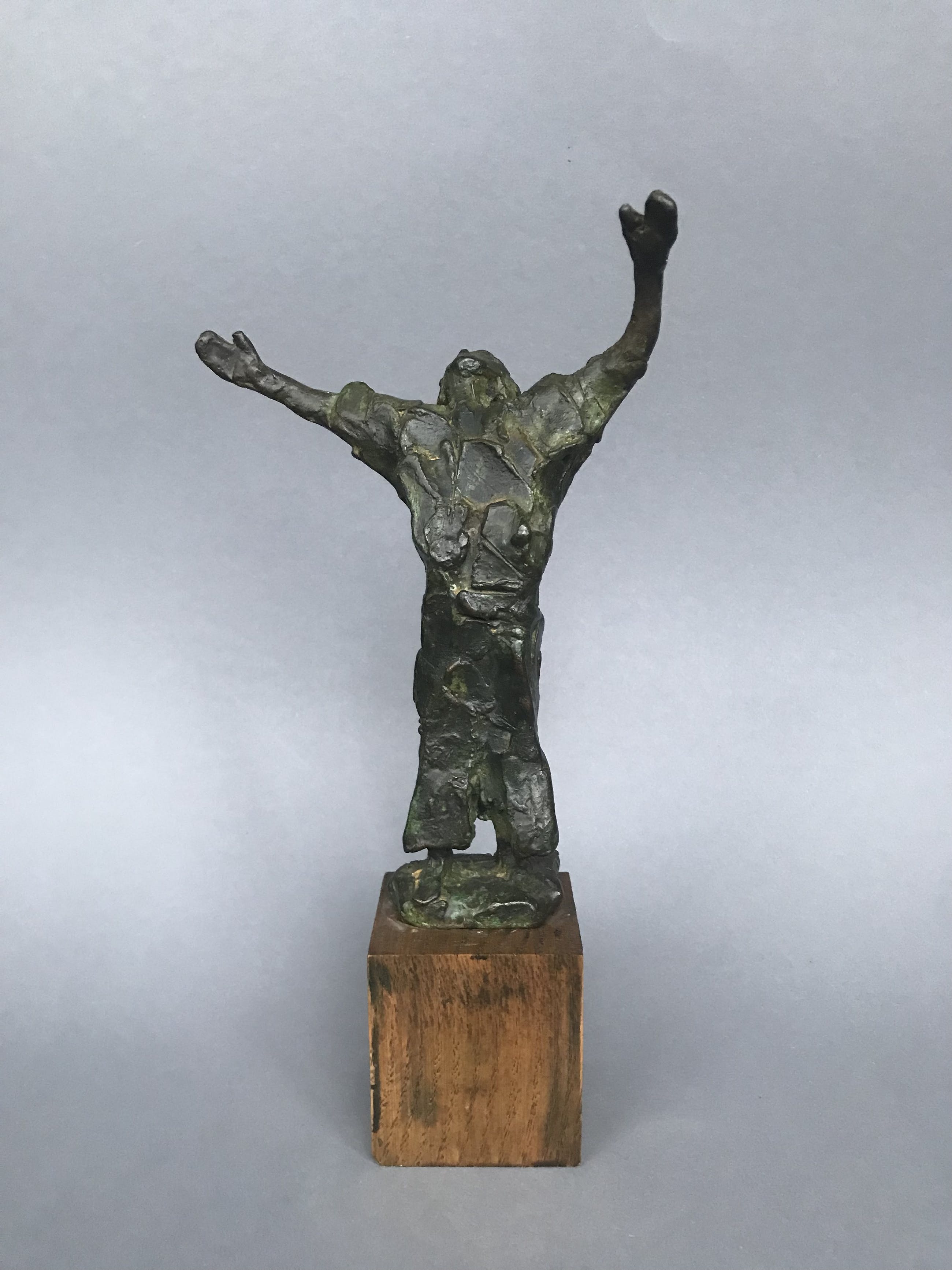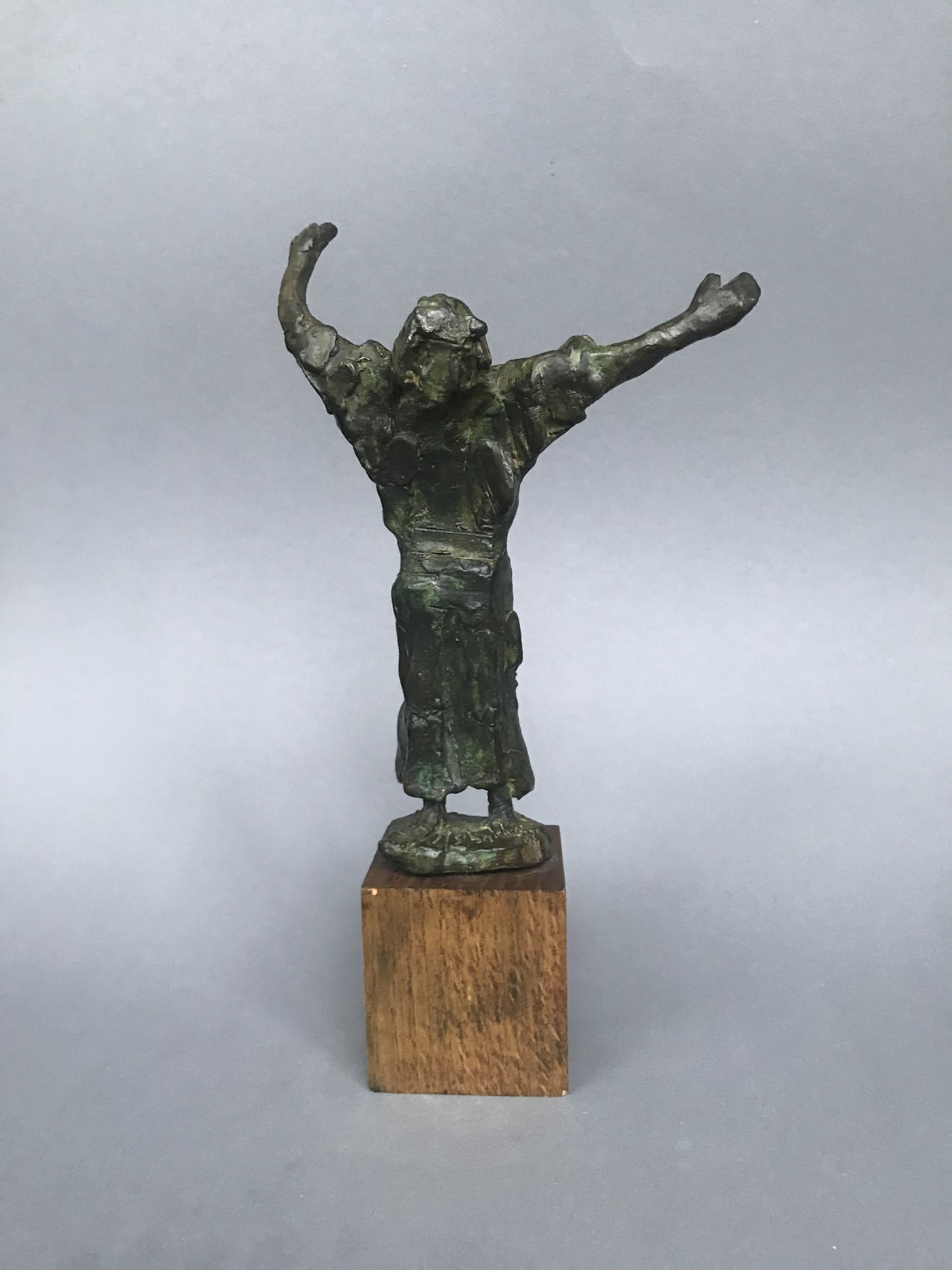 Expressief beeld van Jits Bakker van Johannes de Doper. Prachtige houding en mooie materiaalcombinatie tussen hout en gepatineerd brons.