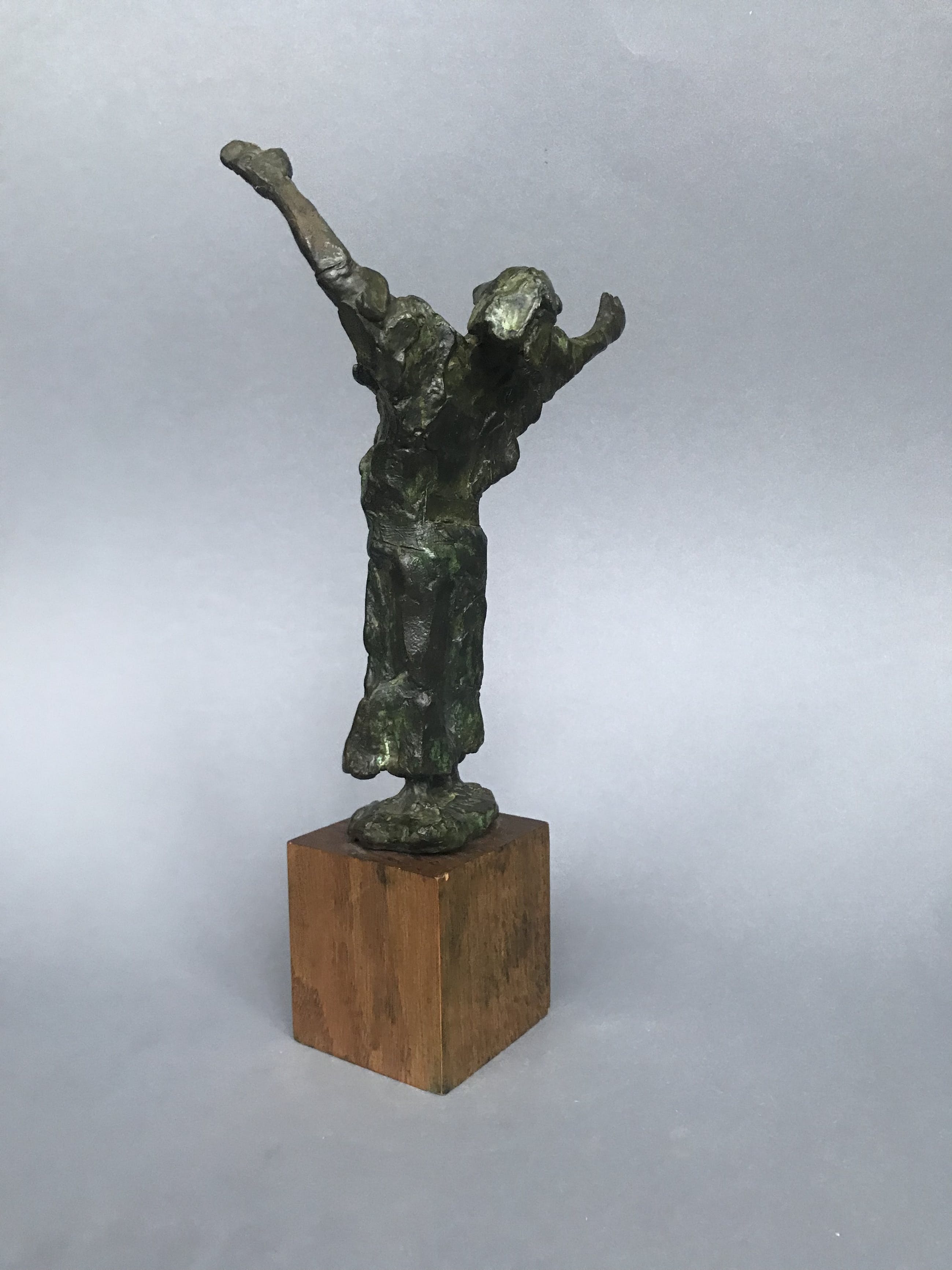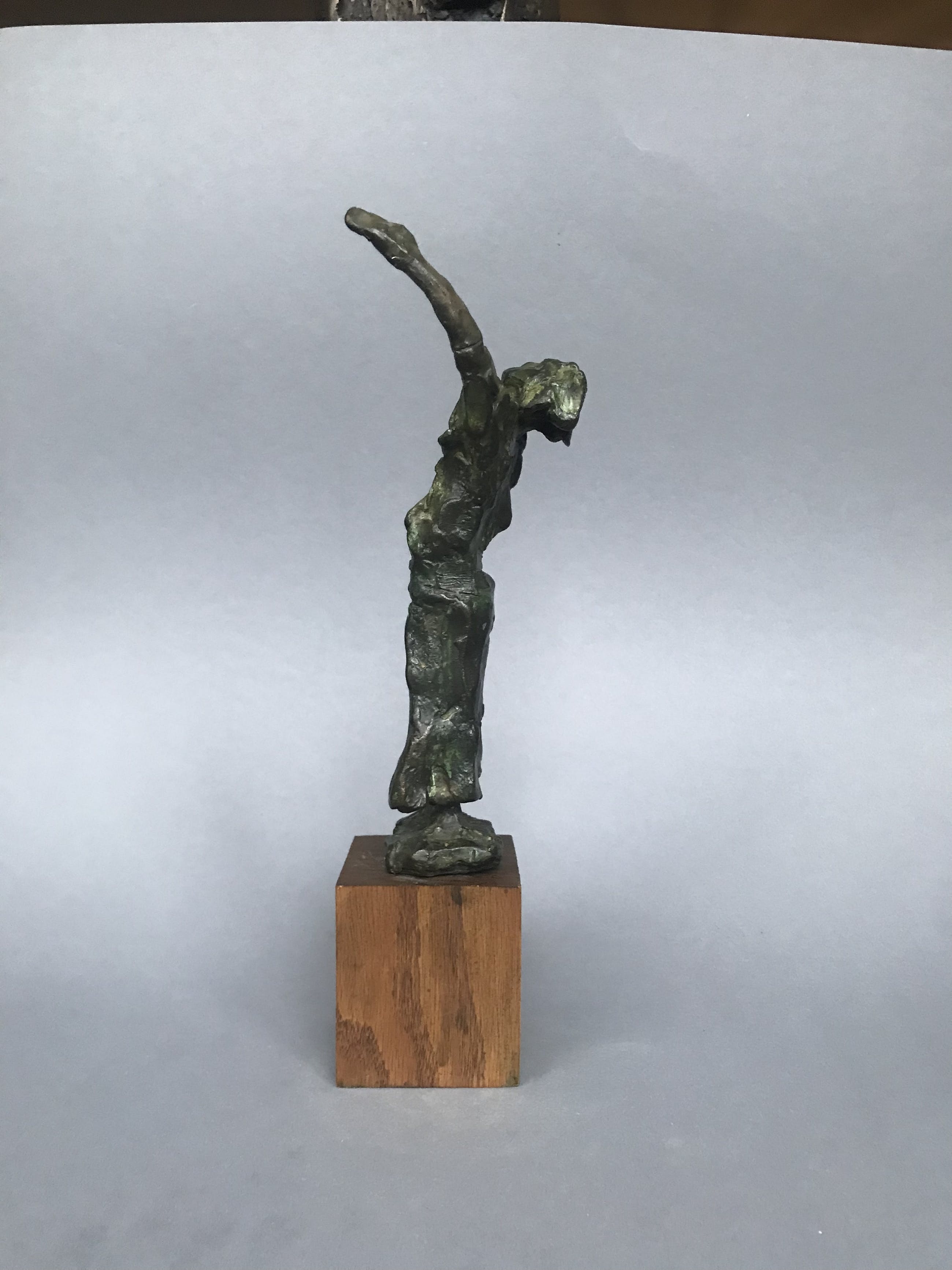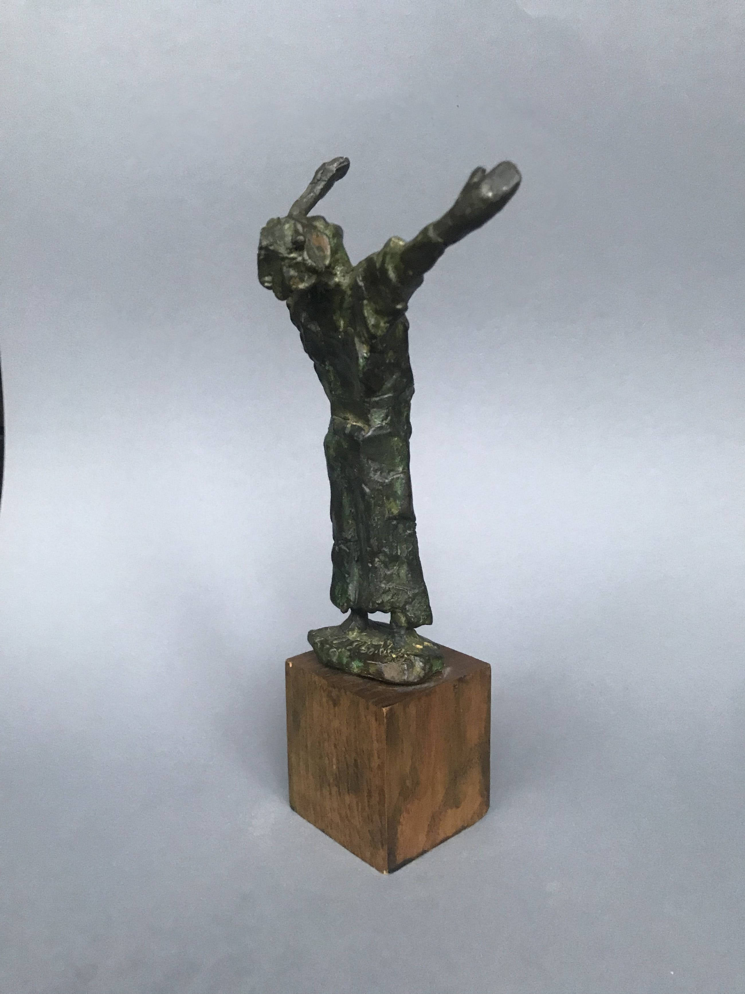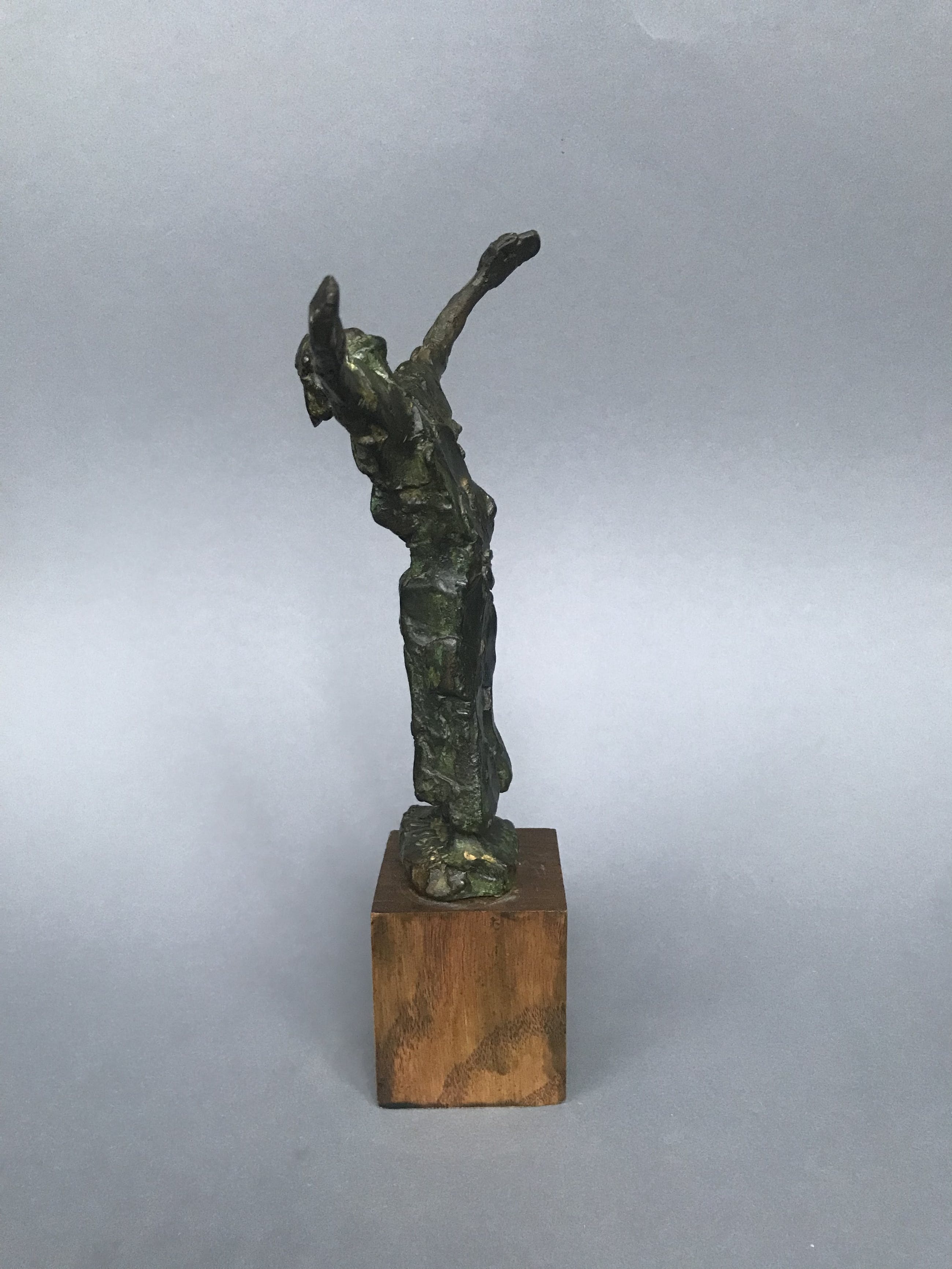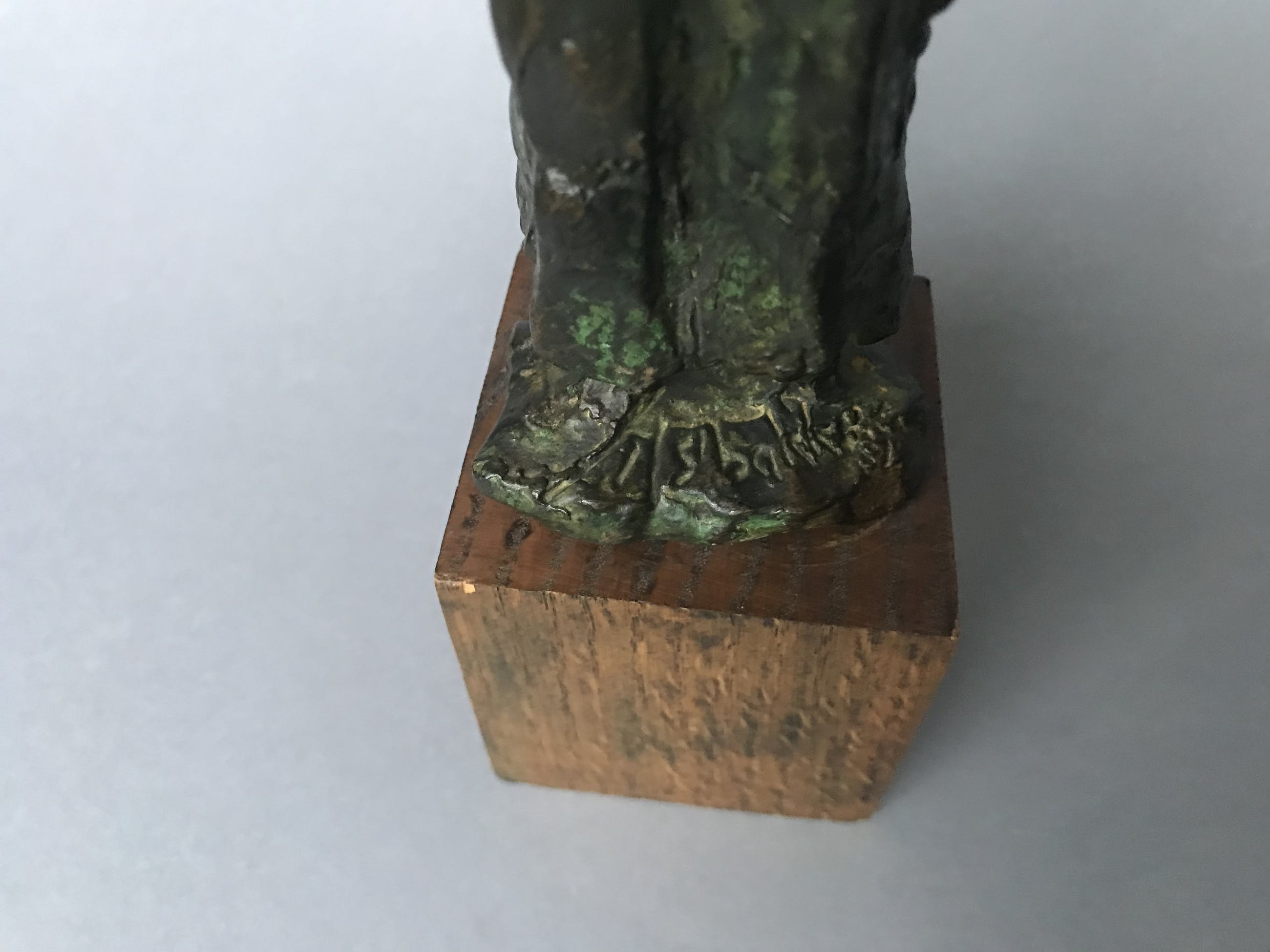 Houten sokkel heeft wat 'verwering' en een rond gaatje bij voet beeld; gepatineerd brons van beeld in uitstekende staat. Beetje ruimte tussen voet en sokkel (zie laatste foto).