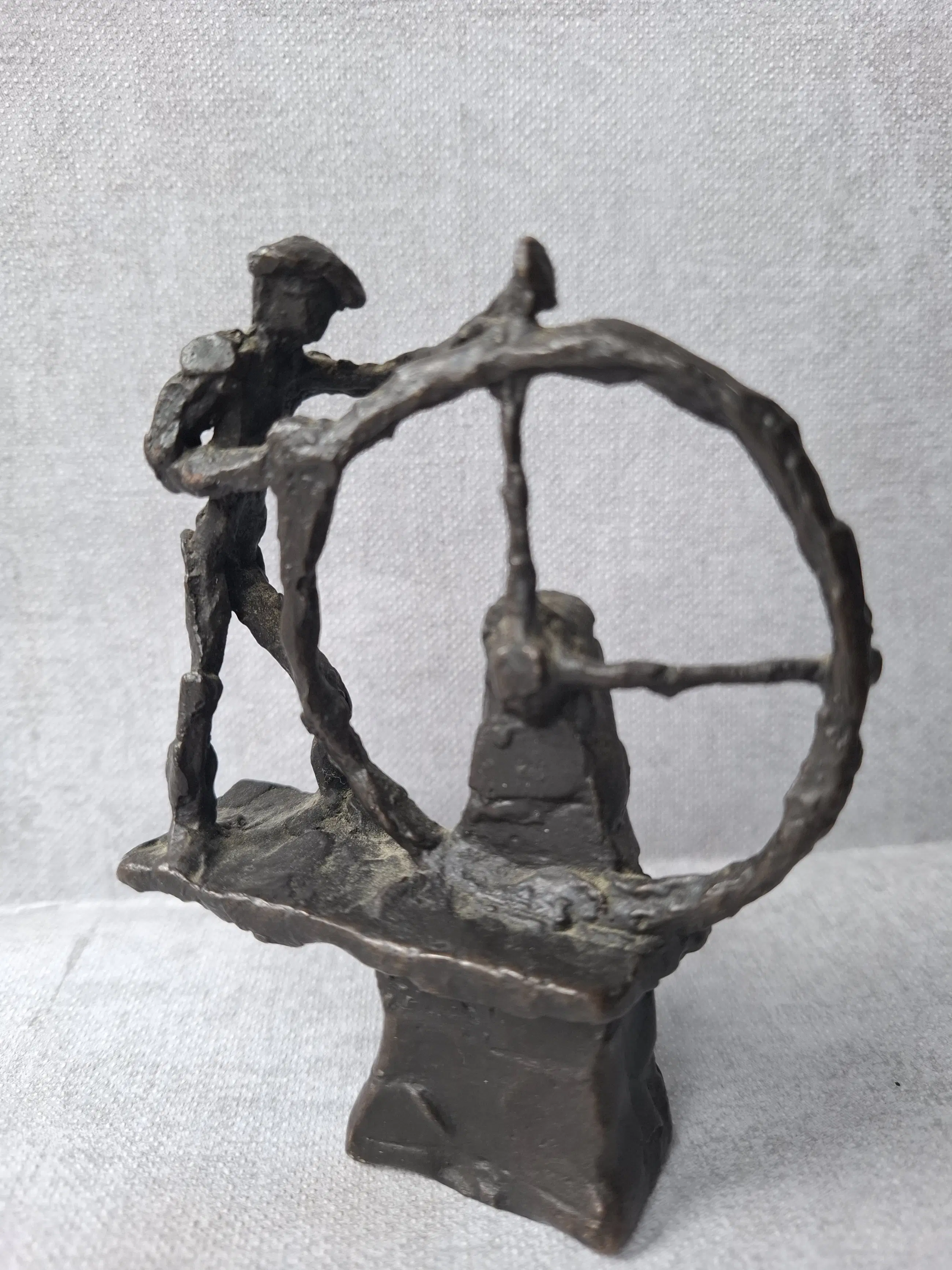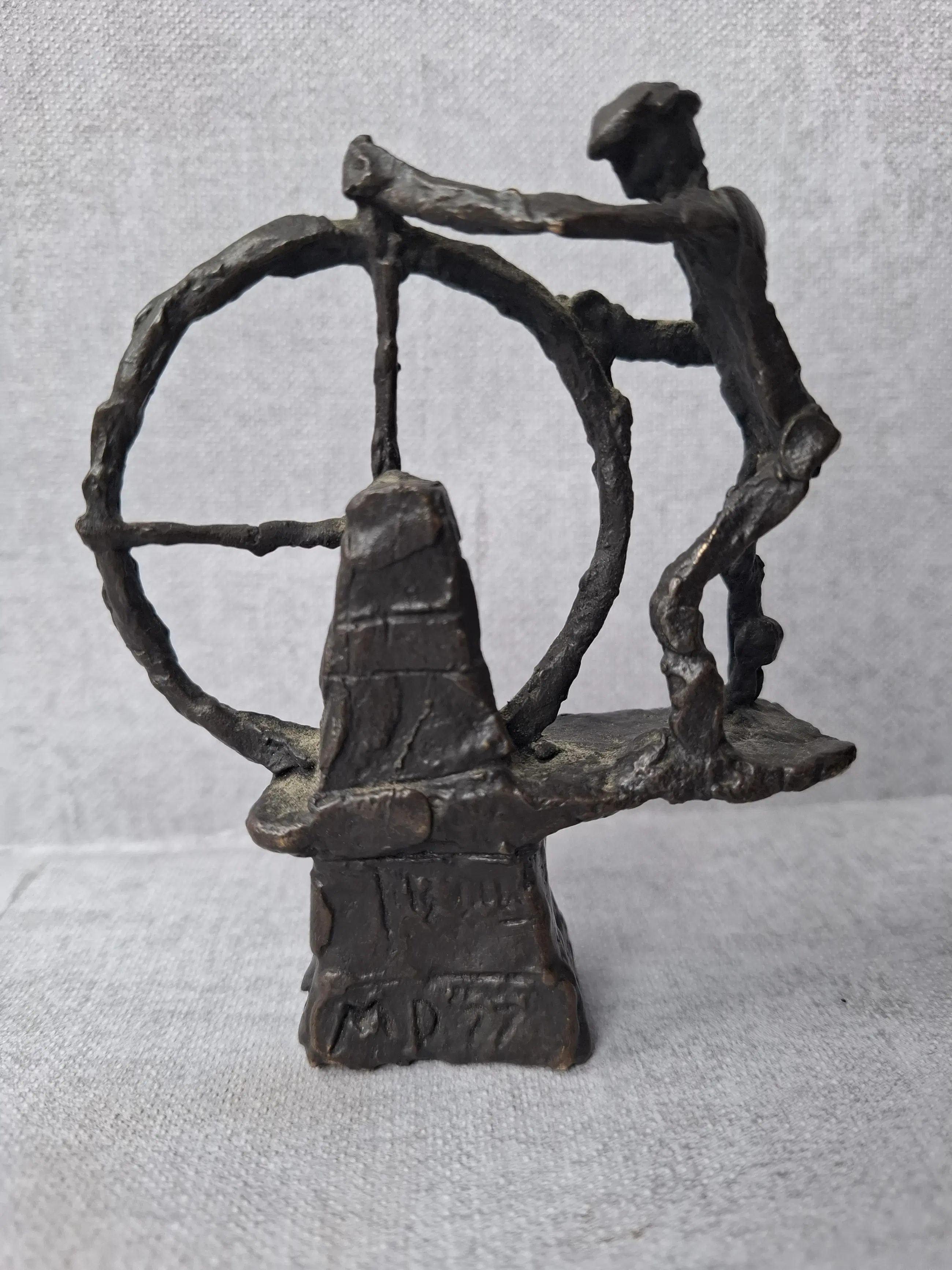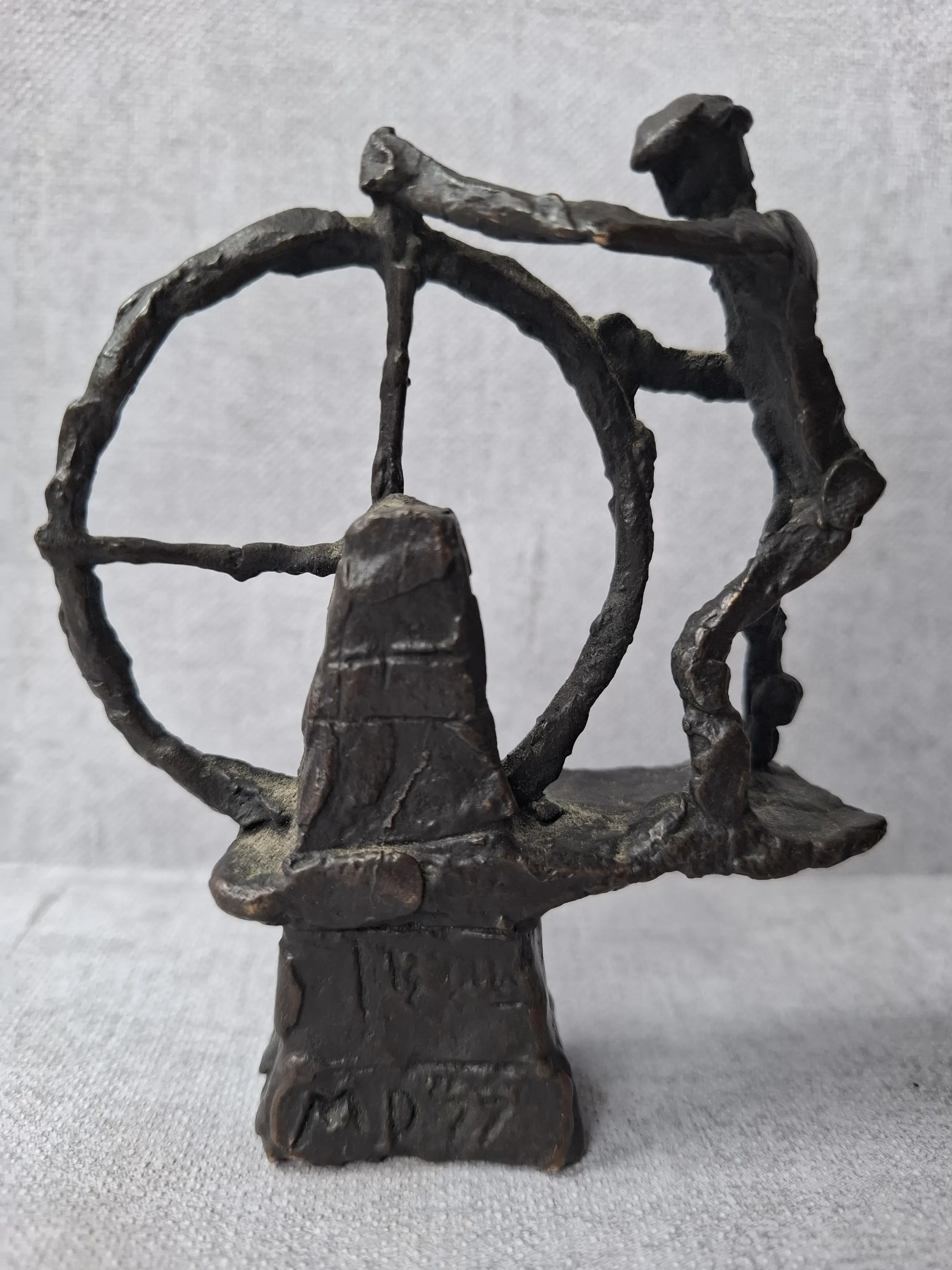 Mooi fijn en klein sculptuur van Jits Bakker. Voorstellend een sluis wachter. Gesigneerd en de tekst MD ( Maas en Dommel?)