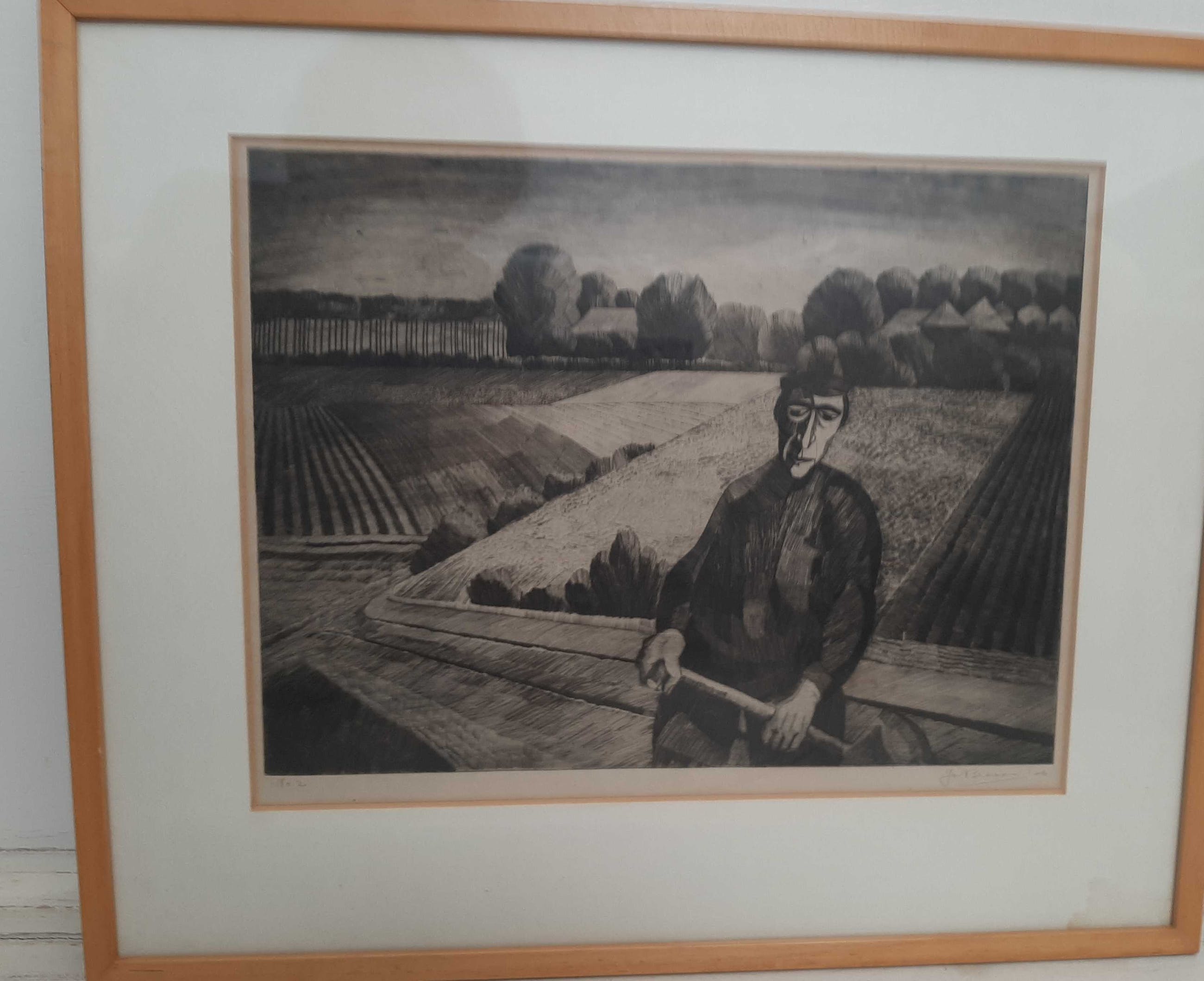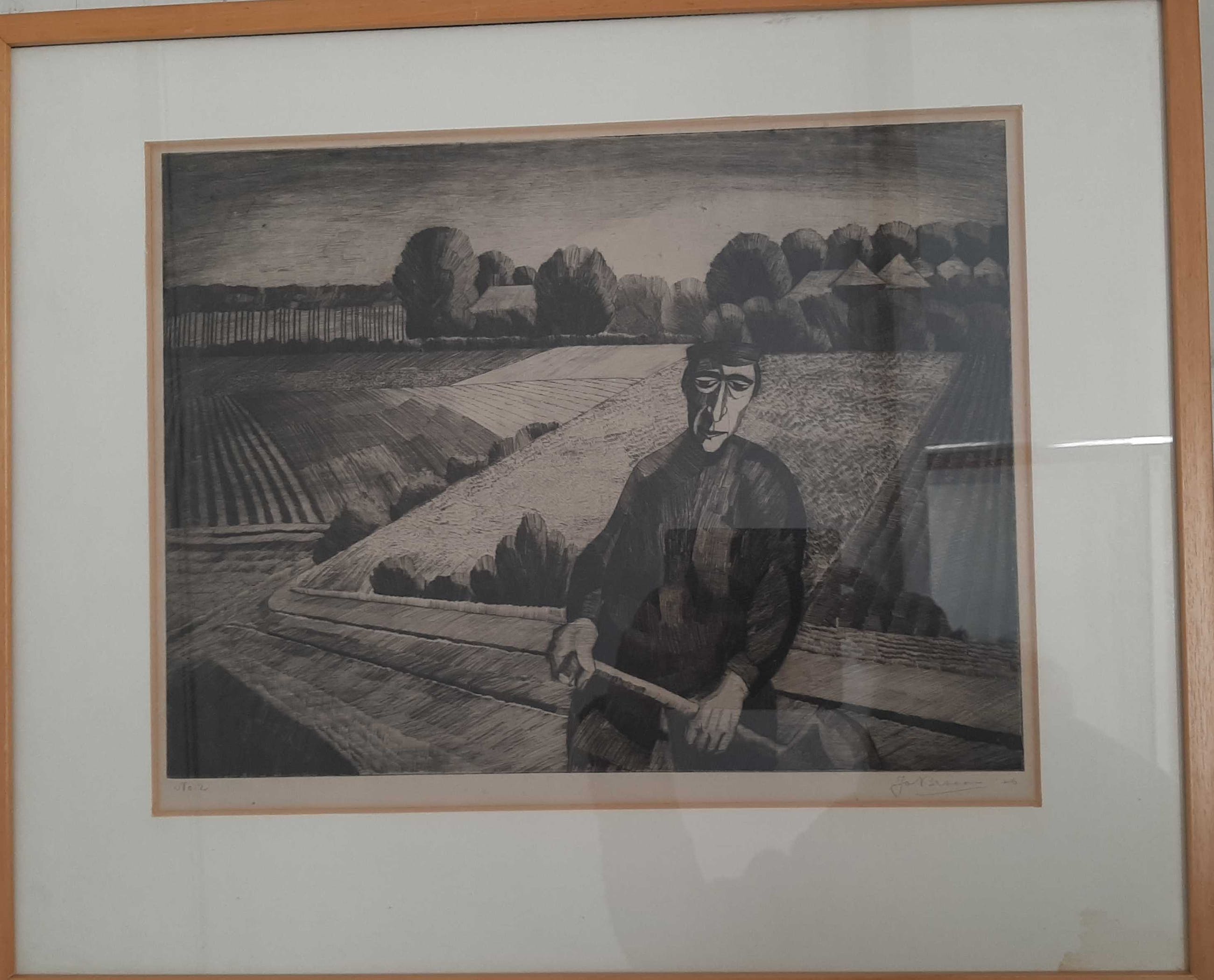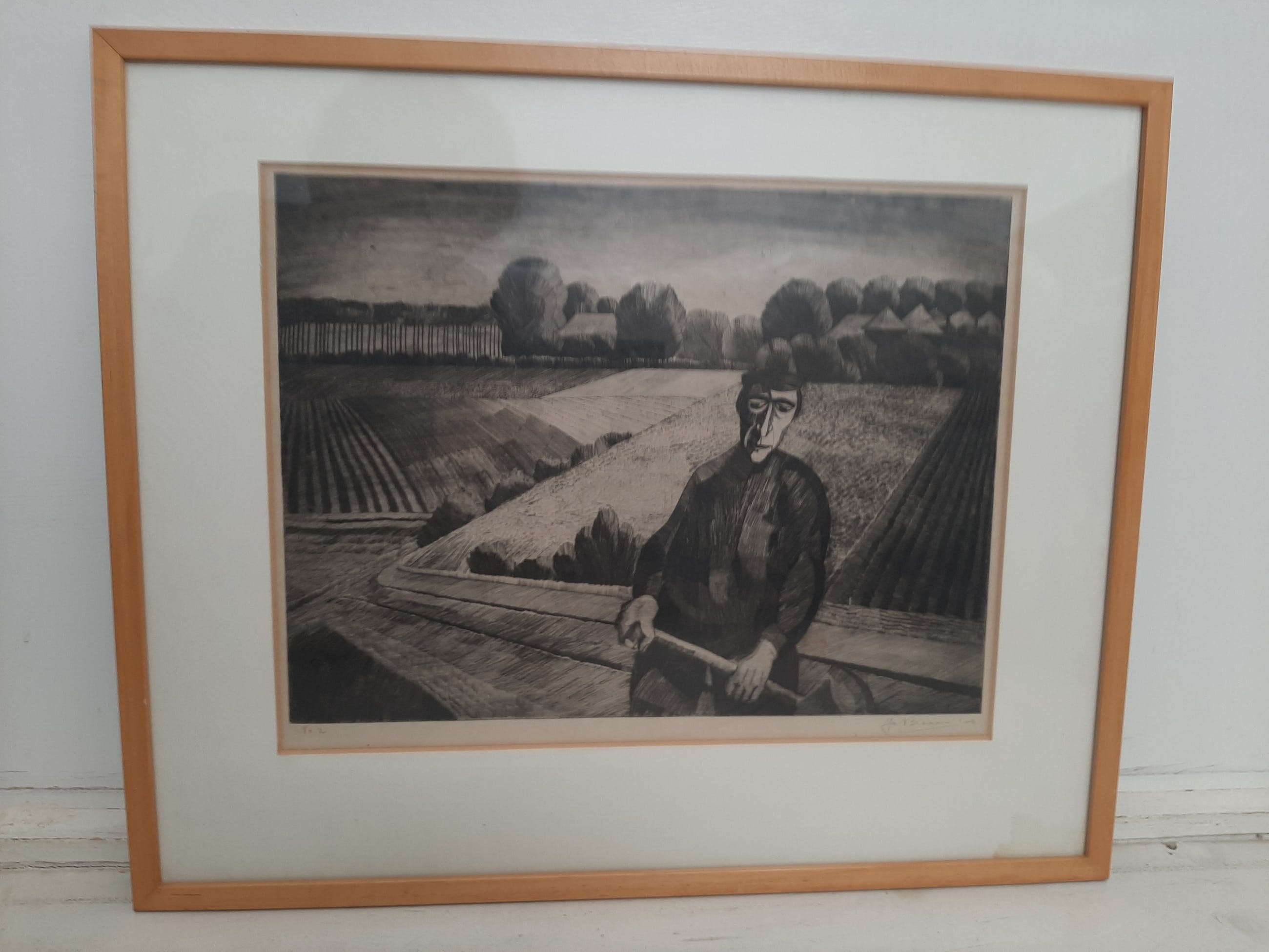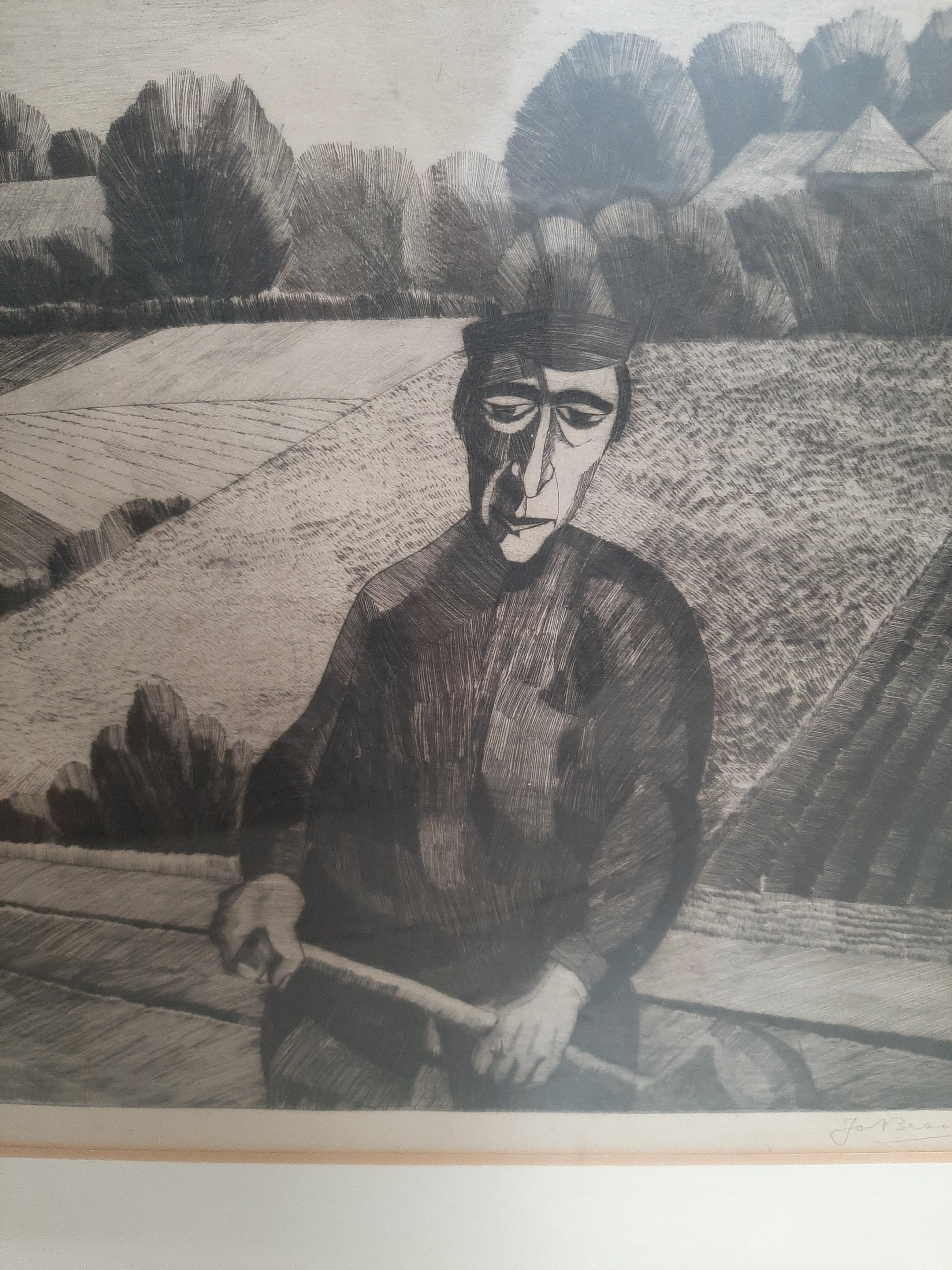 Deze prachtige sfeervolle droge naald van Jo Bezaan verbeeldt de hardwerkende boer op zijn land. Jo Bezaan koos vaak het boerenleven, de boer, zijn dieren en zijn land als onderwerp. Ook verbeeldde hij vrouwen en meisjes in klederdracht.