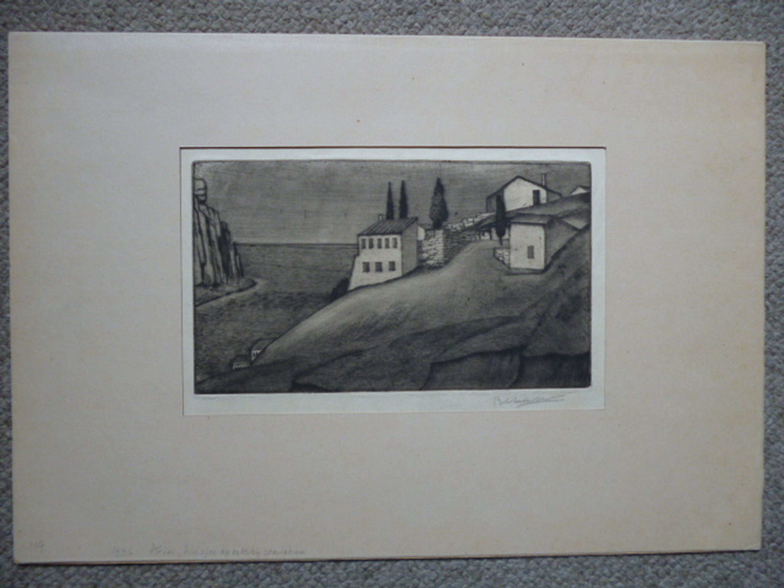 Droge naald, getiteld Krim, huisjes op rots bij zee-inham.