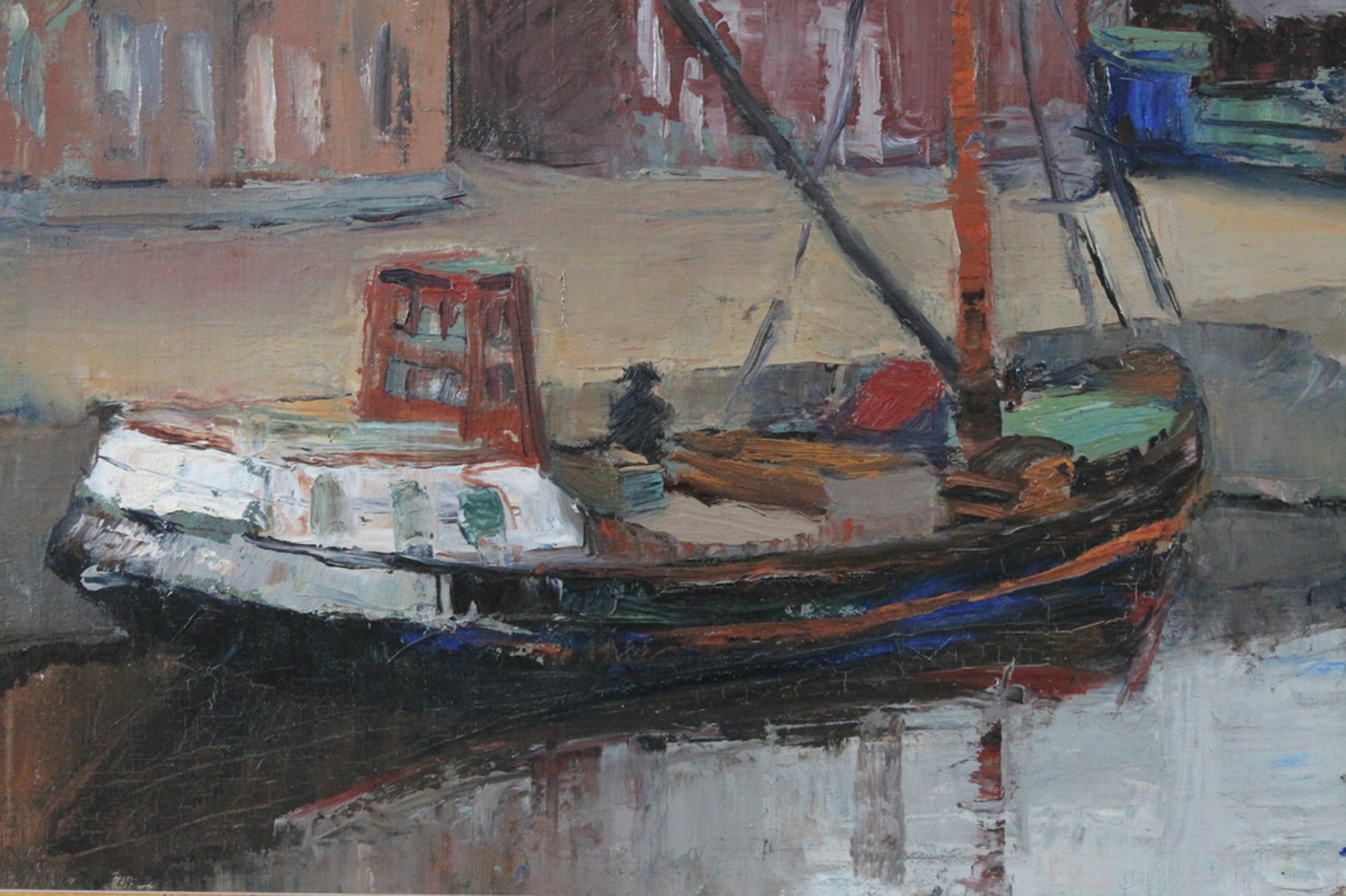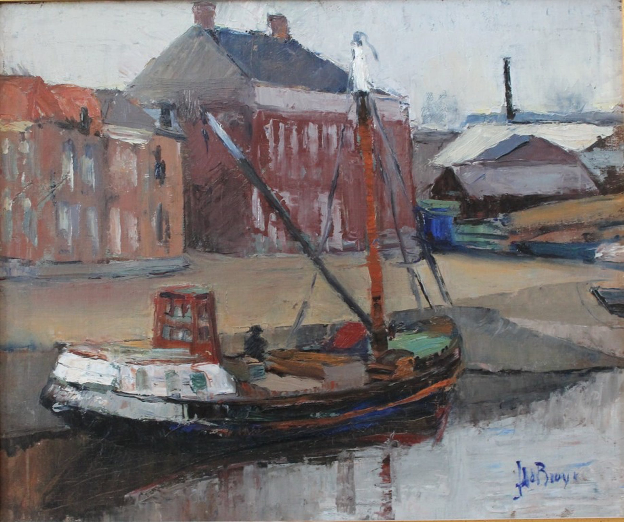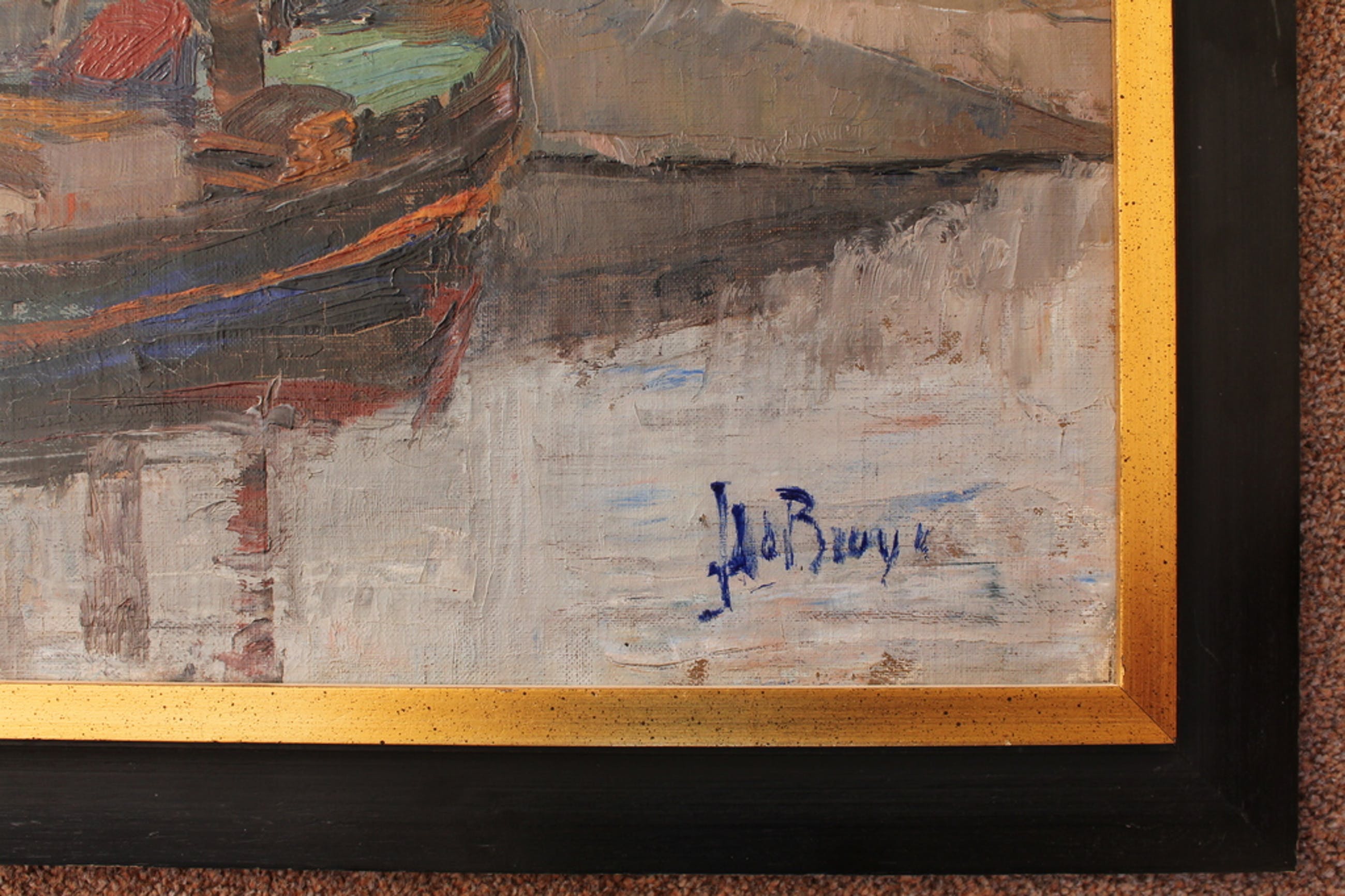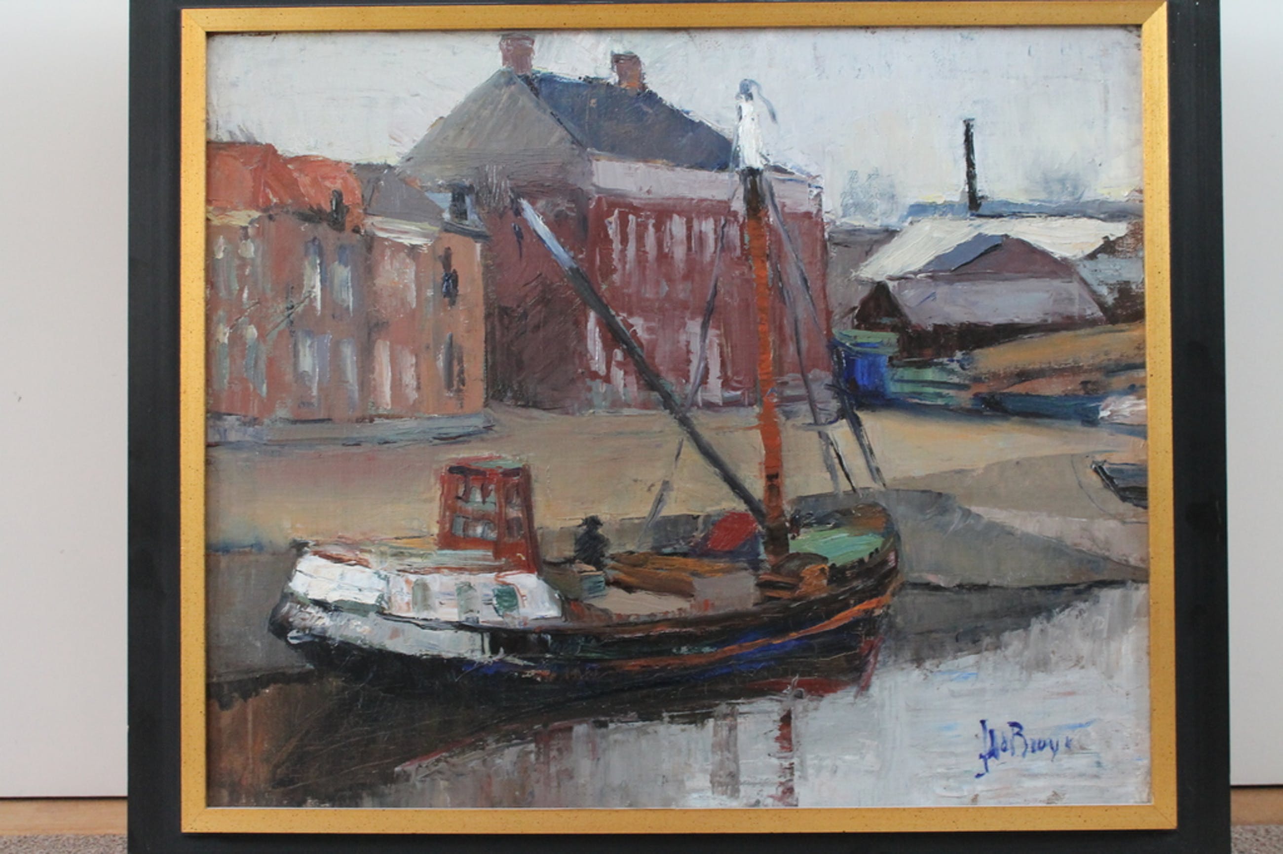 Wordt niet opnieuw aangeboden! Een zeldzaam werk van Jo de Bruyn! Geboren in Bergen op Zoom, studeerde zij te Antwerpen en vertrok toen naar Indonesië, waar ze leefde van haar schilderijen. Later ging ze ook beeldhouwen. Al haar kunst ligt tussen 'impressie en expressie", goed ook te zien in dit schilderij. Ze neigde in haar schilderijen steeds naar het twee-dimensionale, geen dieptewerking, door kleurvlakken naast elkaar te plaatsen die in het typisch Vlaamse koloriet der oude meesters licht en donker moeten suggereren.