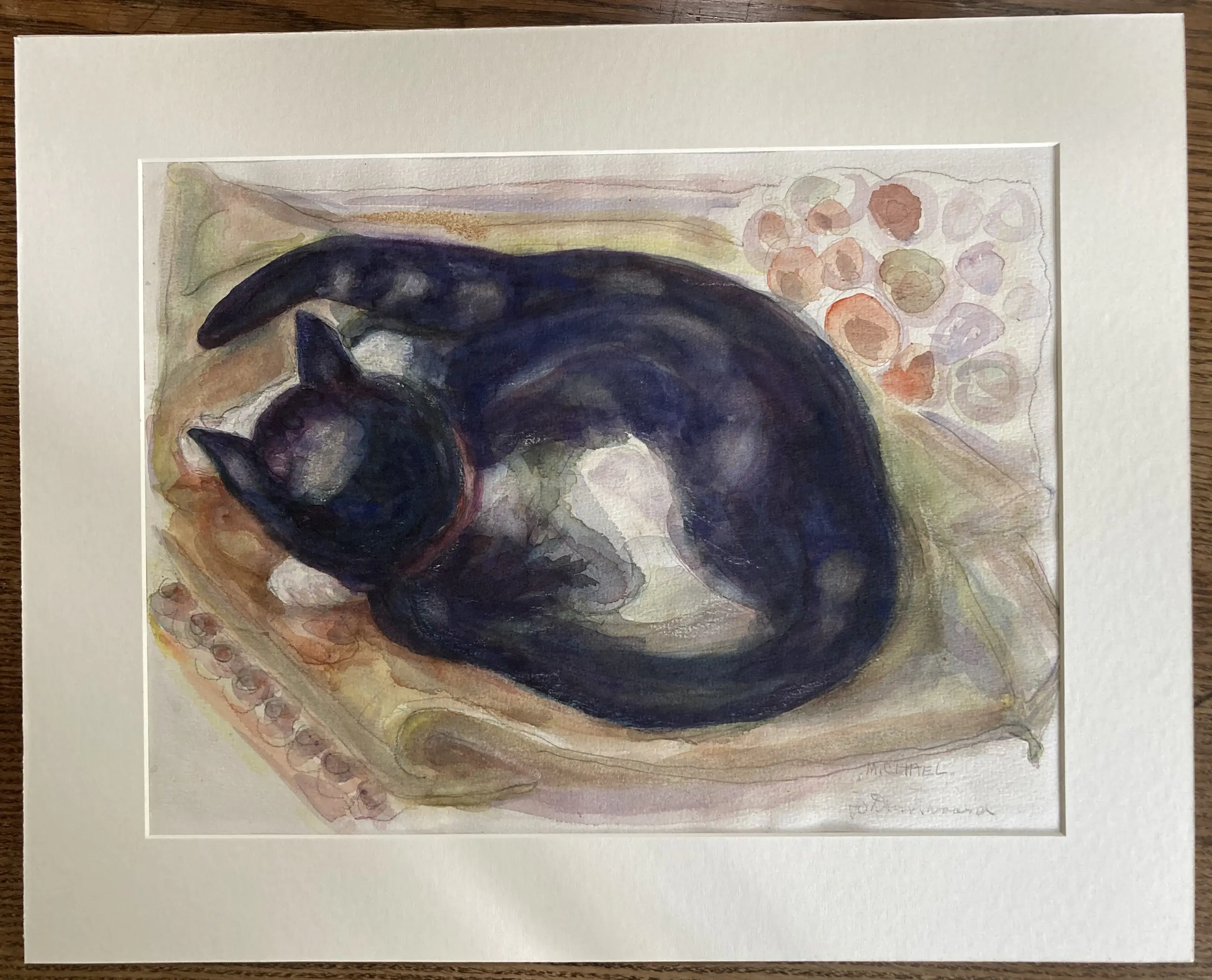 Gesigneerd met potlood, titel Michael. Op de originele lijst vermeld: Jo Drinkwaard, Zeilstraat 27 Scheveningen. Jo Drinkwaard tekende veel huisdieren, honden en katten.