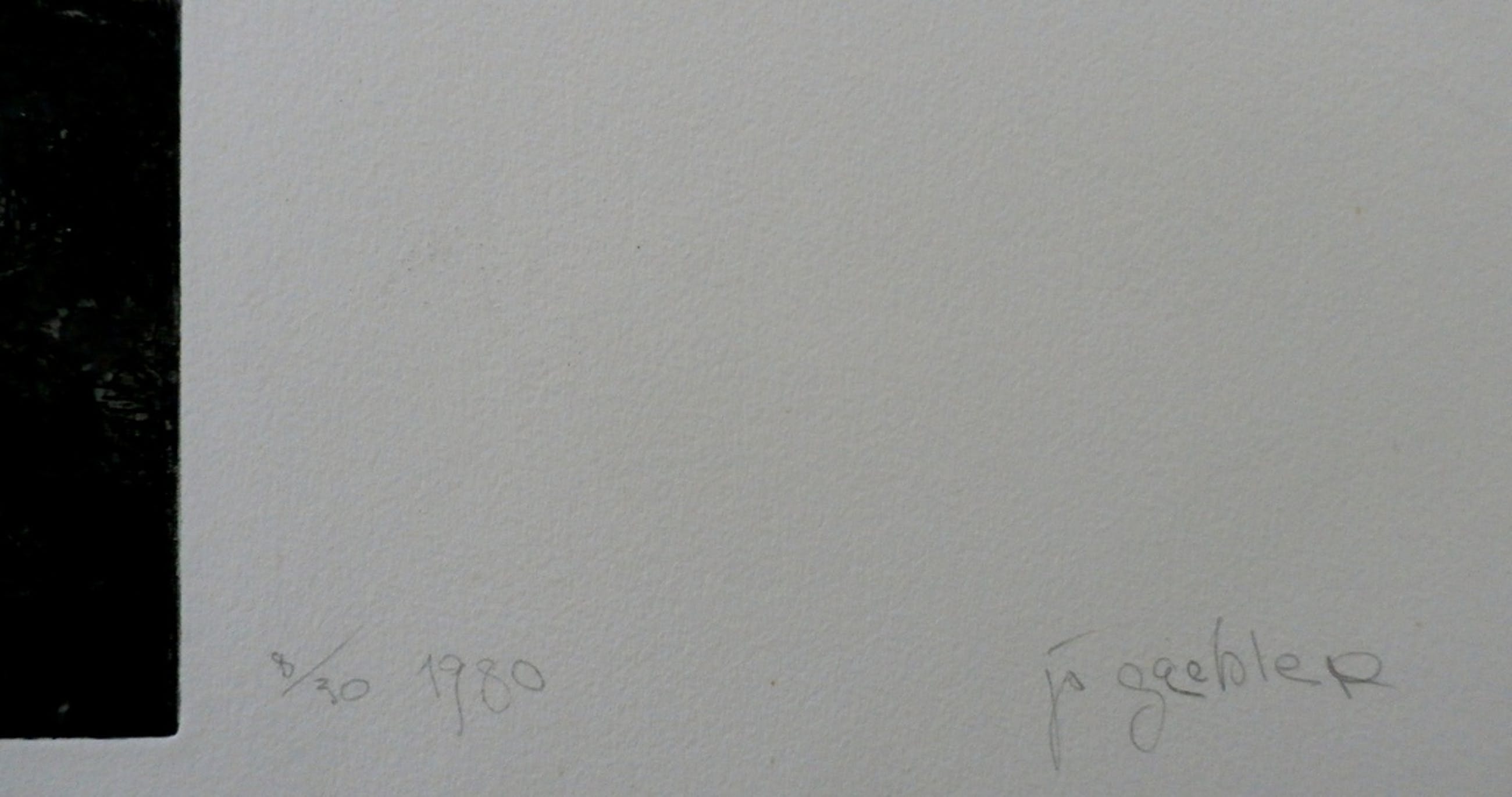 4 etsen op 1 blad van Jo Gaebler uit 1980. Nummer: 8/30. Afmetingen blad: H78,5 x b53,5cm. Afmetingen ets: H15 x b20 cm (per ets). Herkomst: collectie ABN AMRO. De authenciteit van het, aangeboden, werk wordt voor 100% gegarandeerd. Een certificaat van echtheid kan, op aanvraag, worden meegestuurd.