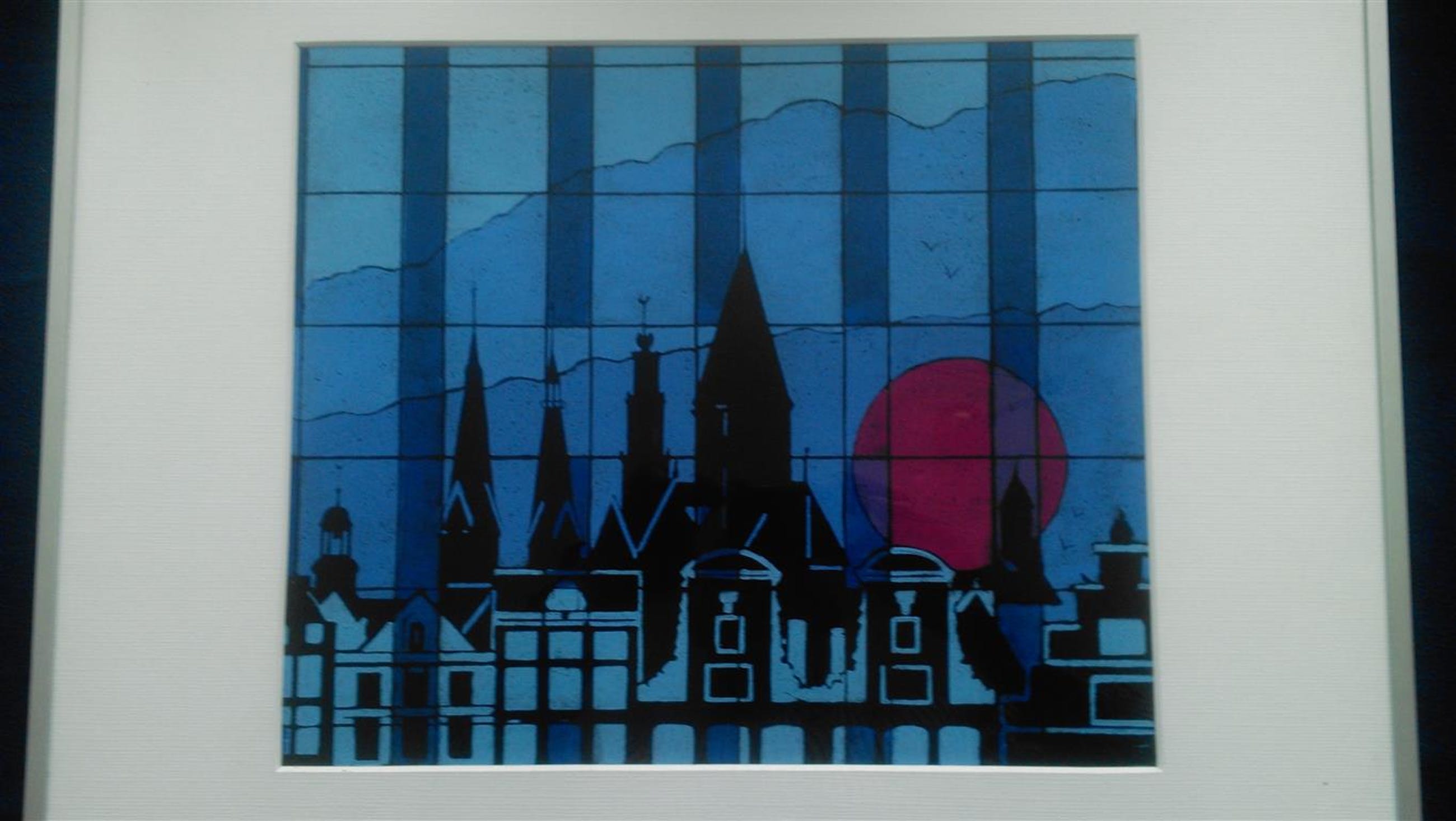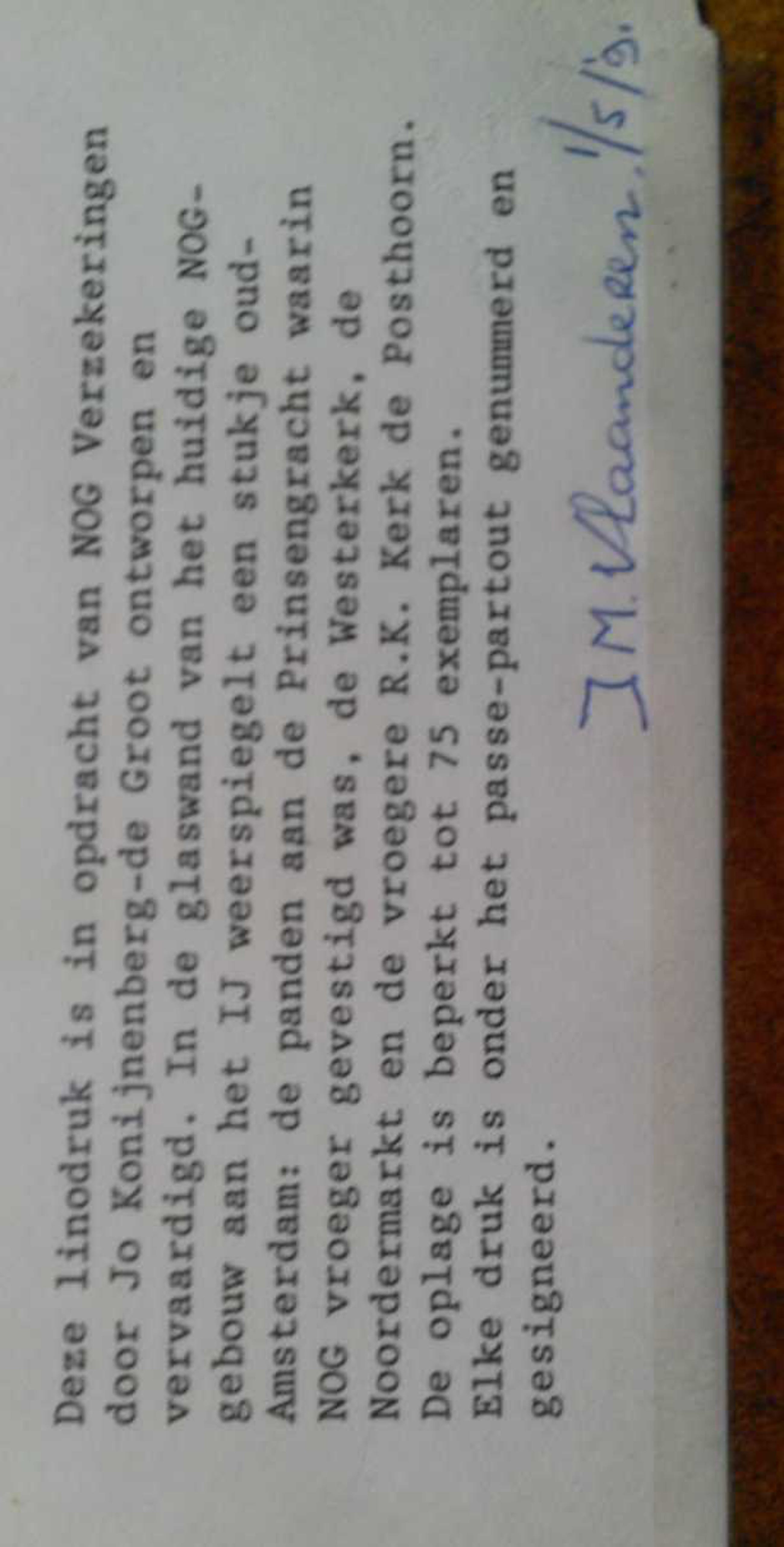 Deze litho is in opdracht voor NOG verzekeringen gemaakt naar aanleiding van hun verhuizing in Amsterdam De glazen pui van het nieuwe pand reflecteert de oude locatie aan de Prinsengracht. Naast grachtengevels ziet men de Westerkerk, de Noordermarkt, en de R.K. kerk de PosthoornDe oplage is 75 en dit is nummer 73 Elk exemplaar is genummerd en gesigneerd onder het passe-partout