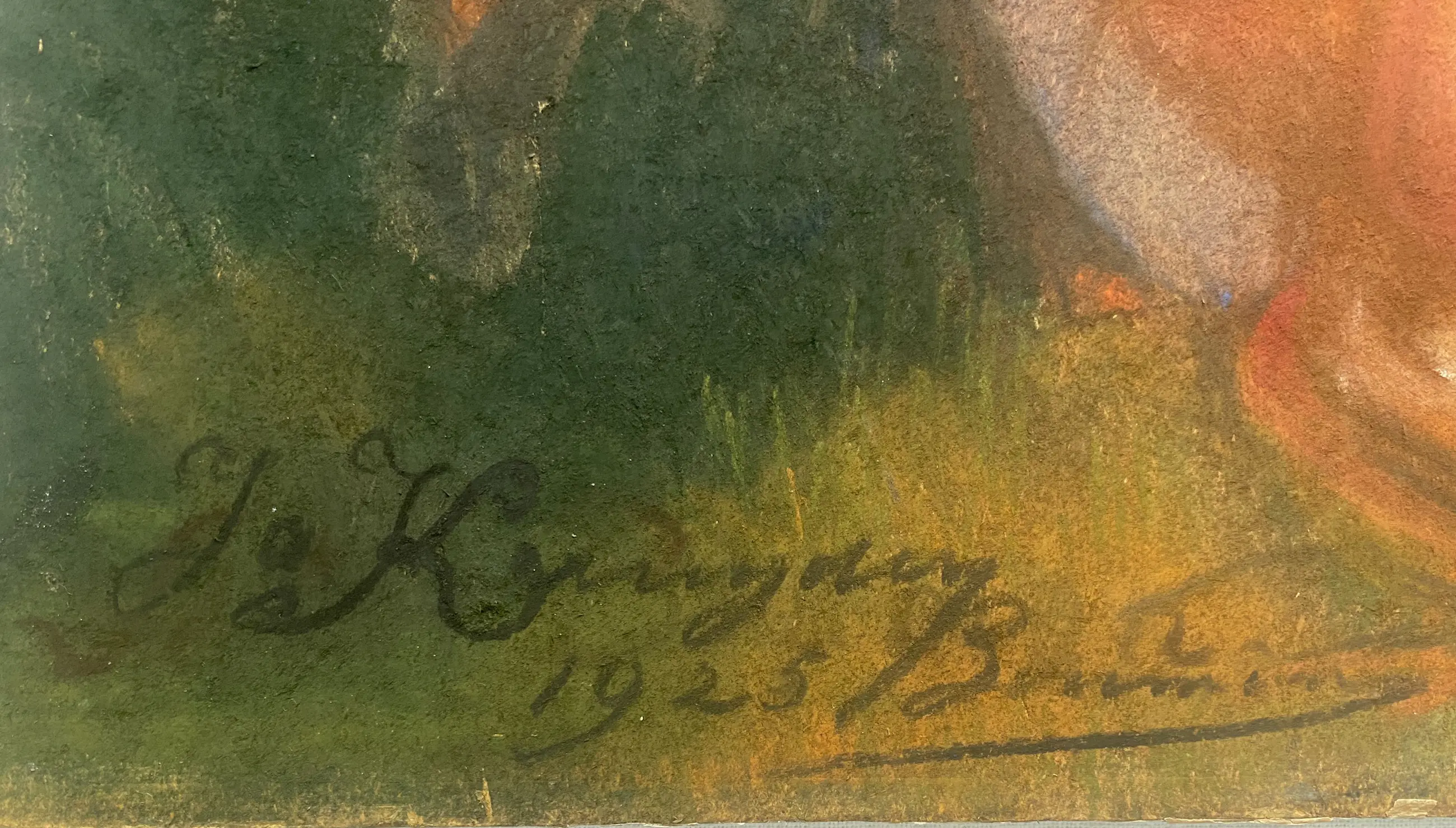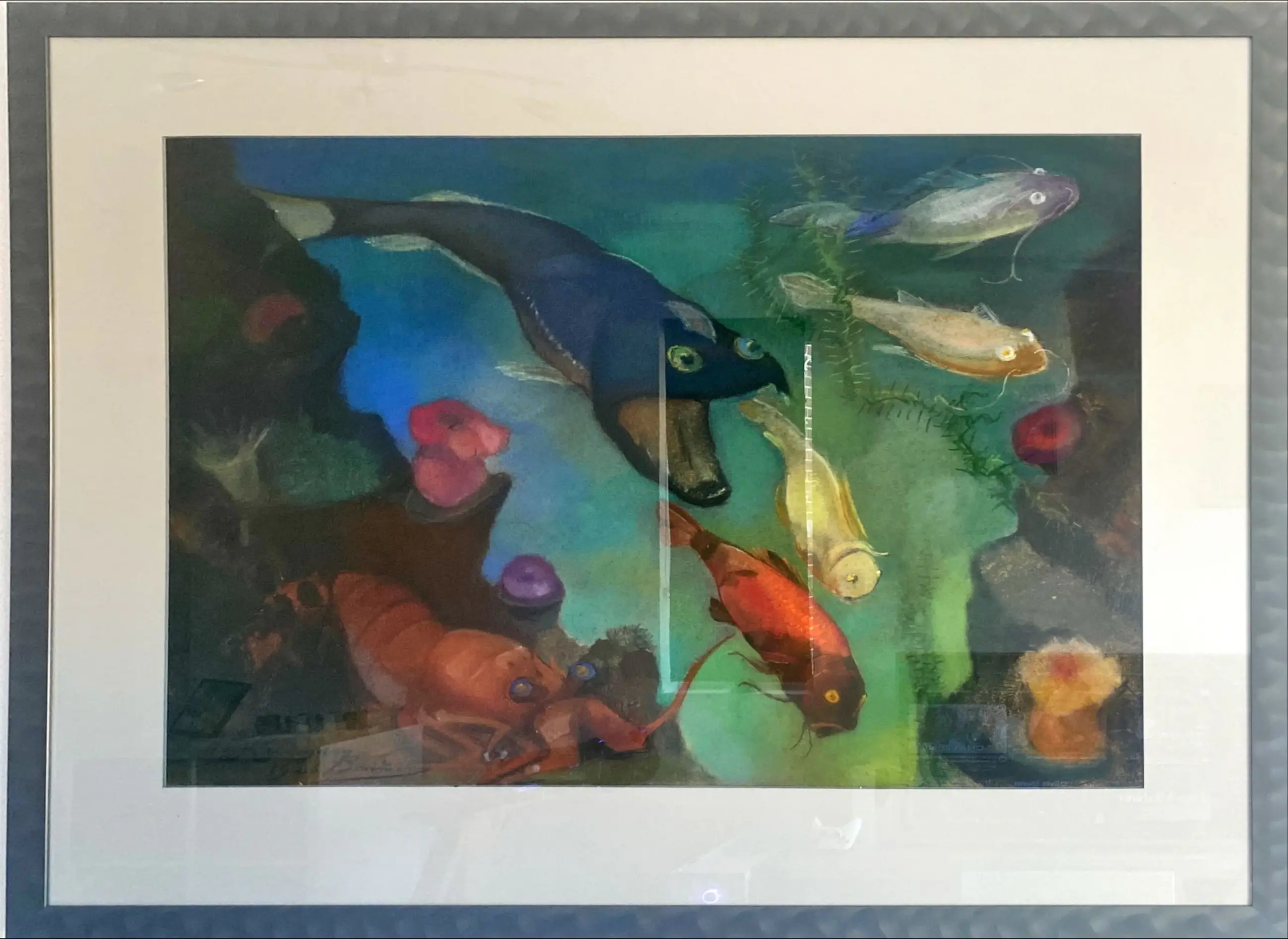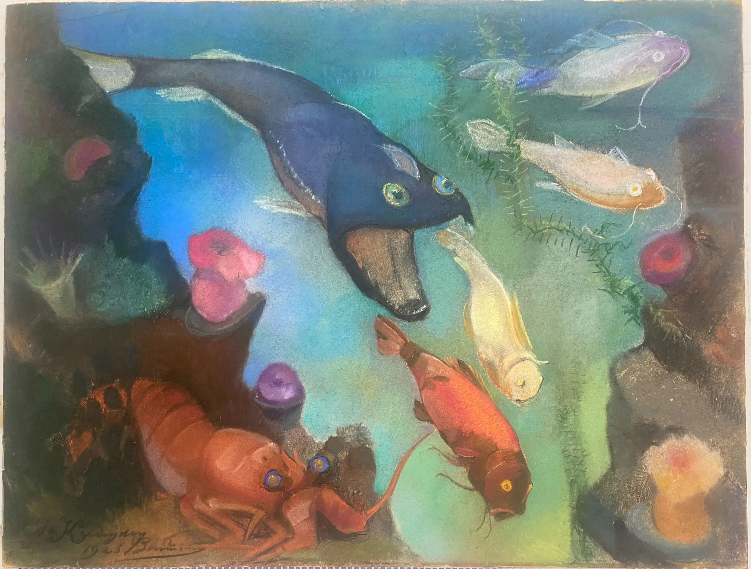 Dit grote werk op paneel uit 1929 toont een surrealistisch onderwaterlandschap met vissen en kreeften. De compositie is krachtig, de kleuren verrassend helder, en het geheel ademt een poëtische, bijna dromerige sfeer. Het onderwerp sluit nauw aan bij Boumans bekende voorkeur voor natuurlijke thema’s. Herkomst en context Het schilderij was eigendom van Albert Hilbrink, die in de jaren 1950–1960 fungeerde als penningmeester van kunstenaarsgroep De Ploegh in Amersfoort. Hij kende Johanna Laura Bouman persoonlijk, evenals andere leden als Toon Tieland en Johan Traarbach. Het werk is sindsdien in familiebezit gebleven. Bijzonderheden Zeldzaam vroeg werk van Bouman (voor haar Ploegh-periode) Groot formaat, zelden op de markt aangeboden Gesigneerd en gedateerd (1929) Uitstekende herkomst (persoonlijke connectie binnen De Ploegh) Ingelijst en voorzien van glas Goed bewaard, werk zelf in nette staat
