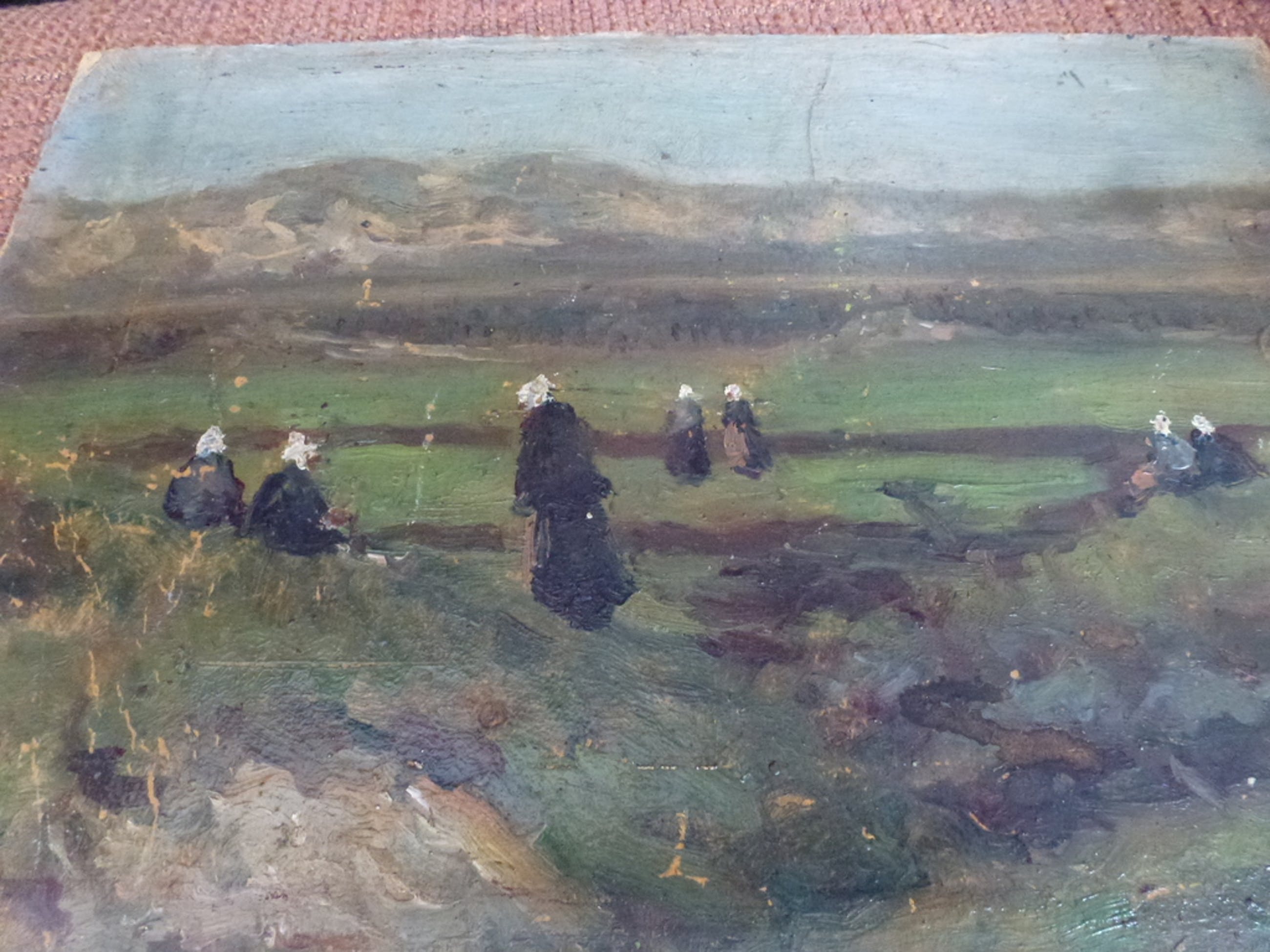 Jo Kruyder-Bouman Amsterdam (1886-1973) Amersfoort, Vrouwen in de duinen, olie op paneel 24,2.3 x 17 cm., gesigneerd achterzijde en gedateerd 1909. Jo Kruyder-Bouman is de vrouw van de bekende schilder Herman Kruyder (1881-1935). Jo Kruyder-Bouman kreeg een traditionele schildersopleiding aan de Rijksakademie in Amsterdam.