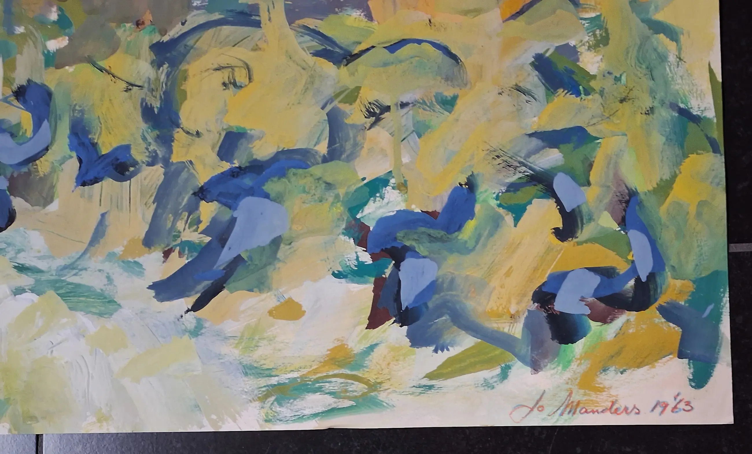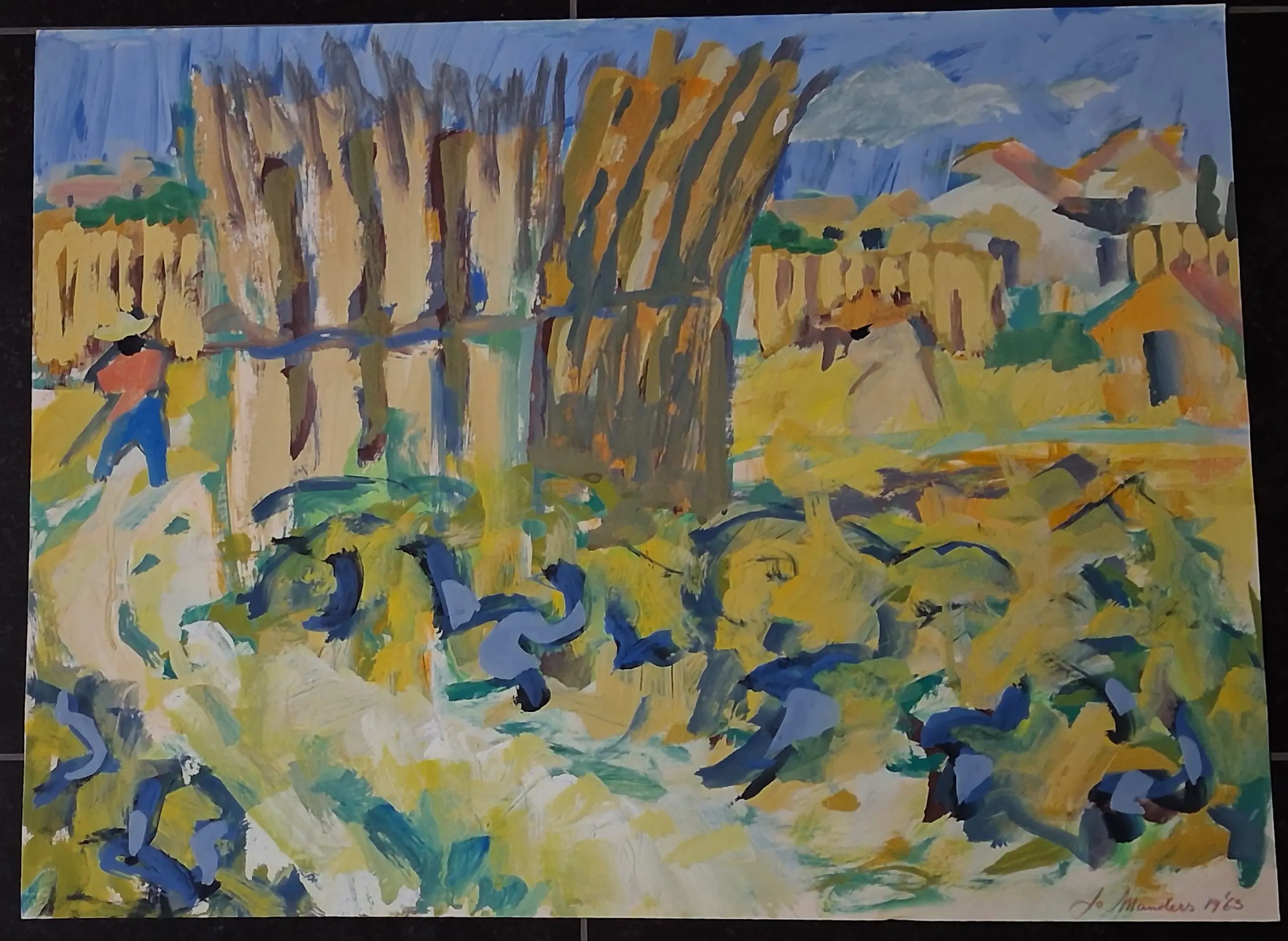 Fraaie, expressionistische gouache op papier uit 1963 geschilderd door Brabantse schilder Jo Manders (1936 - 1995) met als voorstelling een zomerlandschap met oogstscene.