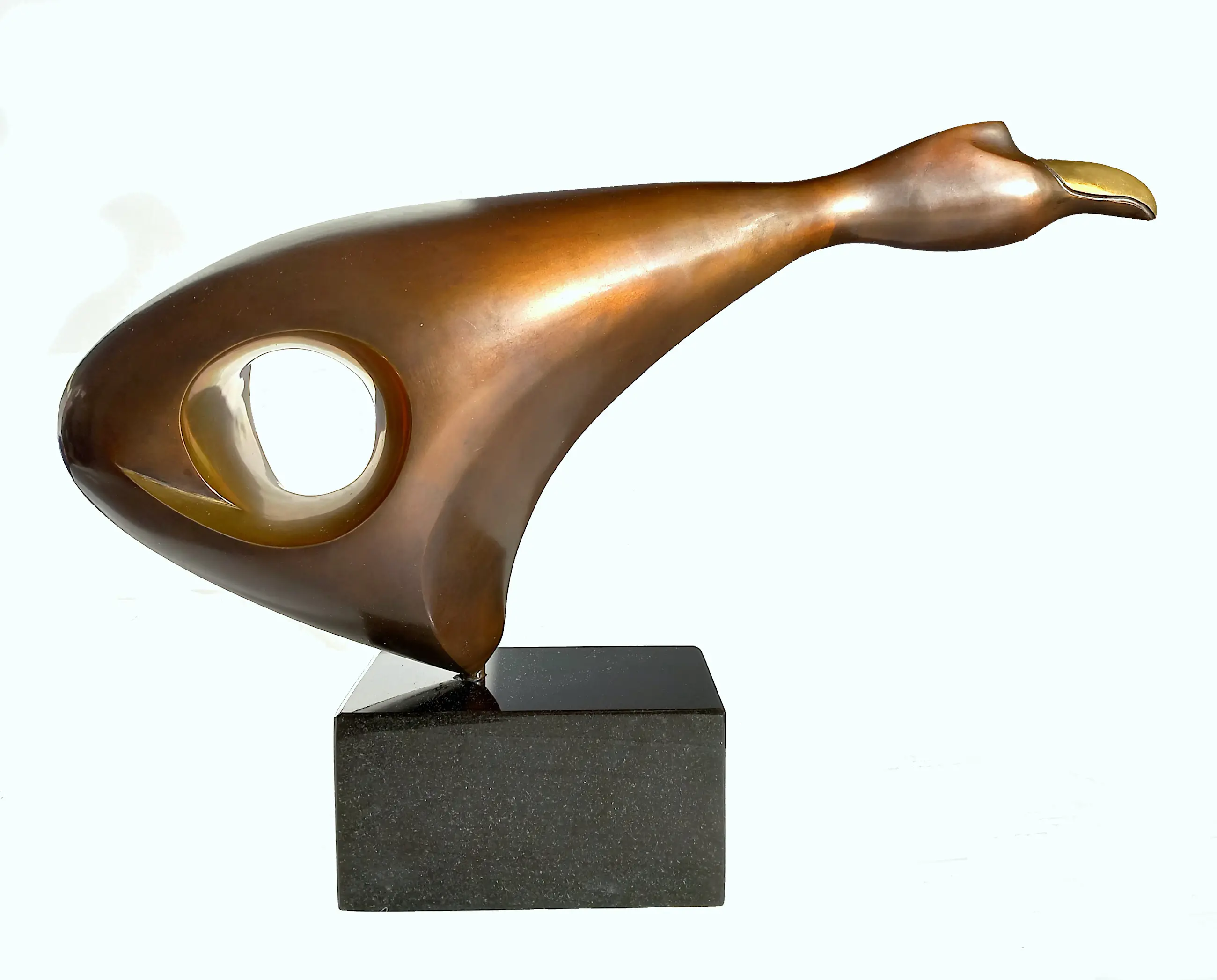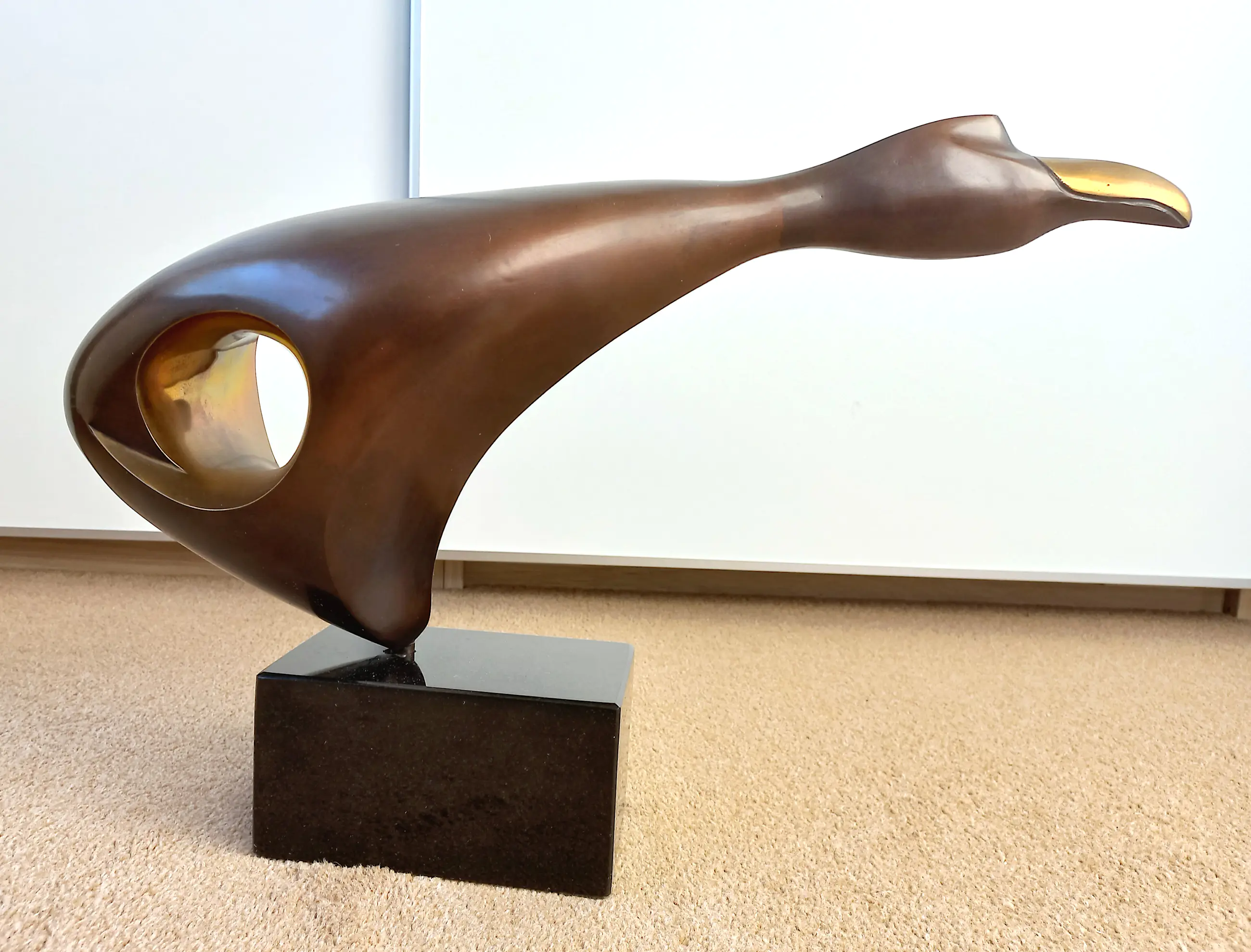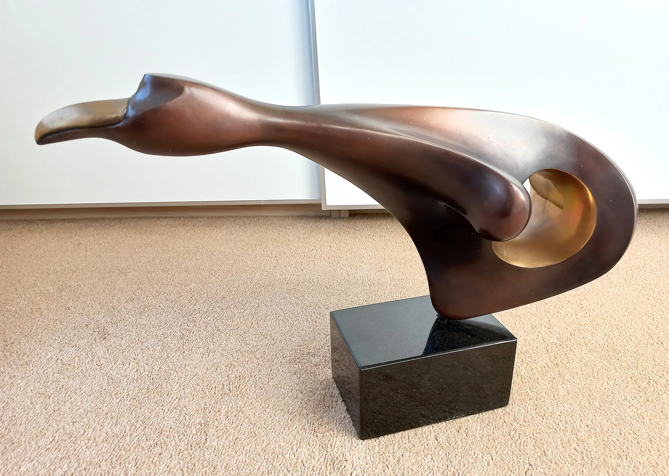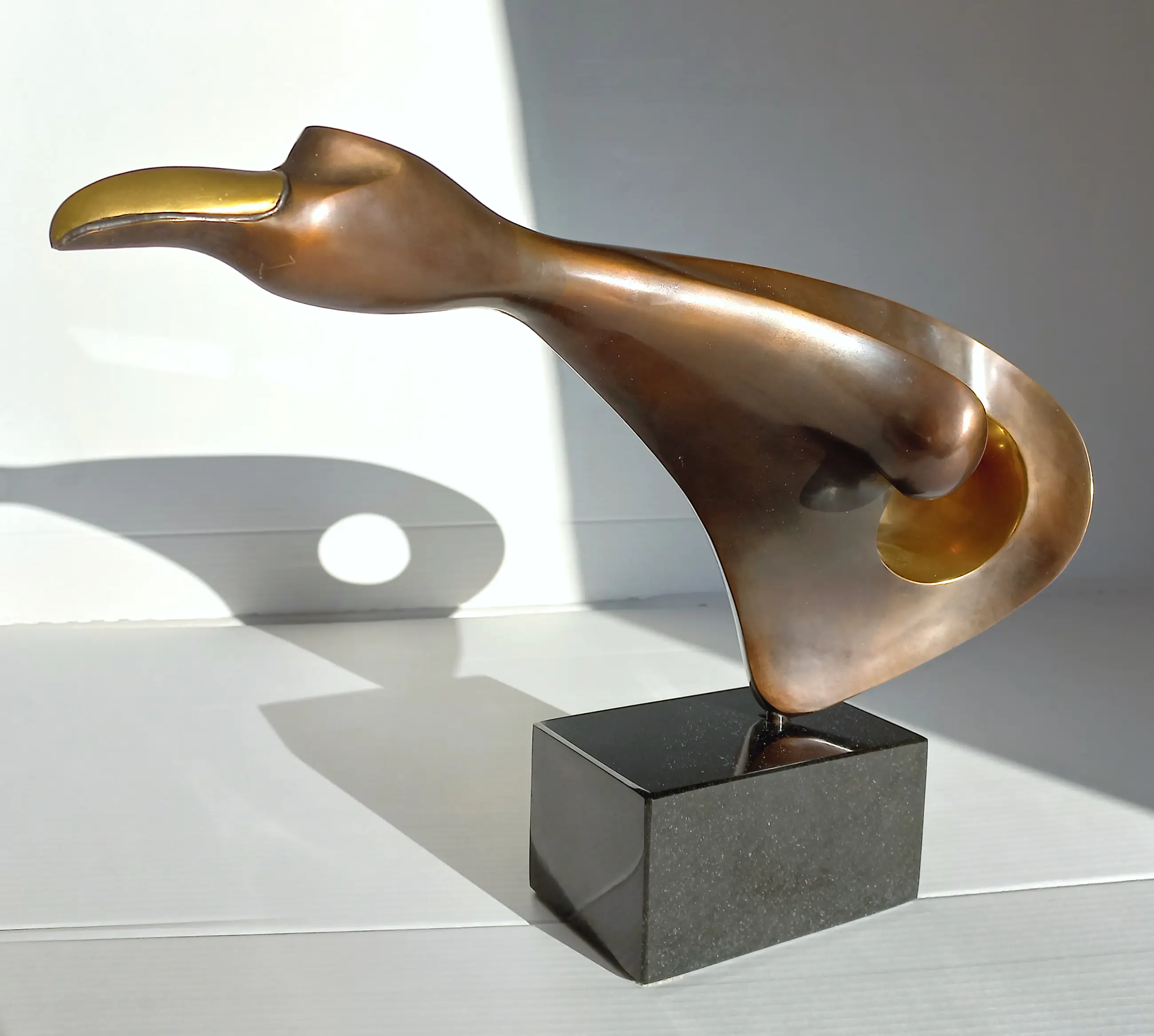 Prachtig beeld van de Limburgse beeldhouwer Jo Ramakers. Bronzen beeld met zowel koperkleurige als goudkleurige patina, gemonogrammeerd en genummerd (1/18) onderop het beeld. Het beeld is “los” gemonteerd op een mooie natuurstenen sokkel met onderop een atelierlabel van Jo Ramakers. Geschat gewicht (incl. sokkel): 10-12 kg. In zeer goede conditie.