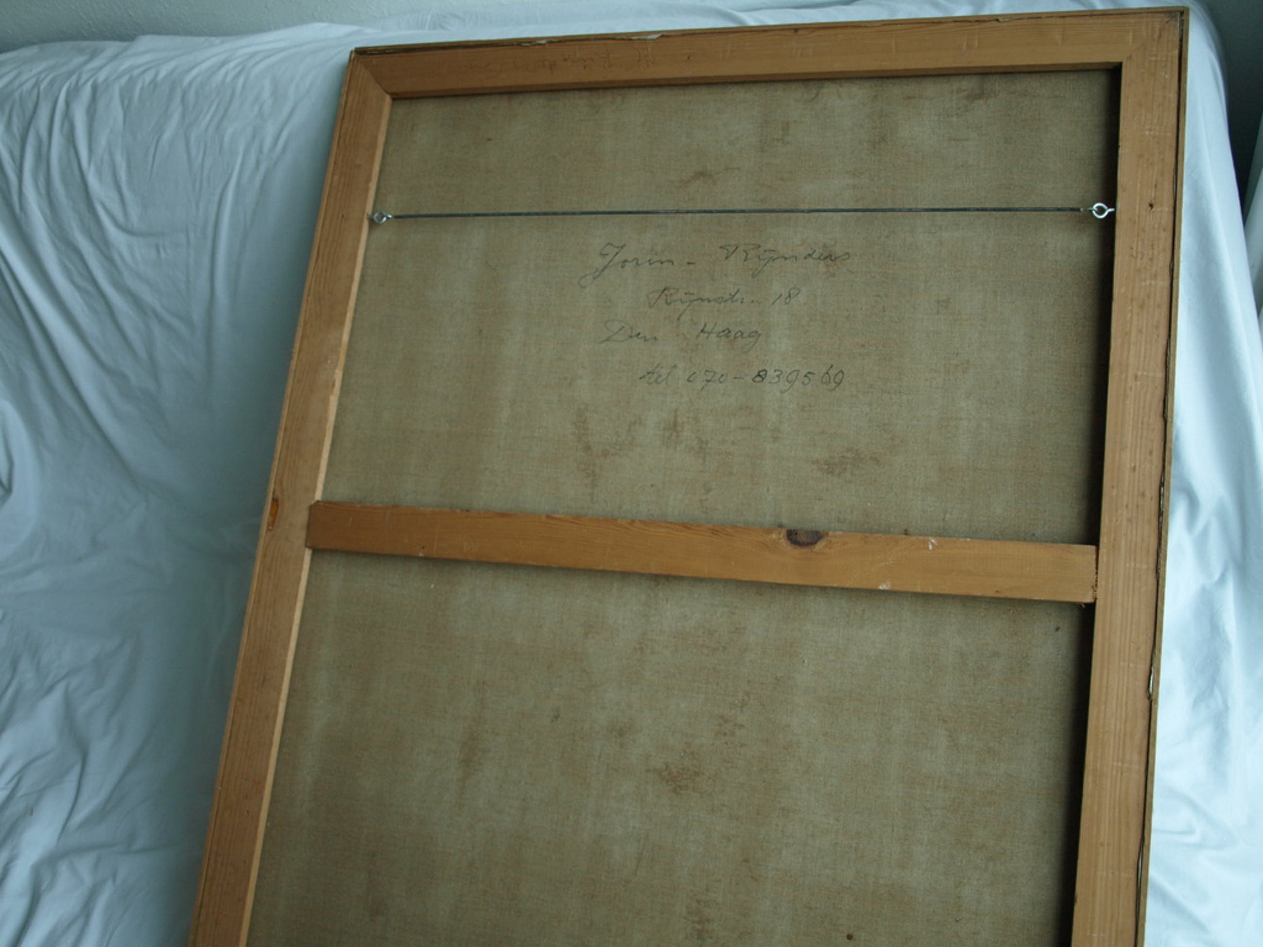 -Gesigneerd op de achterkant van het doek (+ adresgegevens in Den Haag).