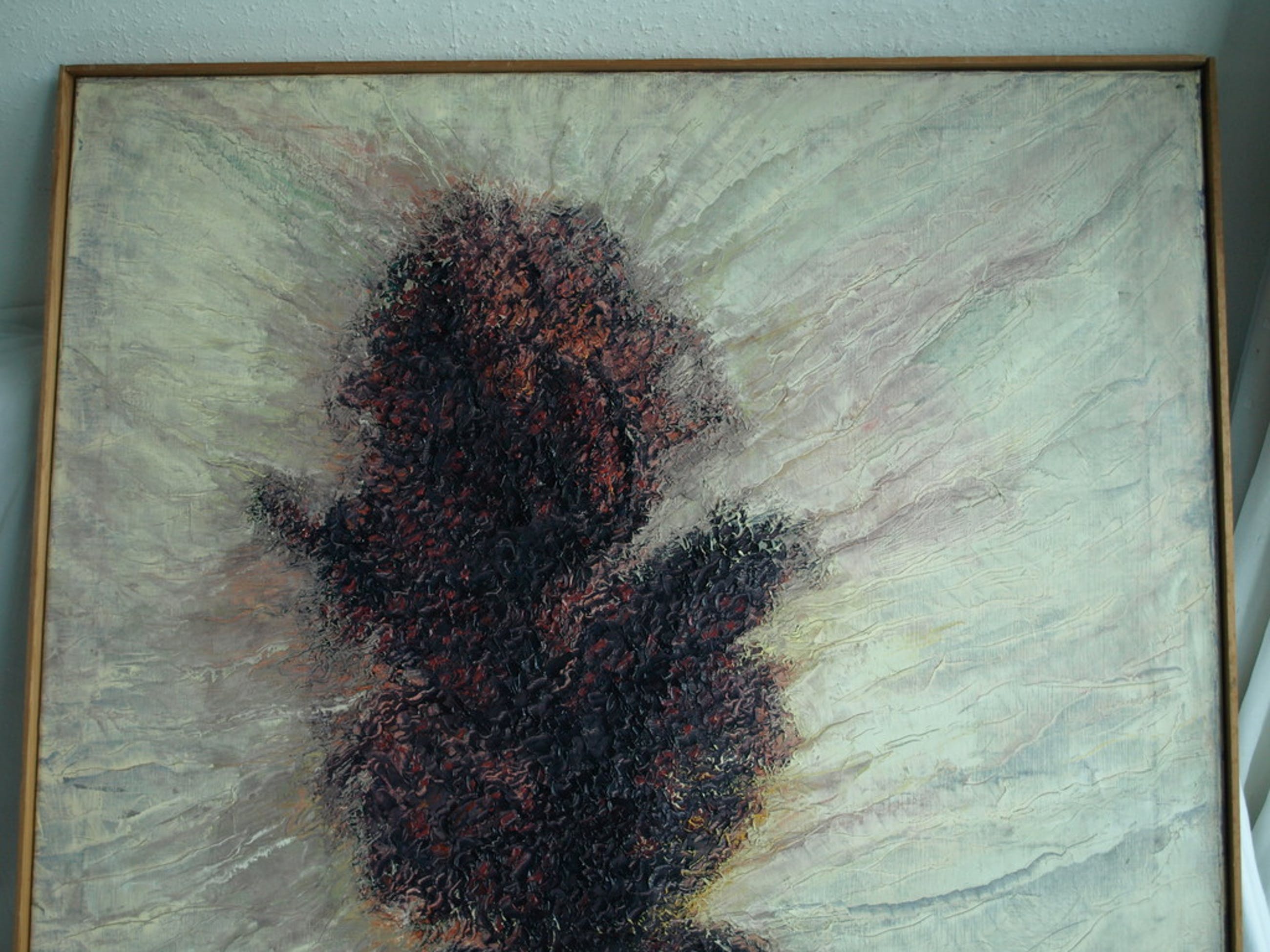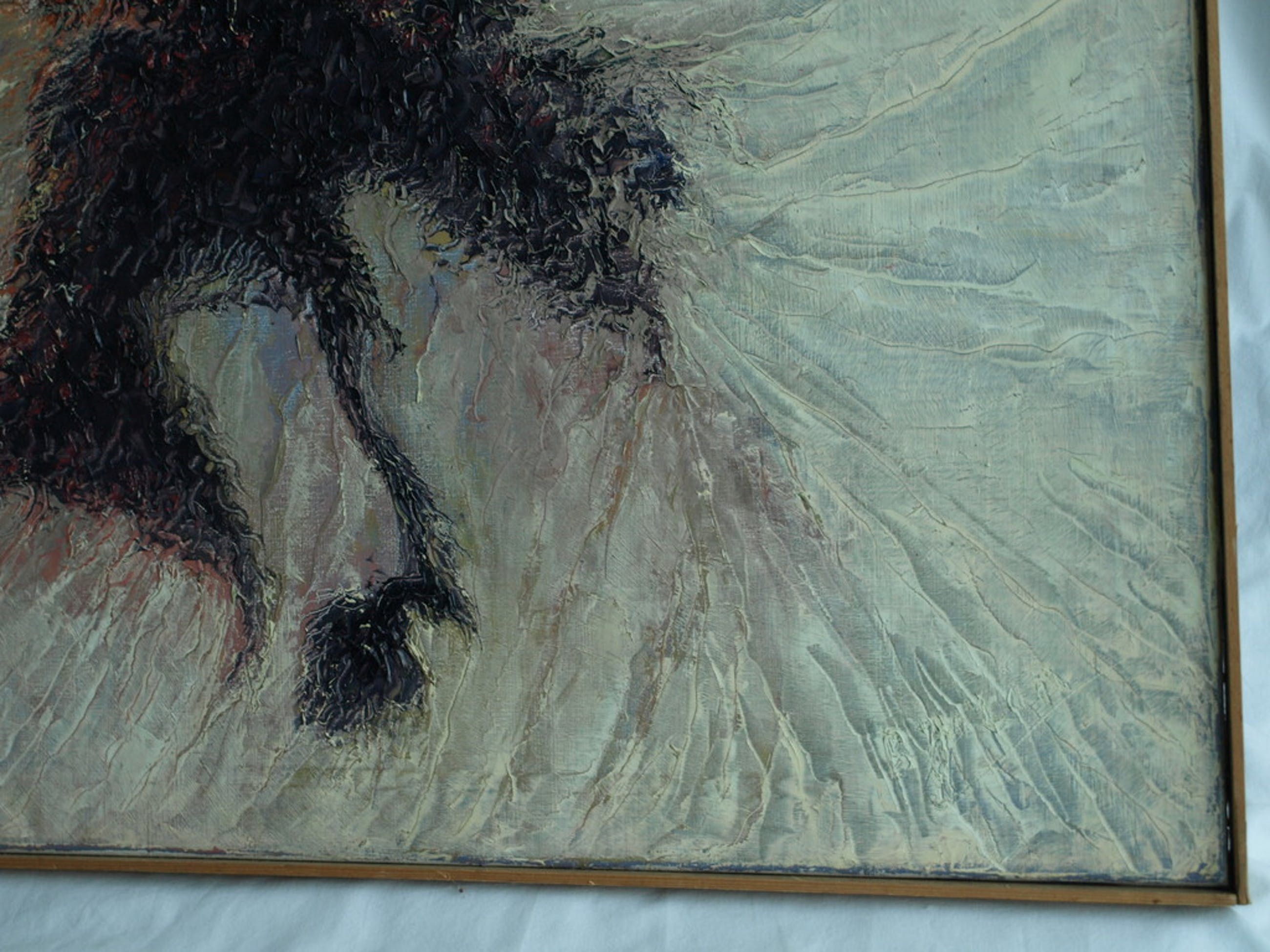 - Het doek is opgespannen op een houten spieraam en ingelijst met ‘expositie-latjes’. Op de achterkant staat op het spieraam de oorspronkelijke prijs geschreven (fl 600,-).