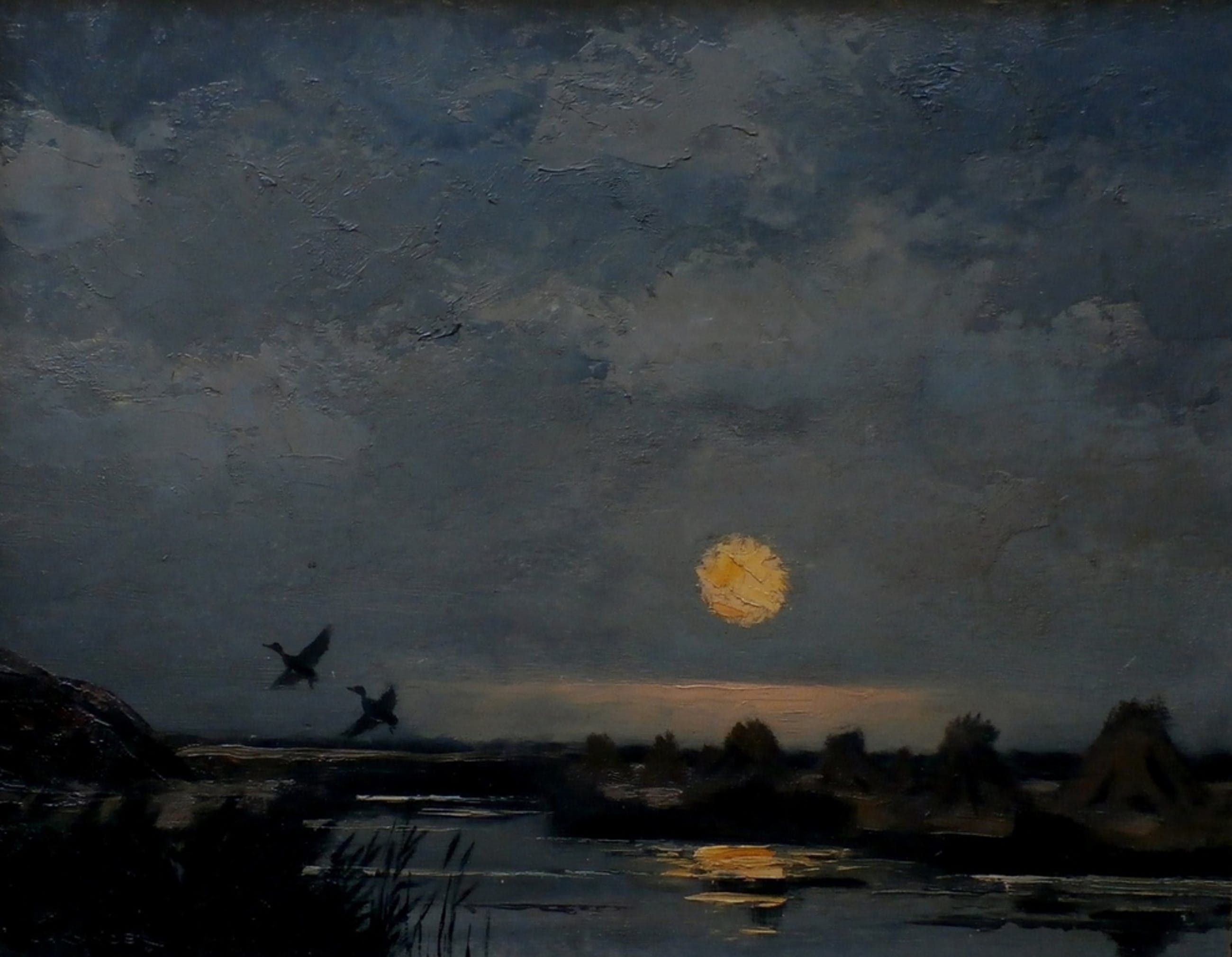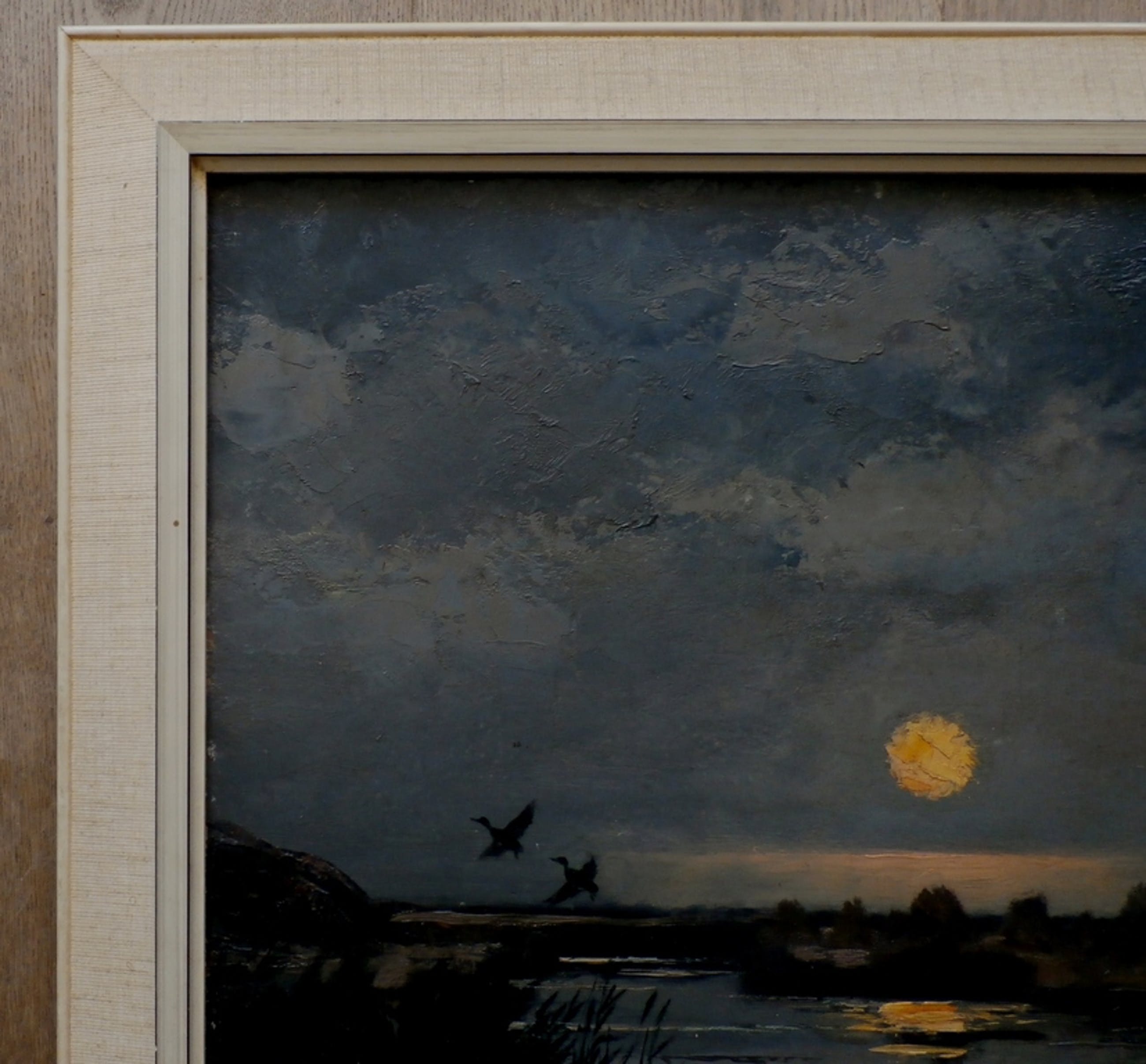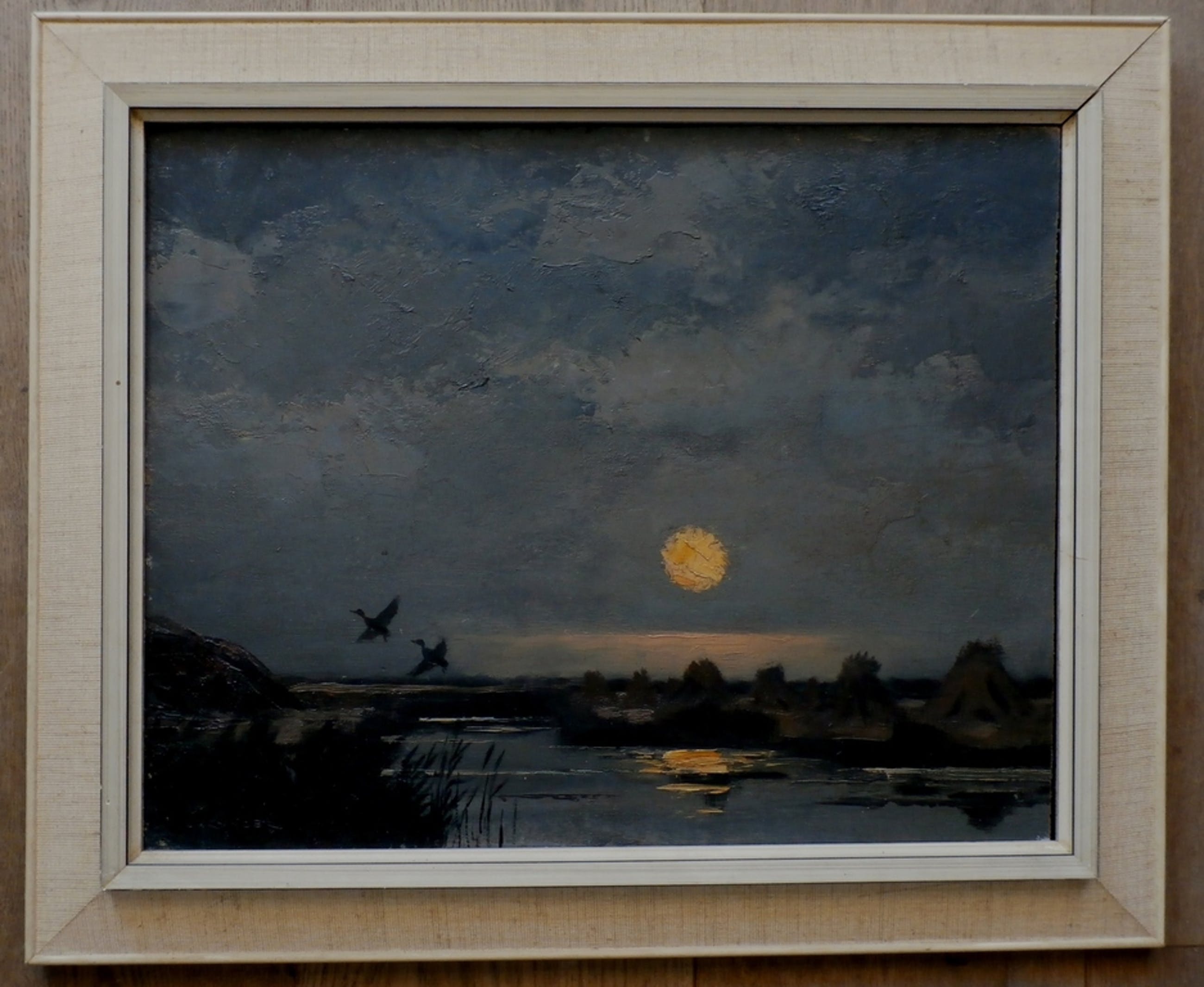 Olieverf op board van jo schrijnder. Titel: opvliegende eenden bij ondergaande zon. Afmetingen werk: h40 x b50 cm. Afmetingen inclusief lijst: h51,5 x b61,5 cm. Het werk is linksonder gesigneerd door de kunstenaar. Conditie: in goede staat.
