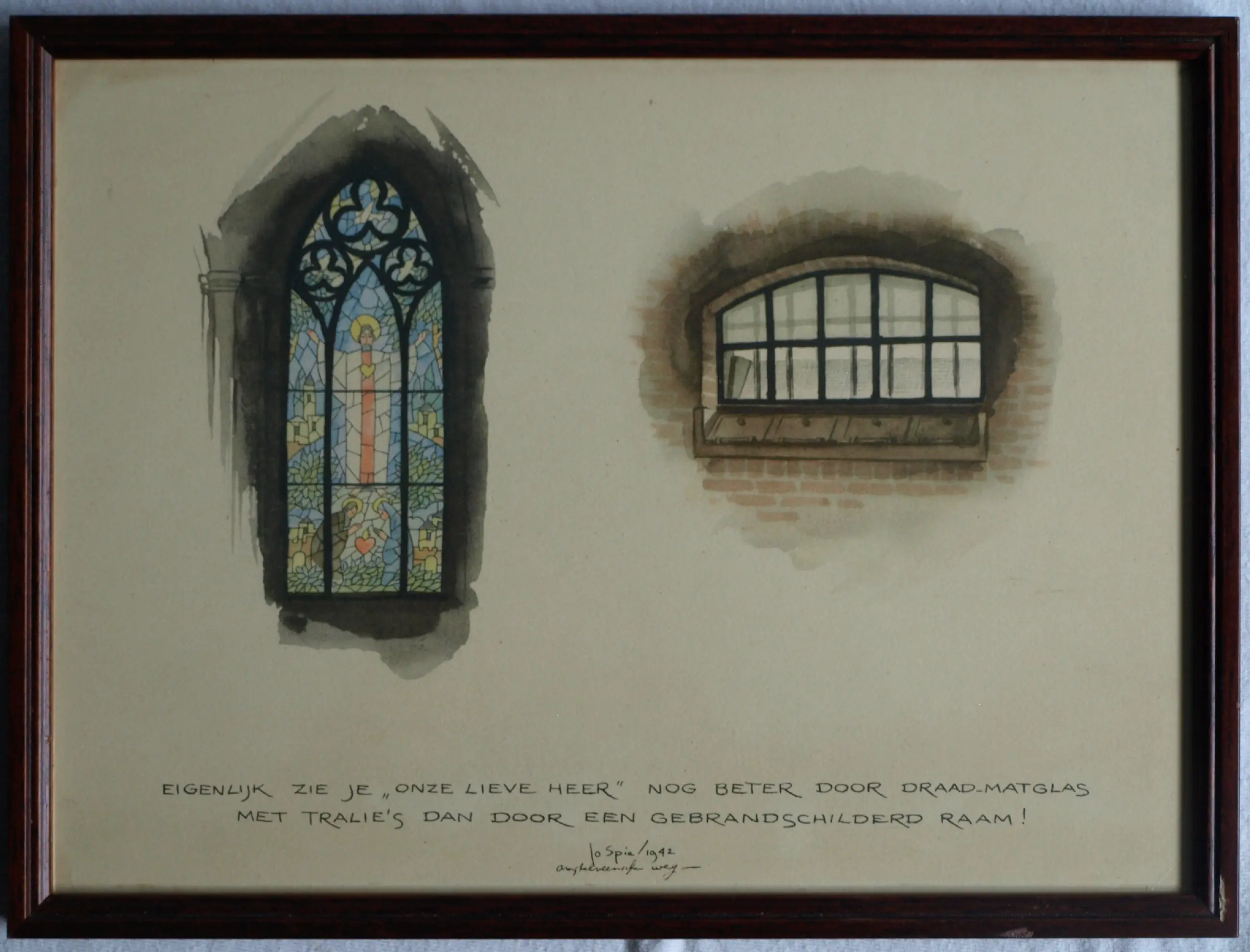 *Jo Spier - De prent van is uit 1942 en heeft als tekst: “Eigenlijk zie je ‘Onze Lieve Heer’ nog beter door draadmatglas met tralies, dan door een gebrandschilderd raam!”.