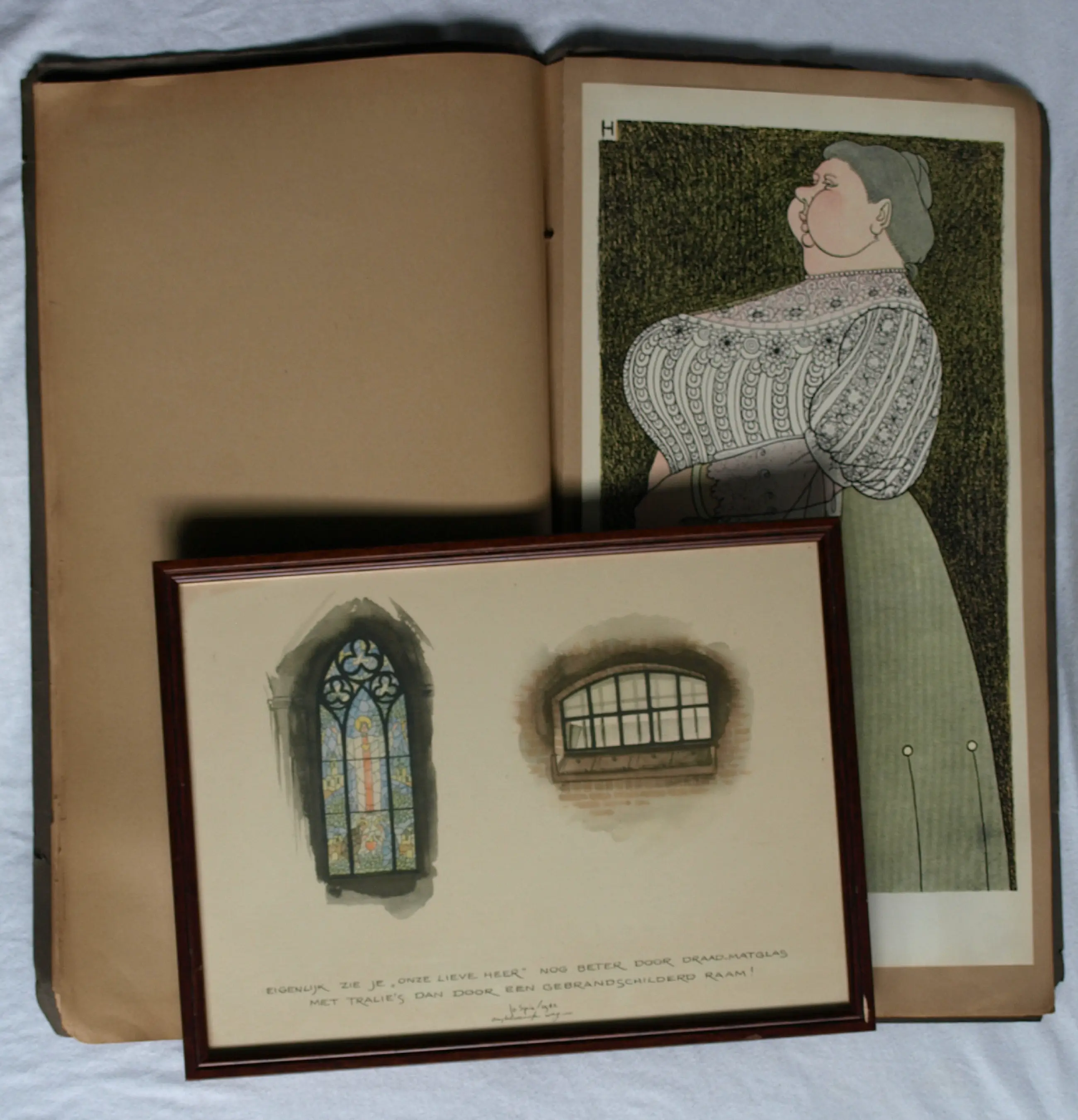 Een ingelijste prent uit 1942 van de Nederlandse / Amerikaanse kunstenaar Jo Spier (1900-1978) en een kartonnen portfolio uit 1908 met 12 kleuren-litho’s met karikaturale tekeningen van de Nederlandse kunstenaar Albert Hahn (1877-1918).