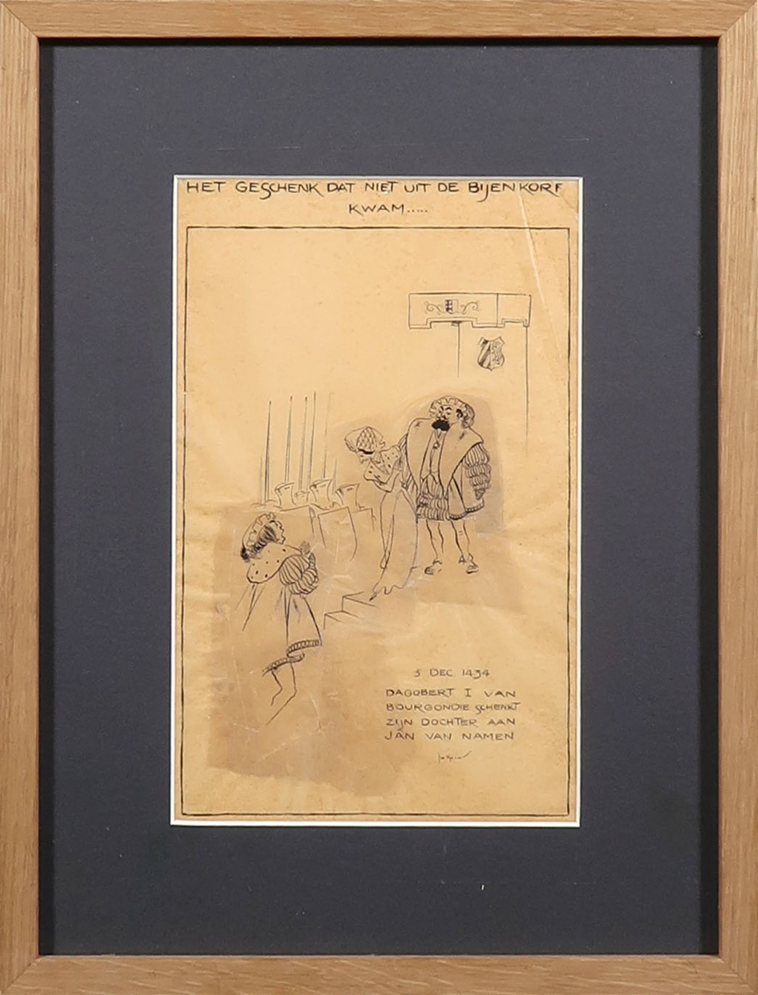 Komische tekening door Jo Spier op papier. De figuren zijn op aparte stukken papier getekend en bewerkt. Dit werk is een ontwerp of een uitgave o.i.d.