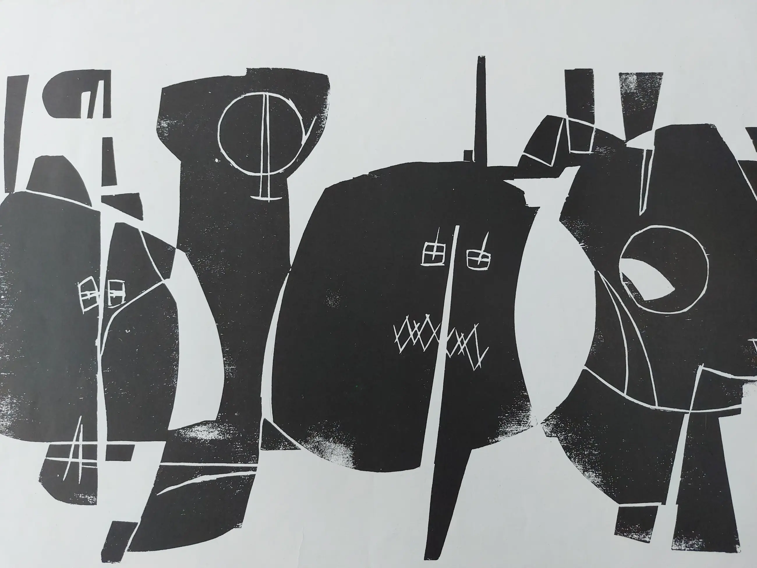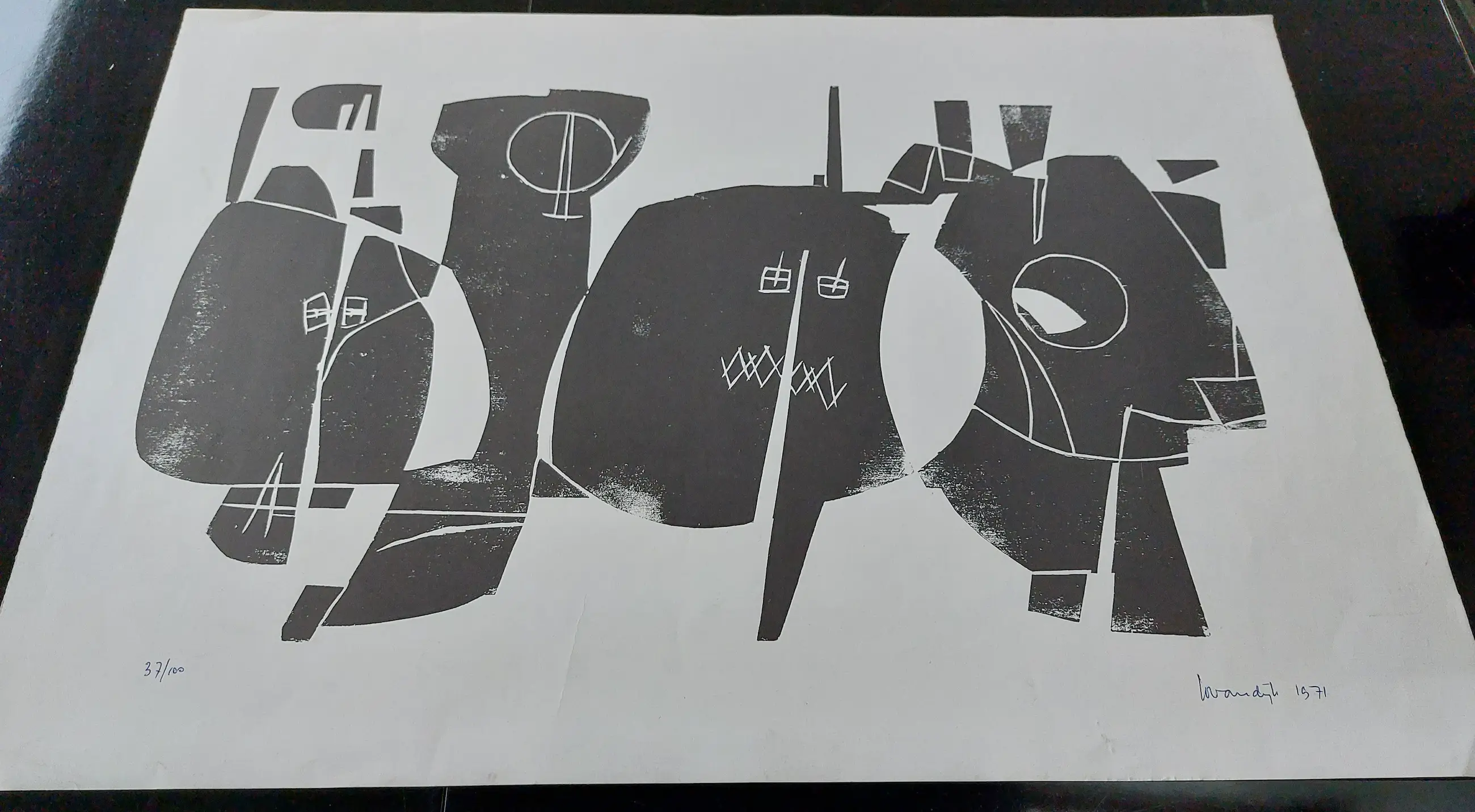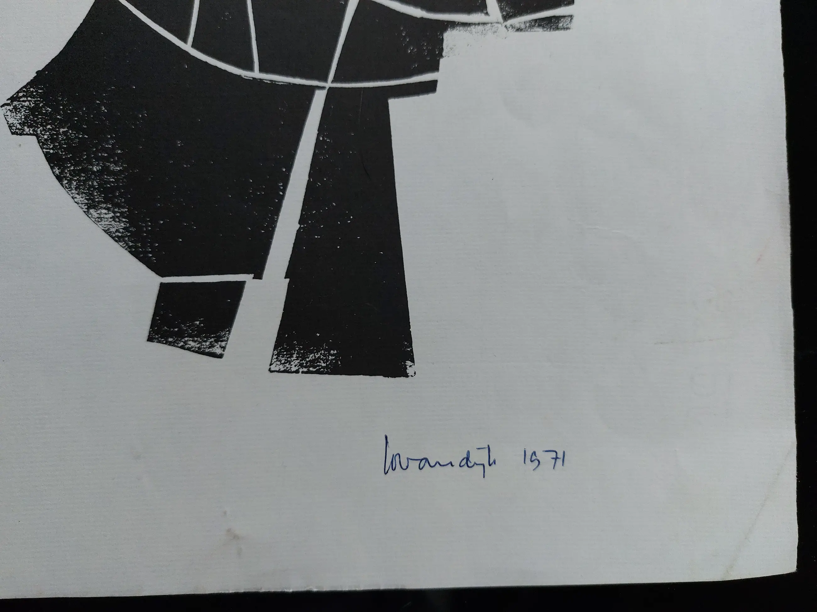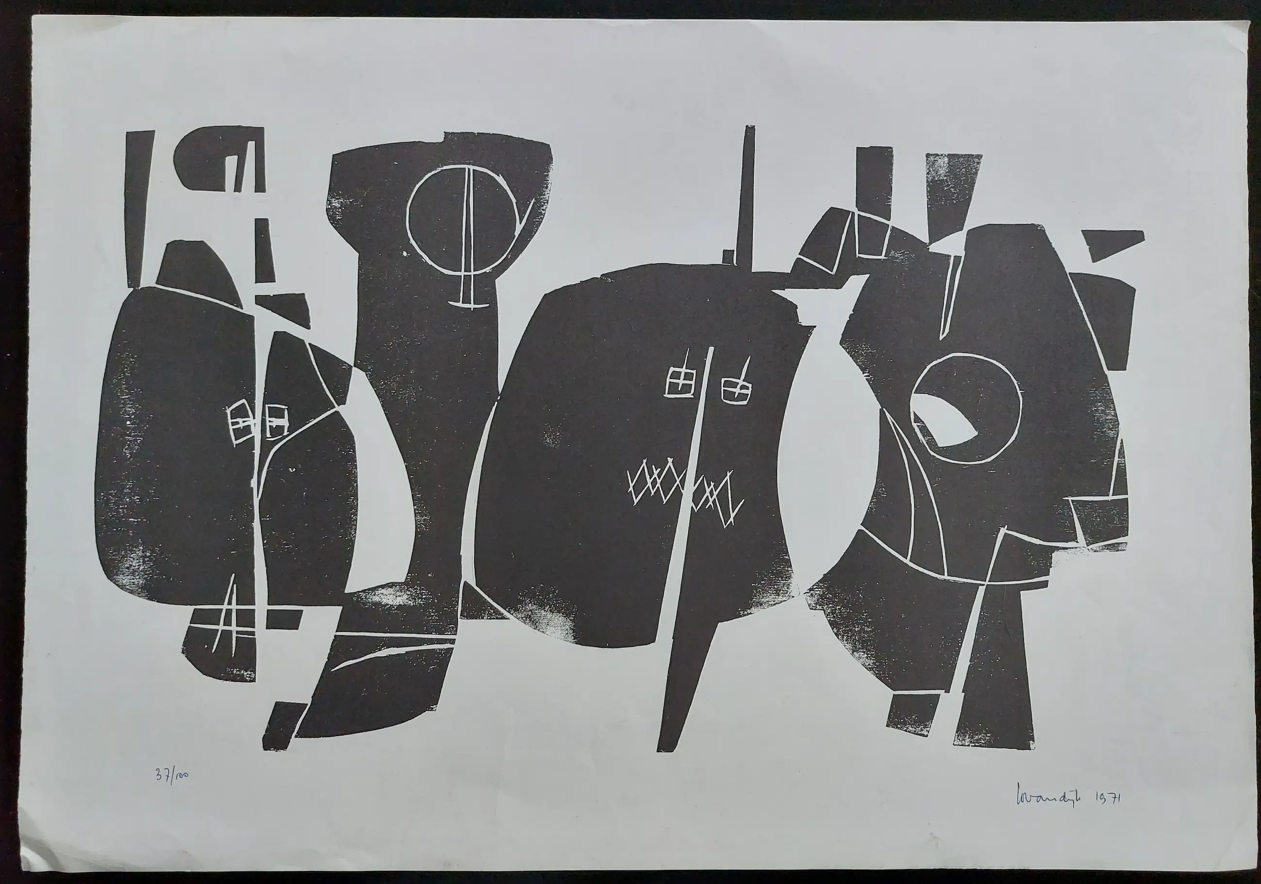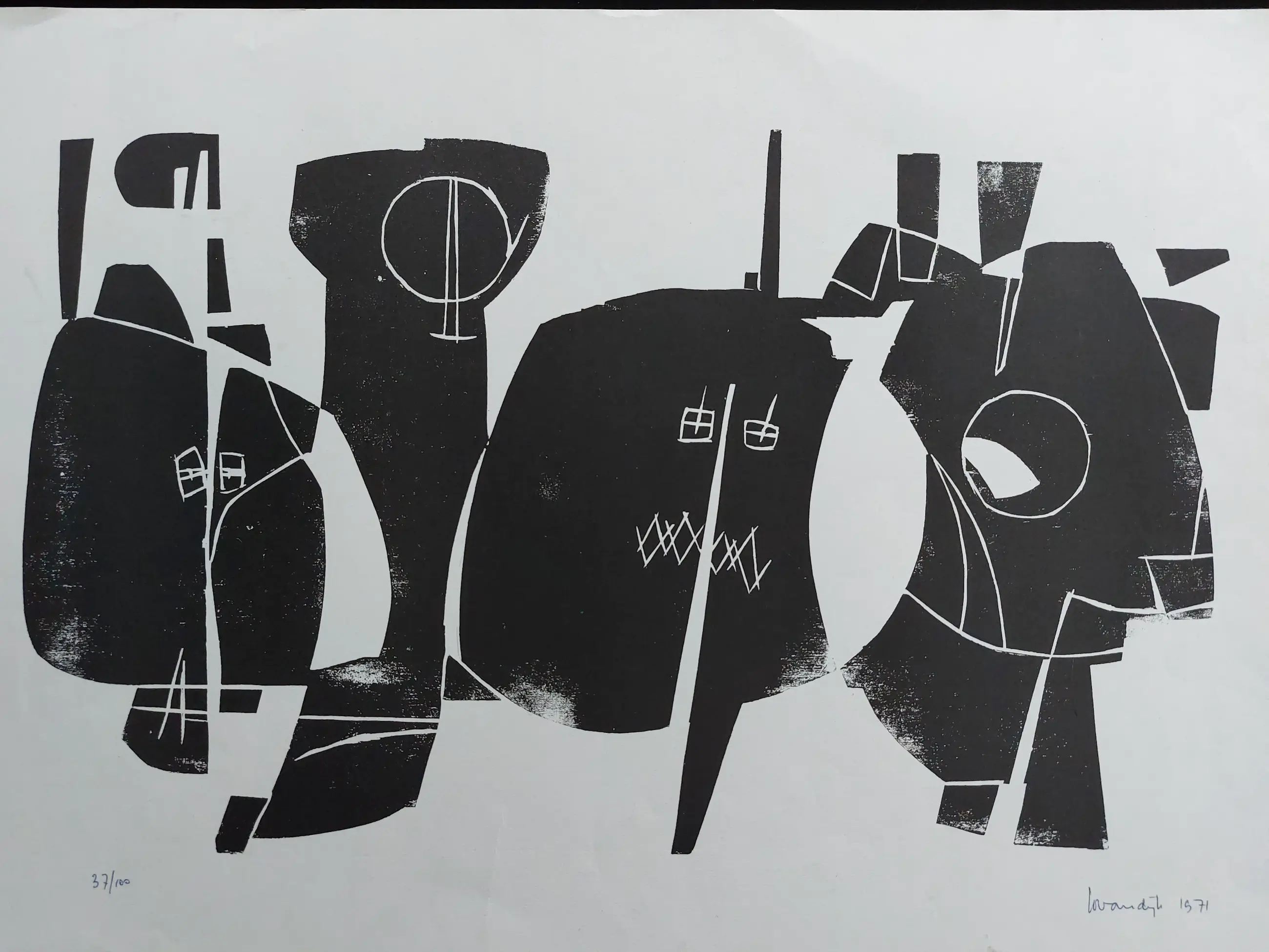 Mooie abstracte compositie in zwart-wit van Groninger Ploeg kunstenaar Jo van Dijk. Met de hand gesigneerd, gedateerd 1971 en genummerd.