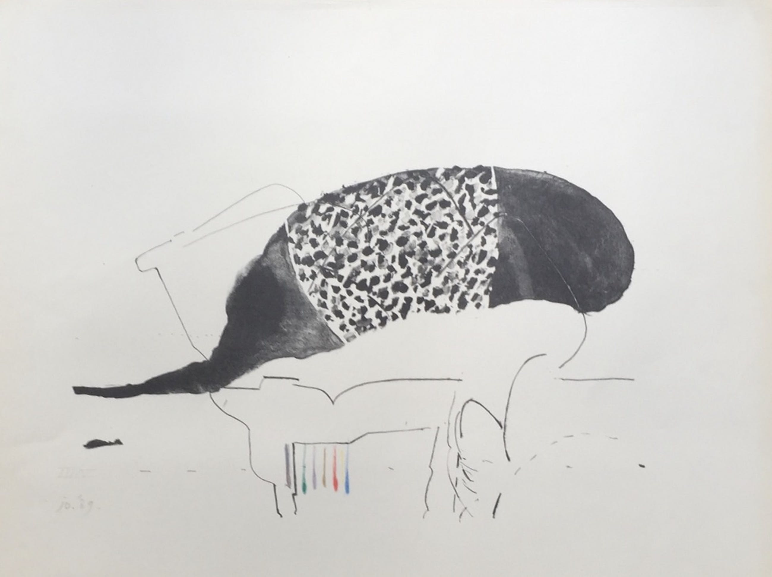 Deze litho met kleurpotlood is gemaakt in 1989. In 1995 is een boek over de kunstenaar Jo van Dreumel uitgegeven ( Fagus, Aalten). De subtitel van dit boek is gelijk aan de titel van de hier aangeboden ets: Le Caillou-qui-bique. Le Caillou-qui- bicue verwijst naar een grote steen in het bos van Angre in Roisin (België). Deze miljoenen jaren oude steen is door een boze duivel in het bos geworpen Jo van Dreumel verbleef graag op deze bijzondere plek en heeft in deze litho het verhaal van deze betoverende steen verbeeld. De litho betreft nummer 3 uit een kleine oplage van 5 afdrukken.