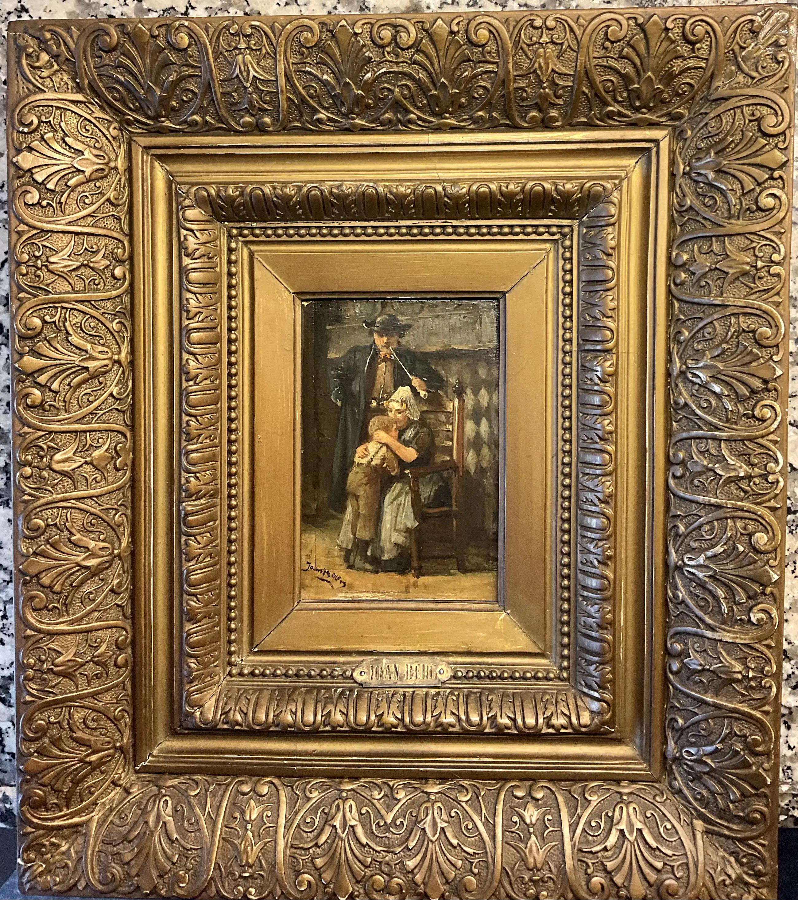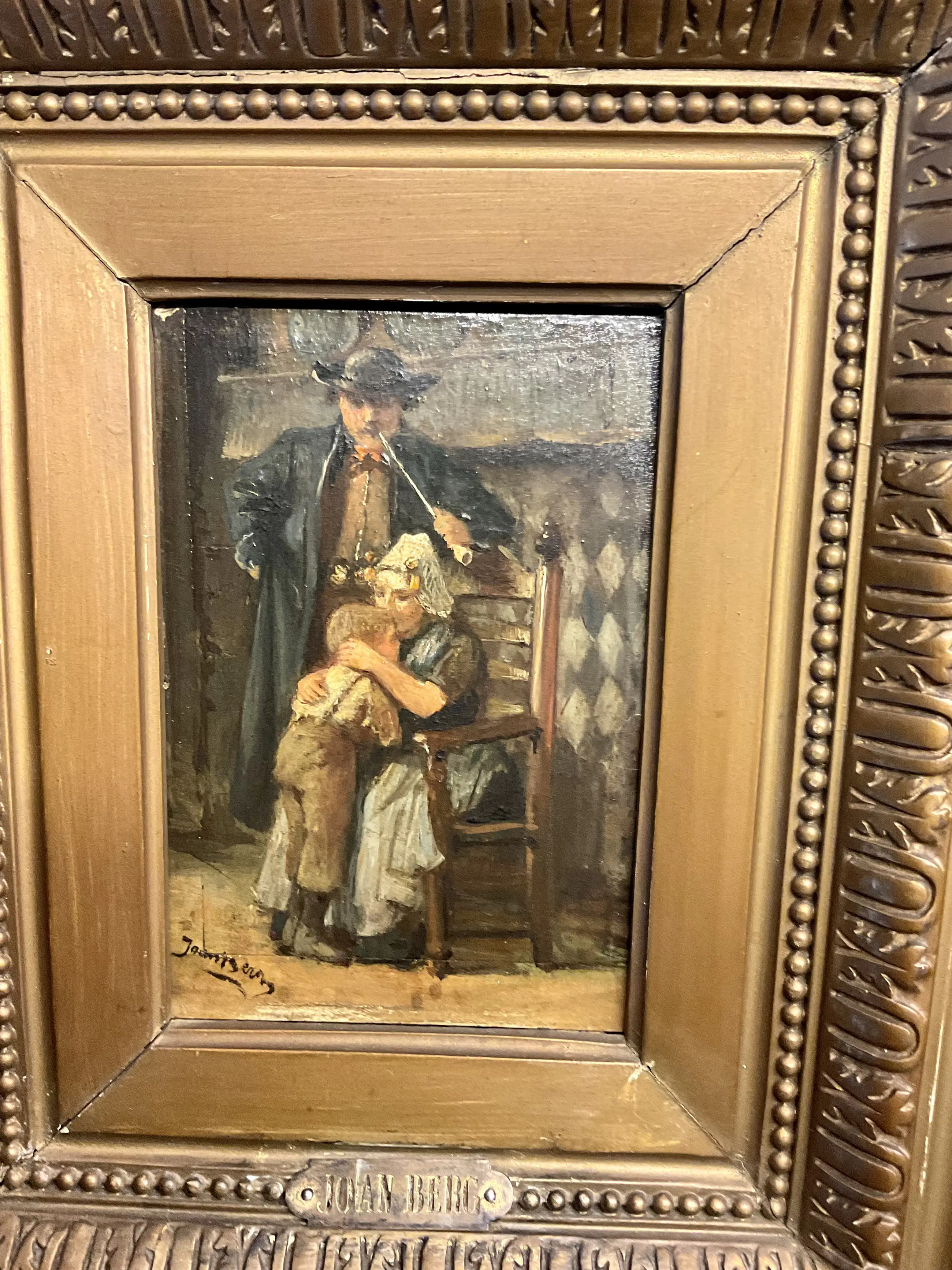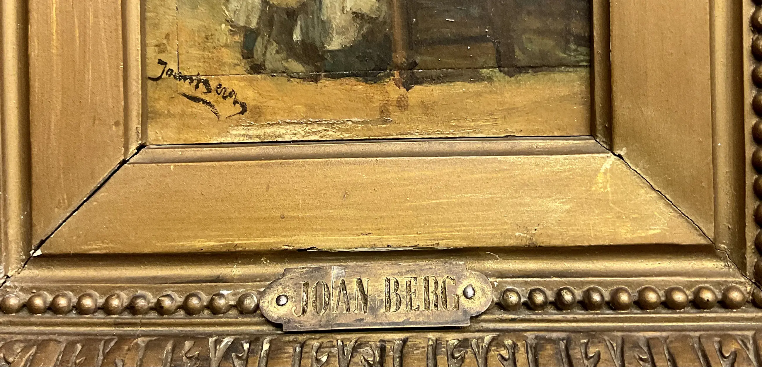 Prachtig fijn geschilderd paneeltje van een Zeeuwse boeren familie . Linksonder gesigneerd: Joan Berg. Mooie contemporaine lijst met naamplaatje. Lijst heeft lichte gebruikssporen door de leeftijd.