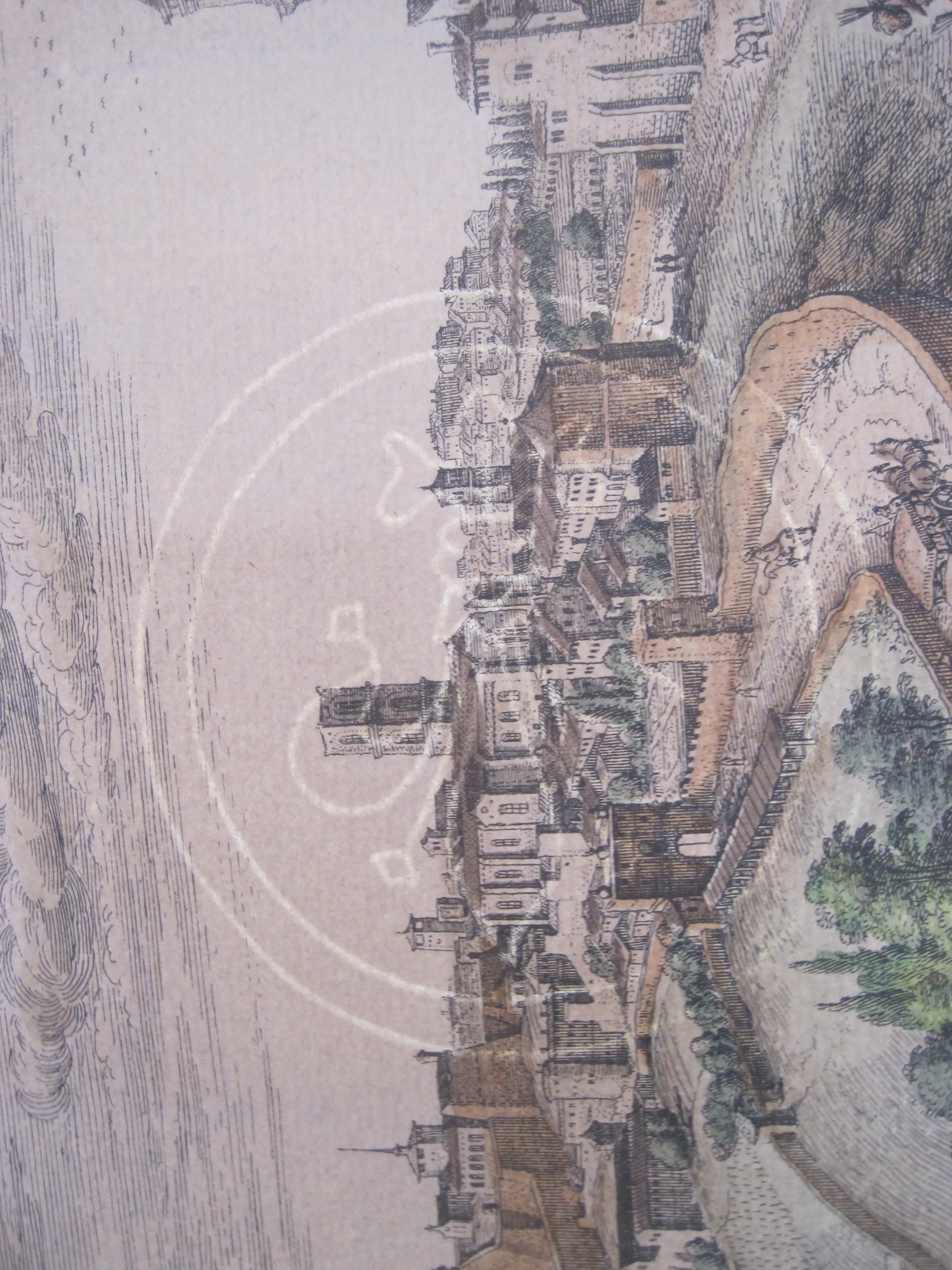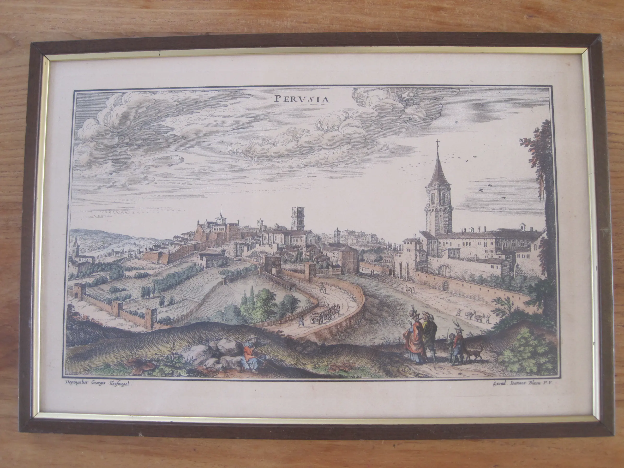 Een hele mooie ingekleurde kopergravure van de stad Perugia in Italié. De gravure is gedrukt op handgeschept papier. Het papier is voorzien van een watermerk. Voorzichtigheidshalve heb ik de leeftijd gehouden op 1800 tot 1900. De gravure is ingelijst. Mocht iemand mij kunnen informeren over deze prent, graag.