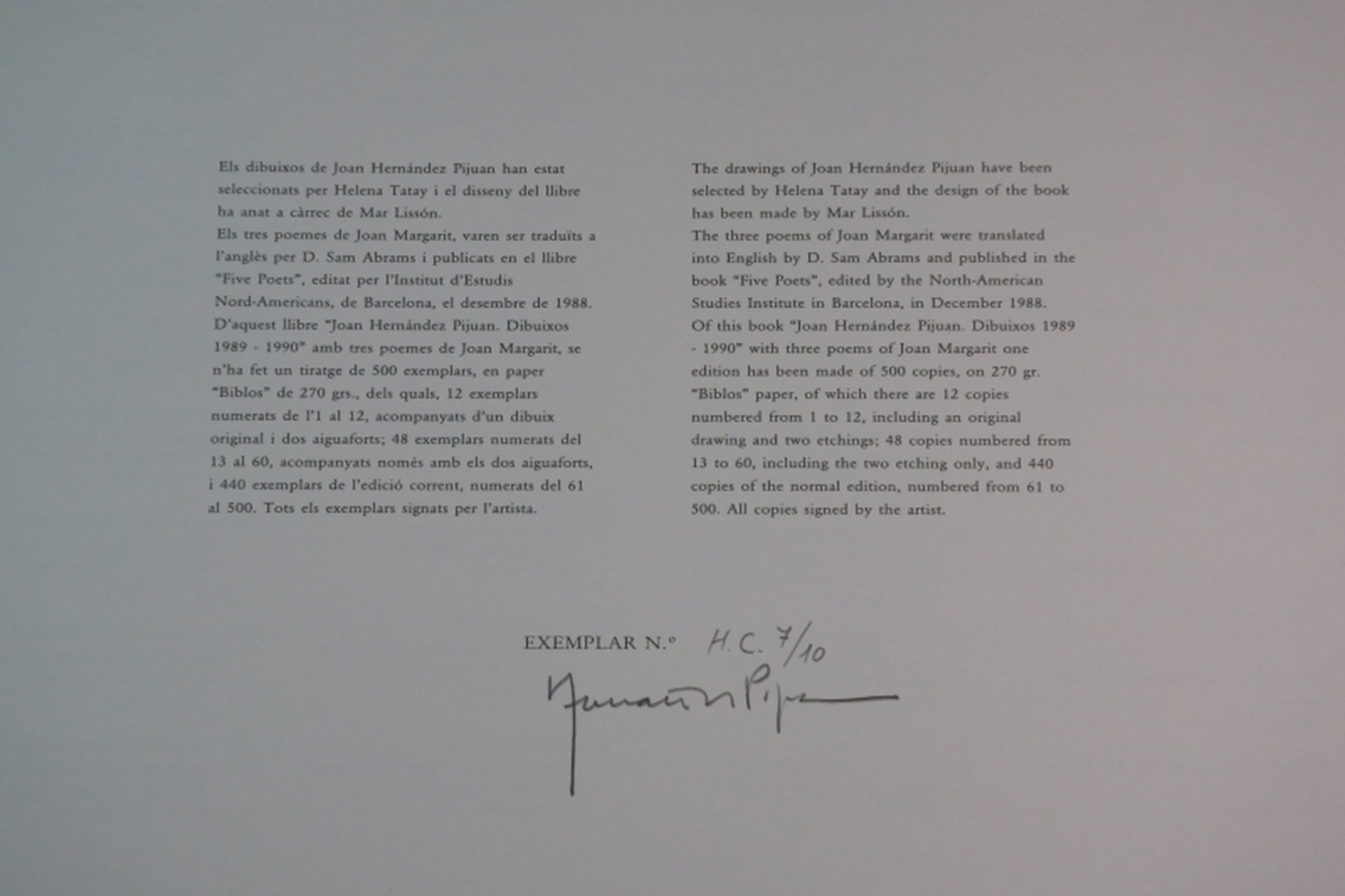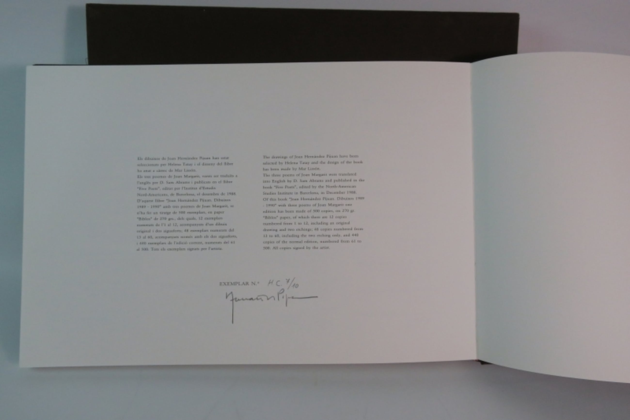 Luxe editie: Gesigneerd boek met tekeningen van Hernandez uit de periode 1989-1990 en drie gedichten van Joan Margarit + twee mooie etsen van Juan Pijuan Hernandez in bijbehorende kaft!