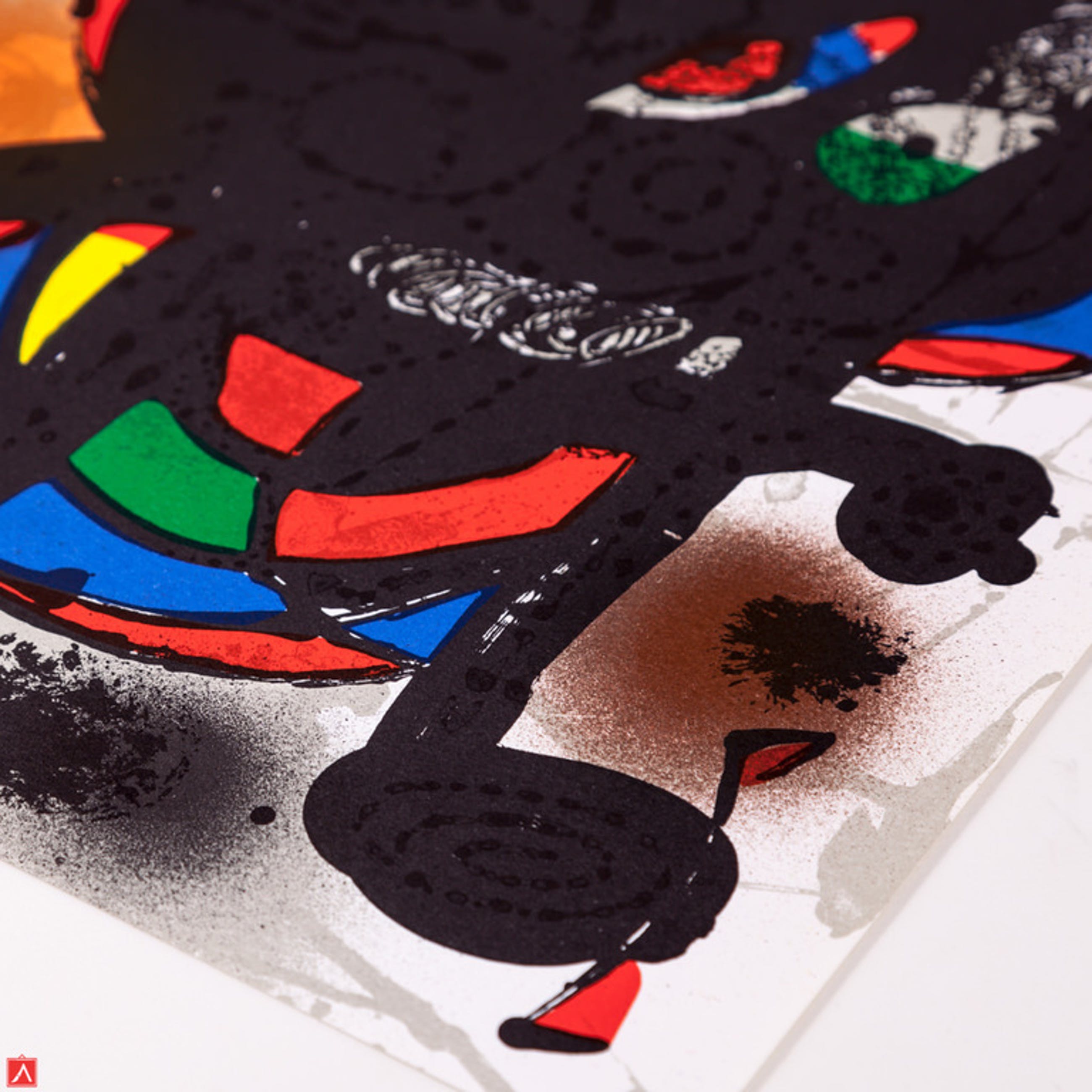 Sprekende en gedurfde originele lithografie van wereldberoemd surrealist Joan Miró. De litho is afkomstig uit de geautoriseerde oeuvre-catalogus van de lithografieën van Miro, 'Litografo Volume III', Spaanse uitgave, 1977.