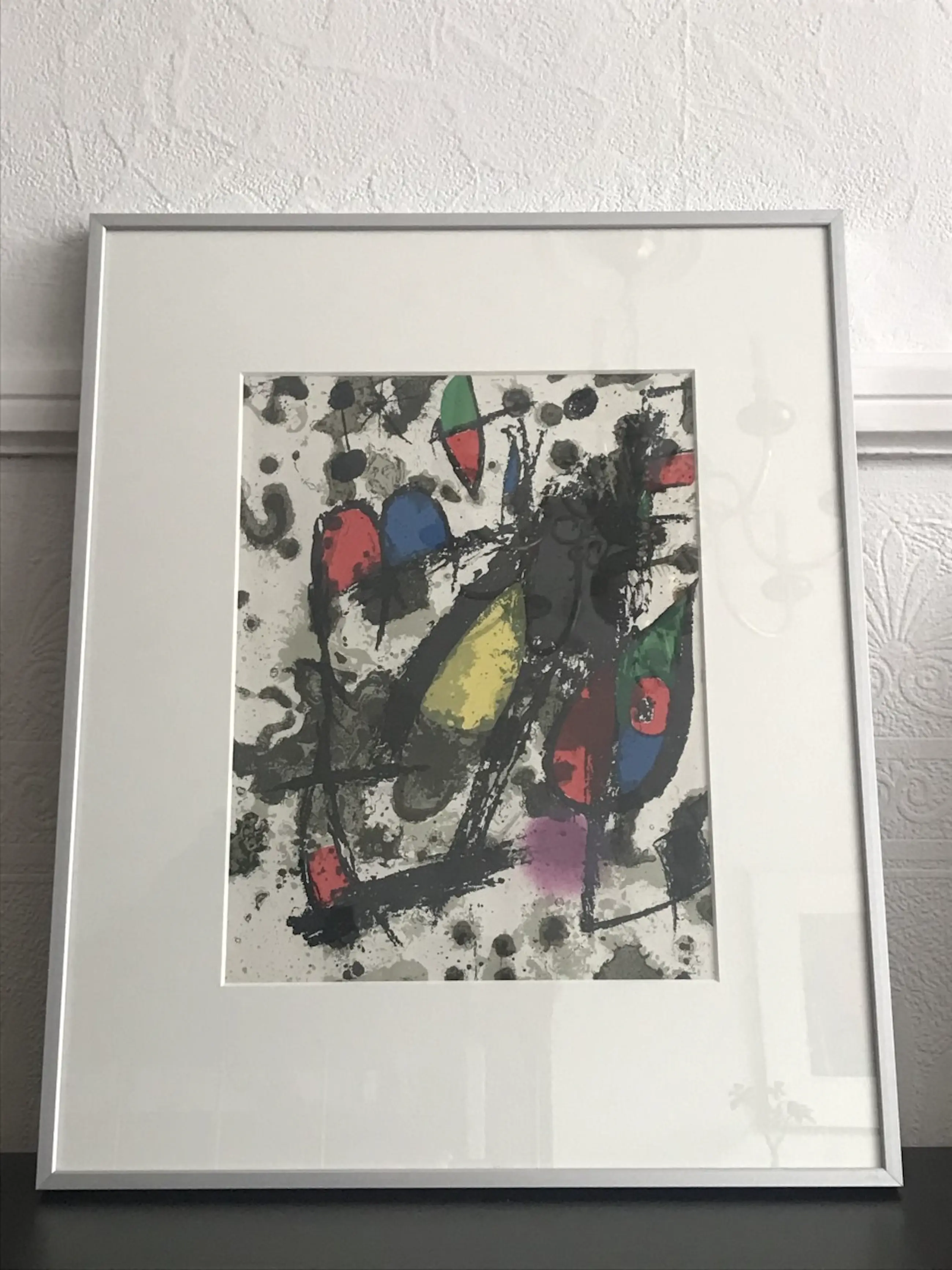 Lithografie van Joan Miro uit 1975. Afkomstig uit Miro Lithographe II. Uitgegeven door Maeght in Parijs. Ingelijst met passe-partout.
