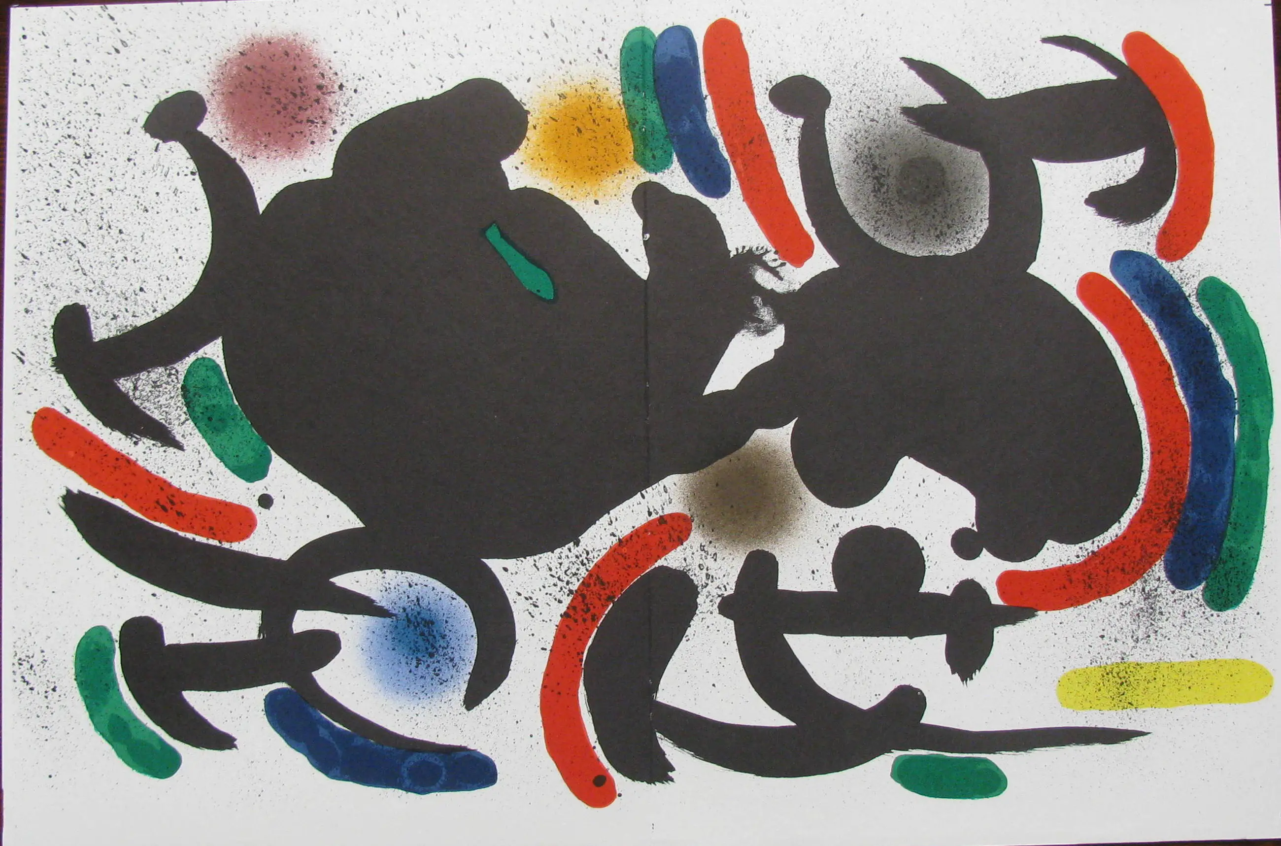 Deze litho is afkomstig uit de geautoriseerde oeuvre-catalogus van de litho's van Miró: Litografo Volume I uit 1972. Het portfolio bestond in totaal uit zes enkele pagina's en vijf dubbele pagina's. Hier bied ik één van de vijf dubbele bladen aan: een kleurrijke lithografie, op Guarro Bütten, met middenvouw zoals oorspronkelijk verschenen. Op de achterkant staat de typografische identificatie: Litografia original VII.