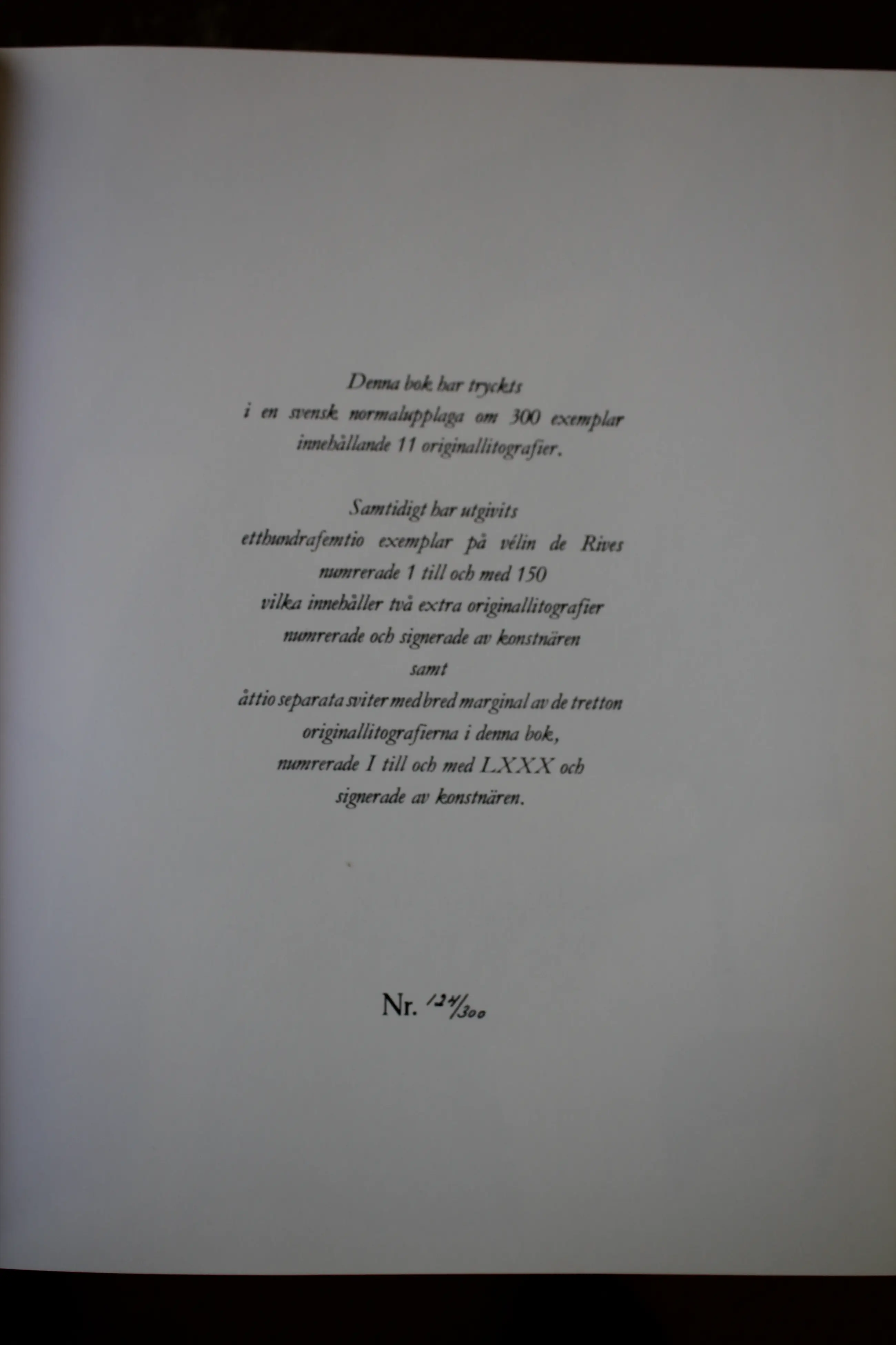 Deze uitgave is deel 2 uit een Zweedse serie van 6 delen van het complete lithografische werk van Joan Miro. Deel 2 behandeld de jaren 1953 - 1963 uit het produktieve leven van deze kunstenaar. Uitgave is uitgegeven in 1975 en is genummerd 124/ 300. In het boek bevinden zich 11 originele lithos. Uitgeverij: Galerie Börjeson AB, Malmö, 254 pagina's. Taal: Zweeds. Auteur van het voorwoord: Raymond Queneau