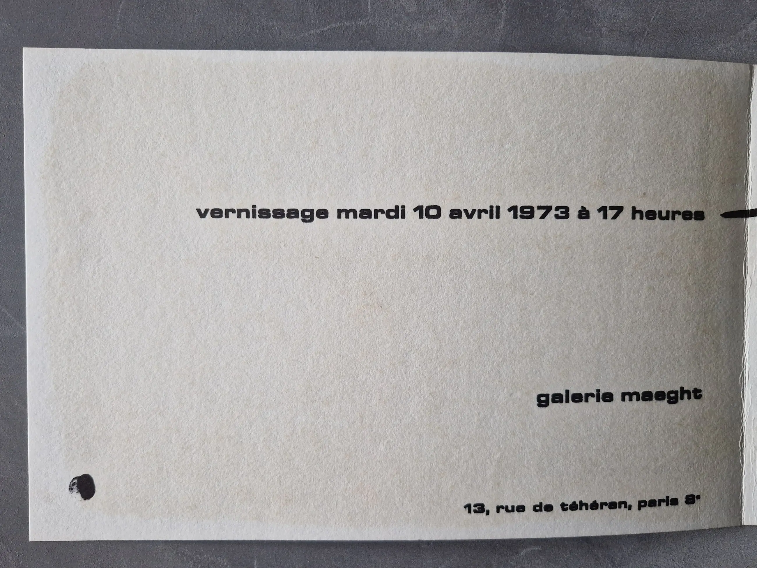 Carton d'invitation au vernissage de l'exposition du mardi 10 avril 1973 avec des illustrations en lithographies couleur, dont une en double page // Invitation to the opening of the exhibition of Tuesday, April 10, 1973 with illustrations in color lithographs with one in double page.